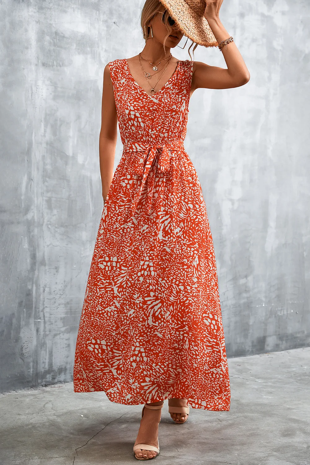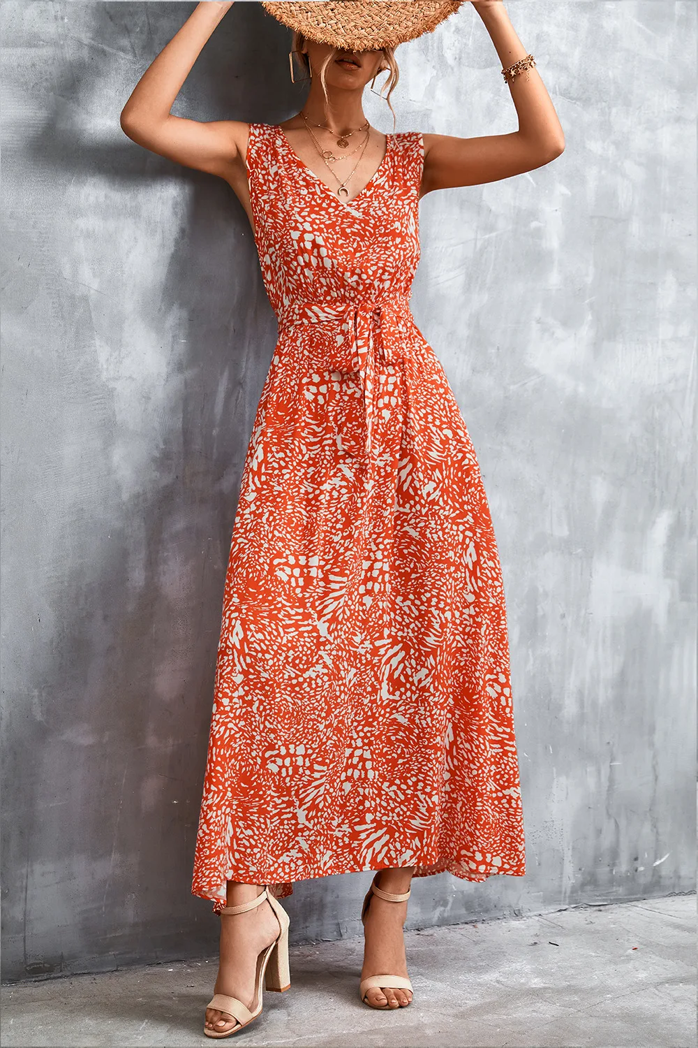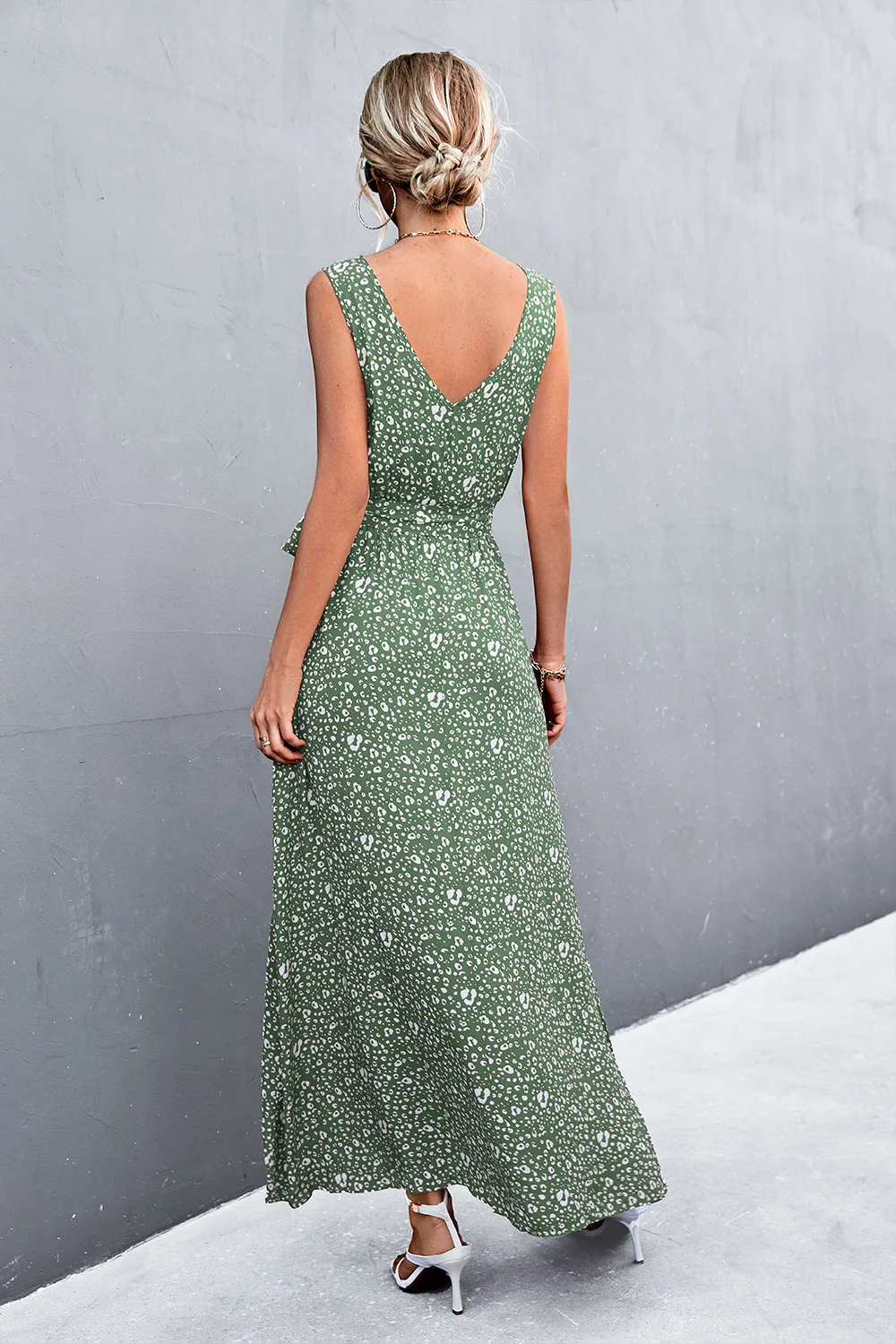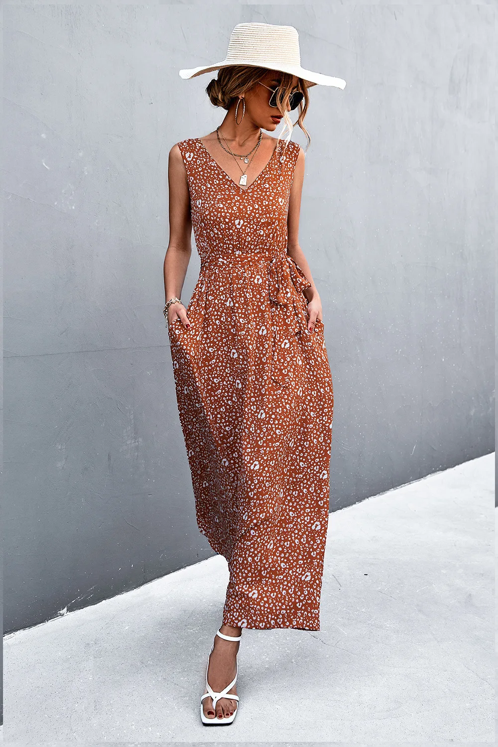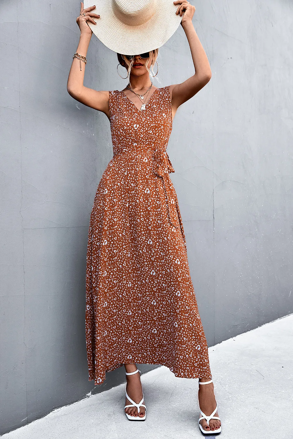 Women Leopard Print Sleeveless Beach Bohemian Maxi Dress Ladies V-neck Belt Boho Sundress Vestidos Fahion Big Swing Maxi Dresses