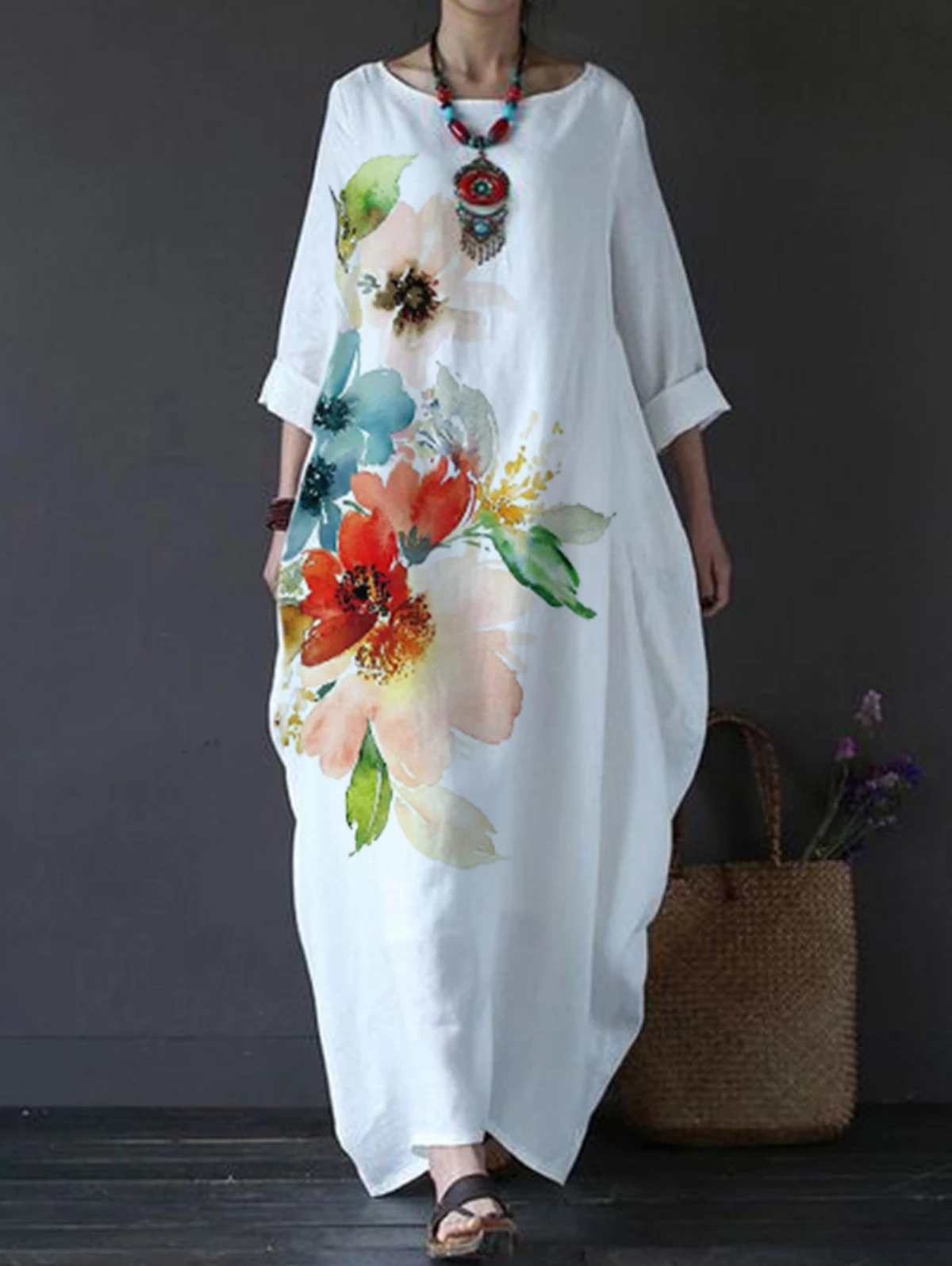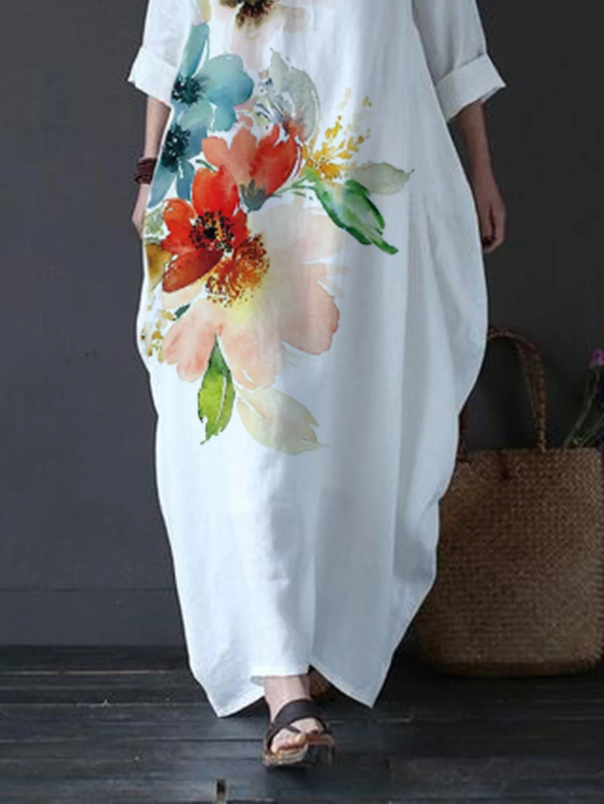 Women Long Maxi Dresses Plus Size White Floral Print Large Loose Cotton Linen Dress Summer New Straight Vestidos Female