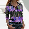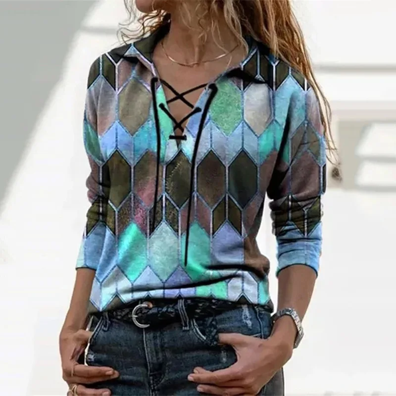 Women Loose Blouse Autumn Fashion Lace-Up V Neck Long Sleeve Pullover Ladies Office Shirts Vintage Plaid Print Casual Loose Tops
