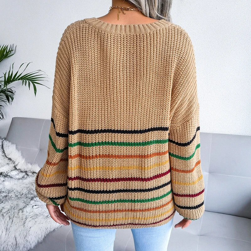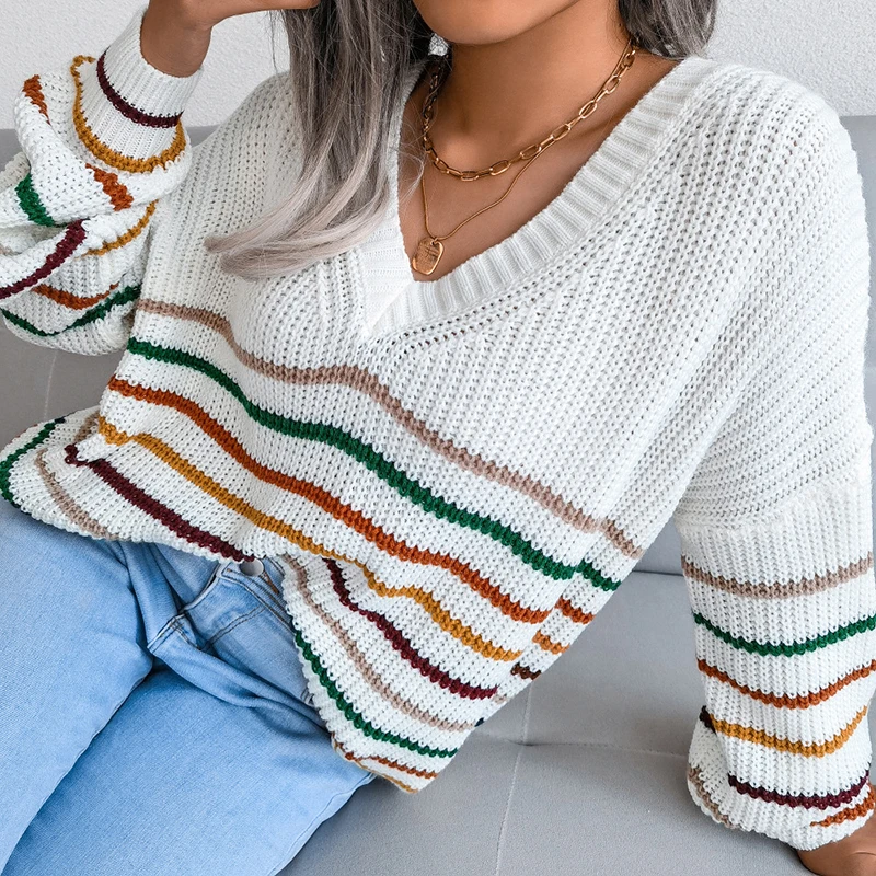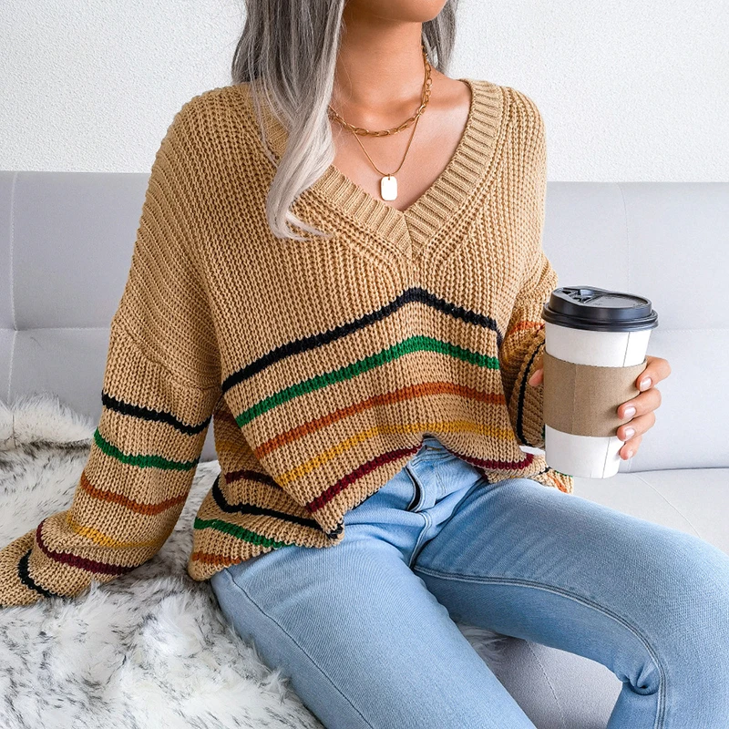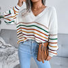 Women Loose Knitted Sweater Autumn Fashion V Neck Long-sleeved Pullover Ladies Blouse Vintage printed Elegant Casual Female Tops