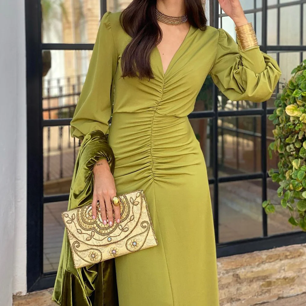 Women Maxi Dresses Sexy V Neck High Waist Slim Pleated Dress Elegant Temperament Fall Spring Long Sleeve Office Ladies Dress