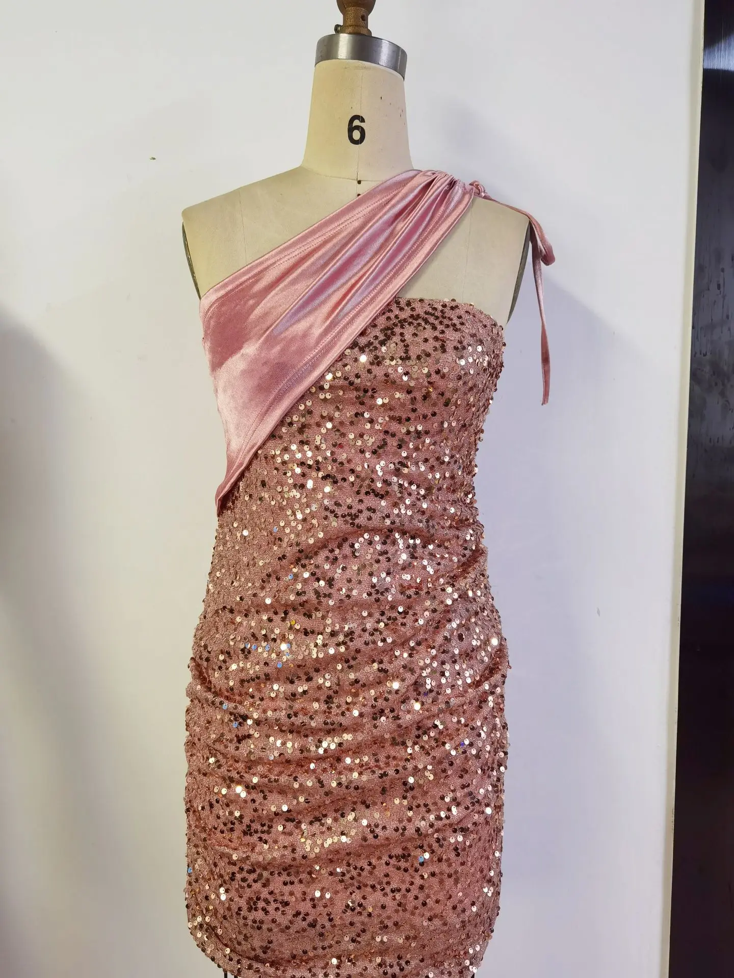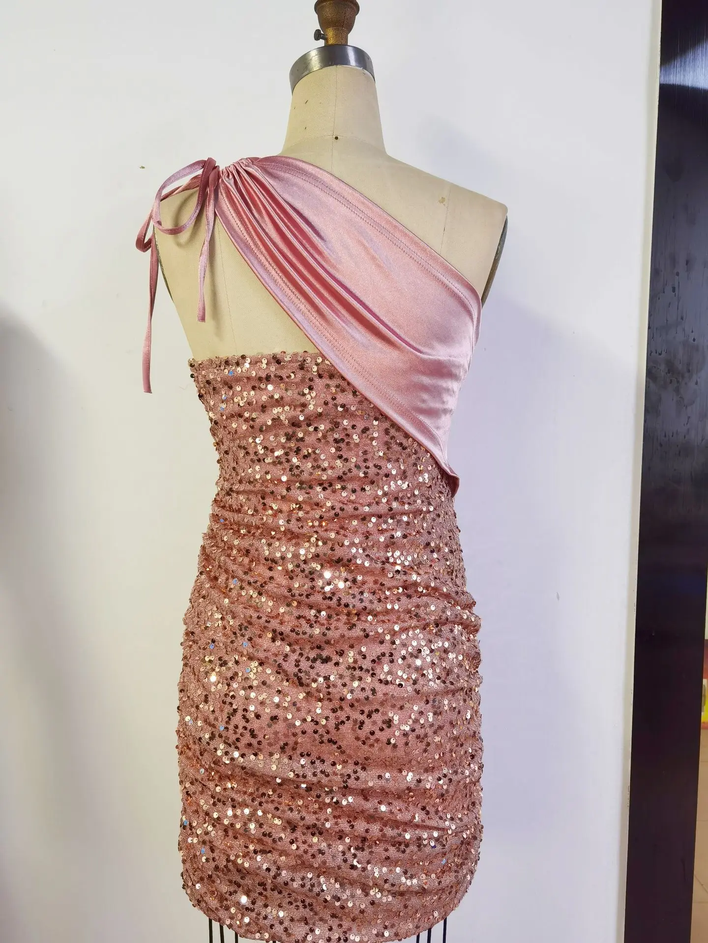 Women Mini Bodycon Dress Sequins Tie-Up Oblique Shoulder Sleeveless Wrapped Hip Dress Evening Party Club Skinny Dress