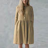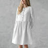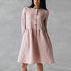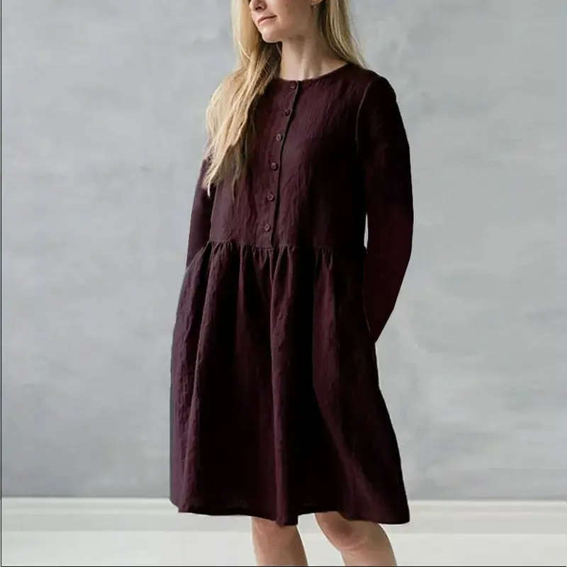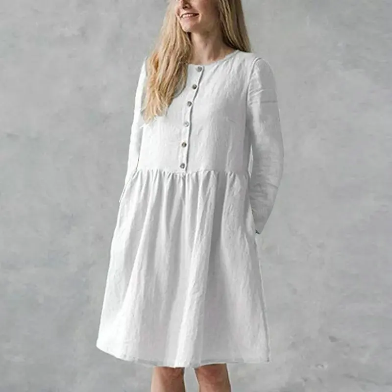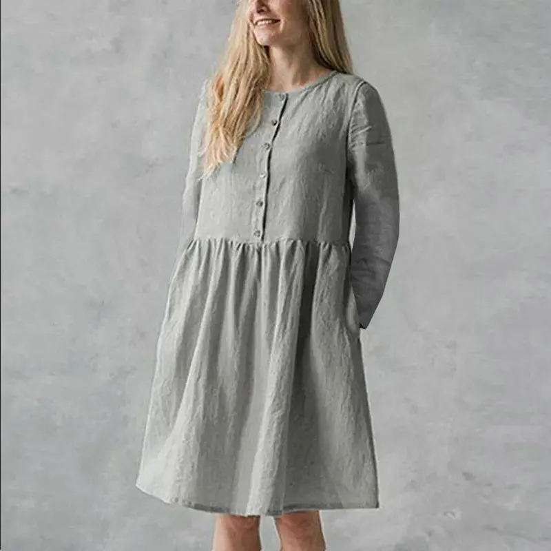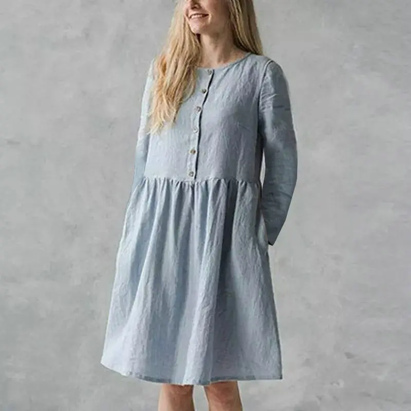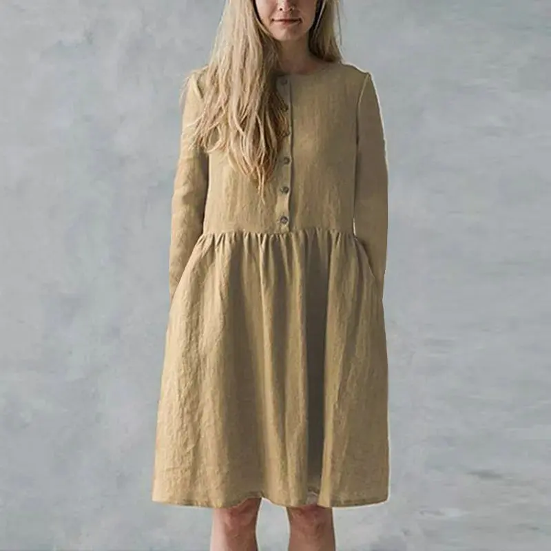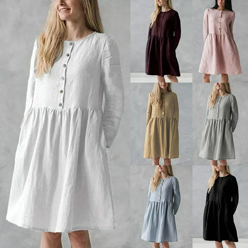 Women New Spring Summer Fashion Casual Solid Round Neck Pocket Button Long Sleeve Cotton Linen Dress Breathable Female Clothing