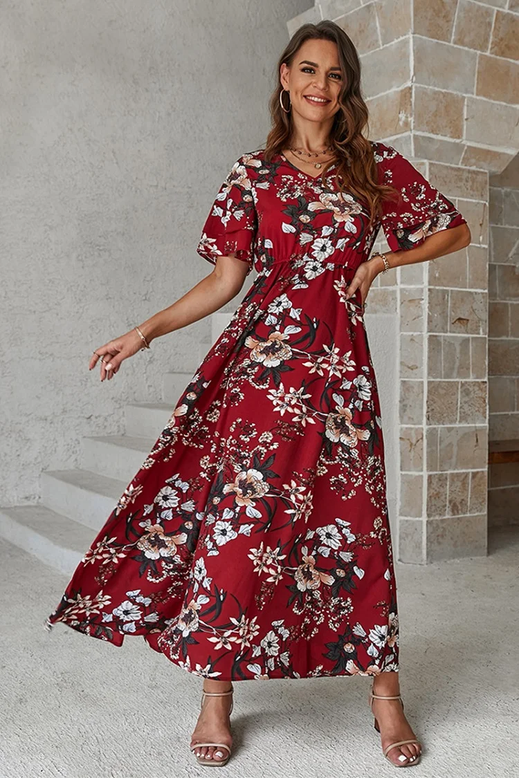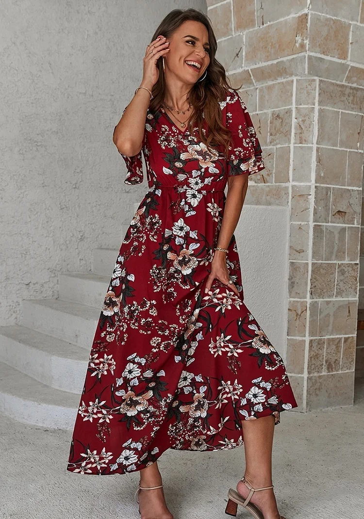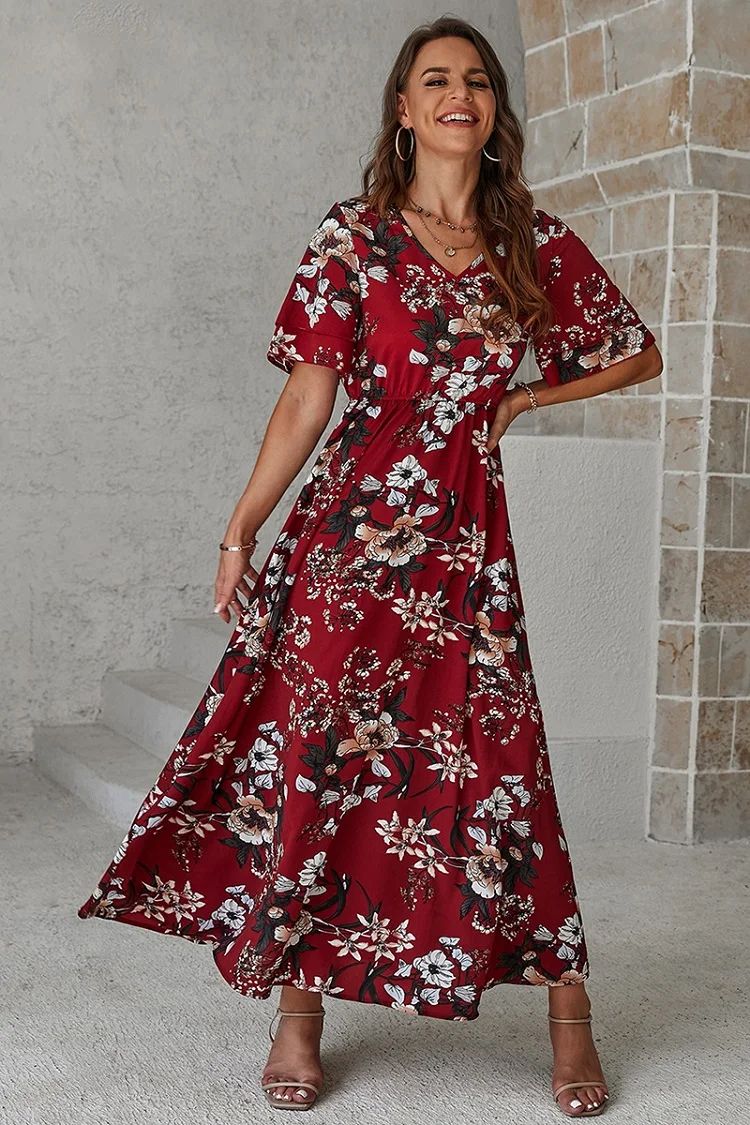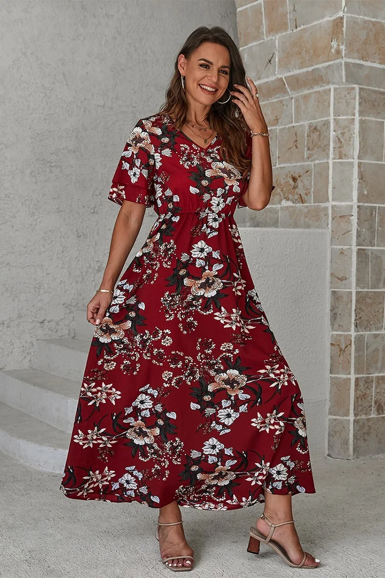 Women New Summer European American Printed V-Neck Short Sleeve Temperament Slim Ankle Length A-line Long Dresses Female Clothing