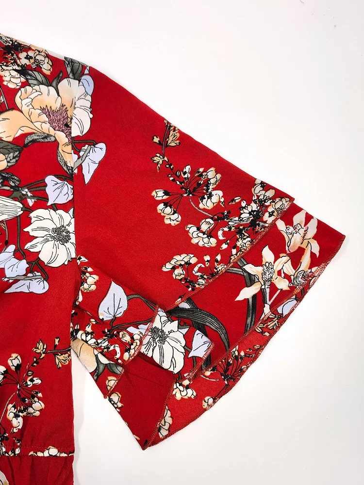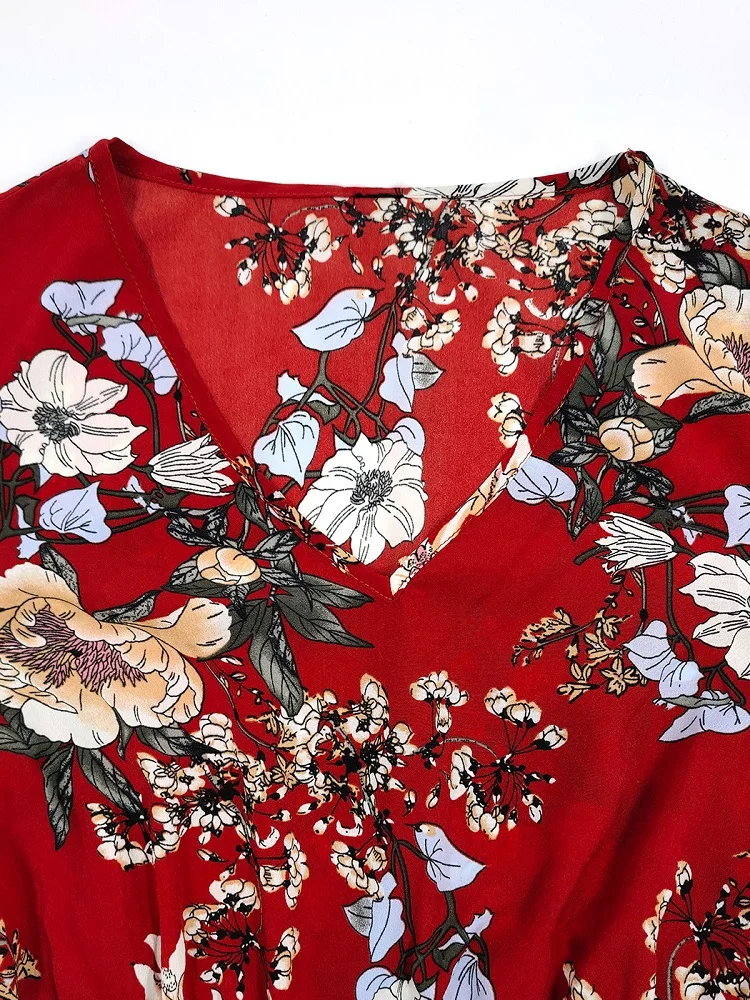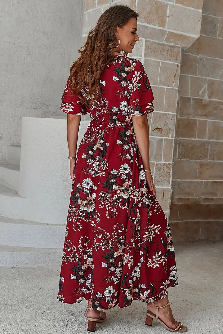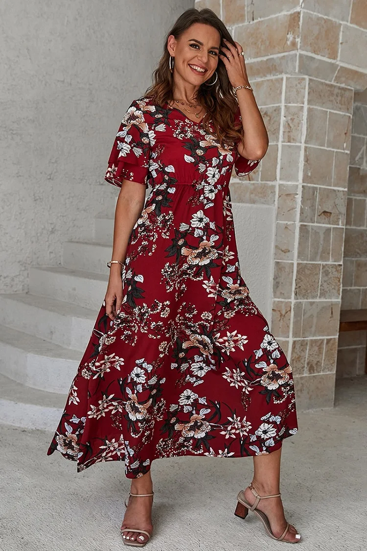Women New Summer European American Printed V-Neck Short Sleeve Temperament Slim Ankle Length A-line Long Dresses Female Clothing