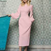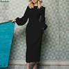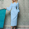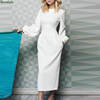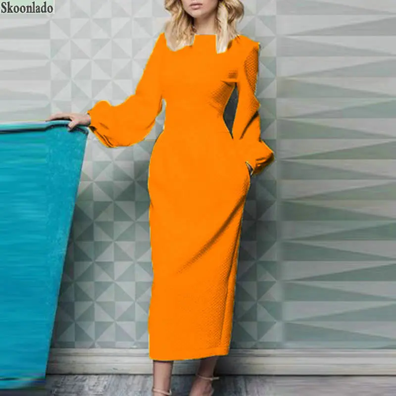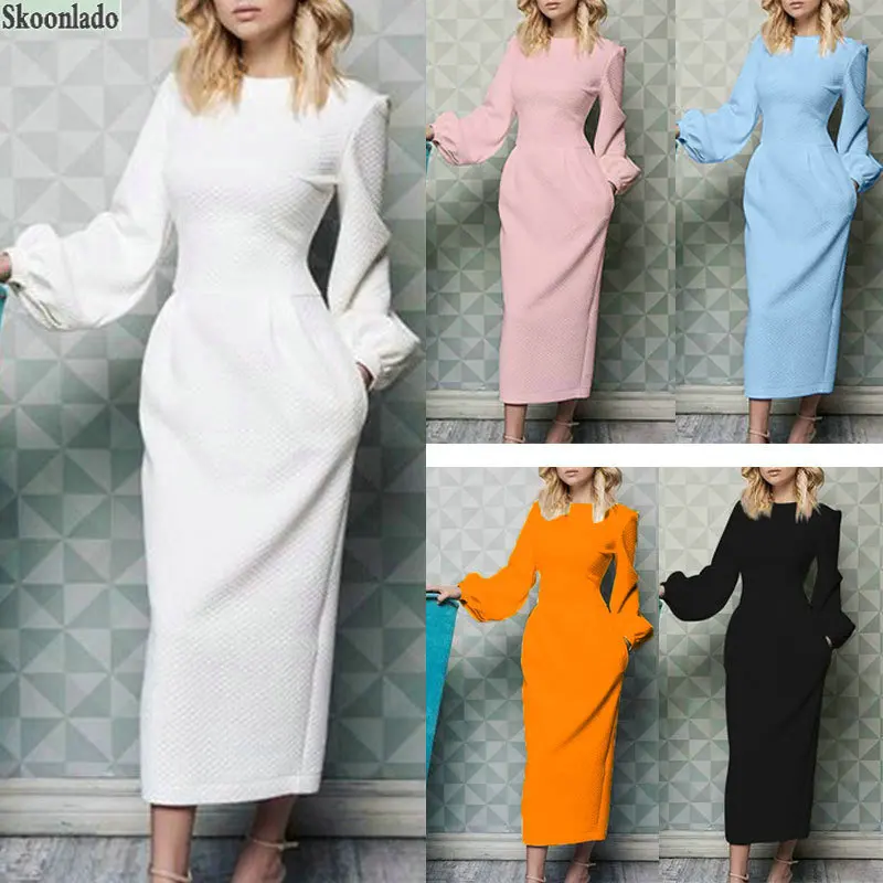 Women Newest Spring Autumn Lantern Sleeve Dress Solid Color Round Neck Waist Good Quality Elagant Famous Design Formal Clothes