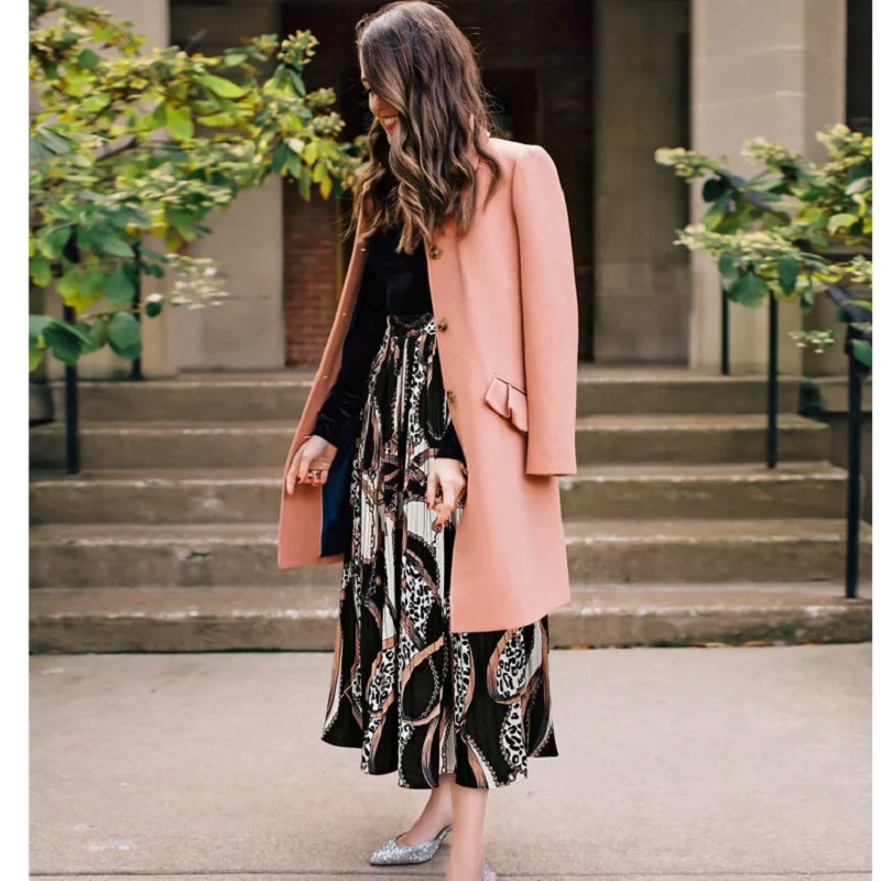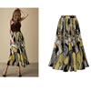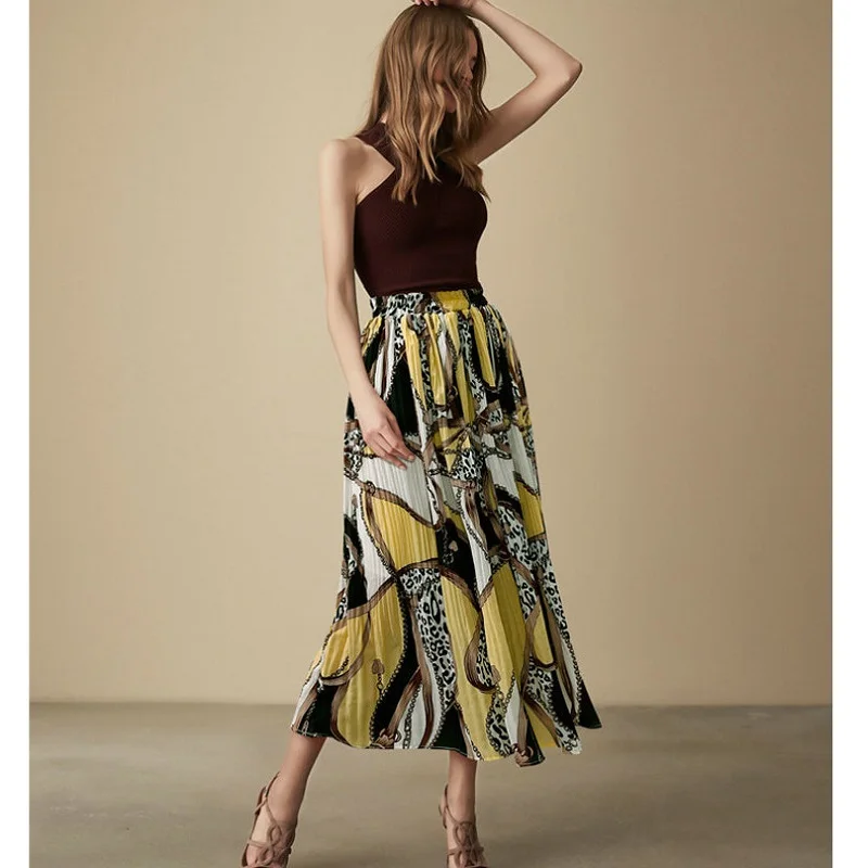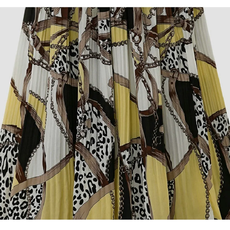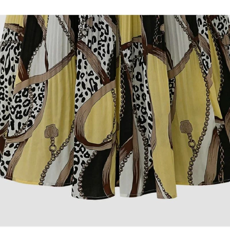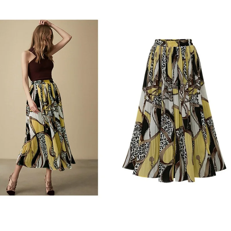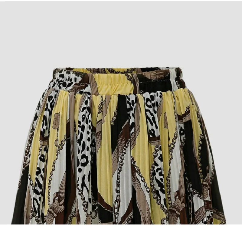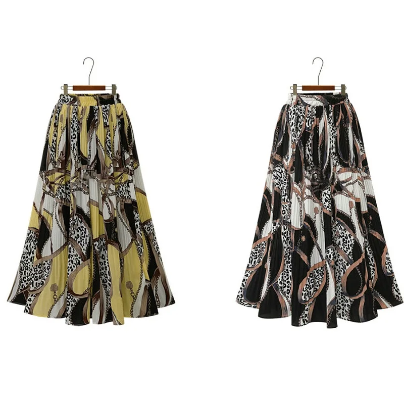 Women Newest Summer European American Fashion Elegant Office Lady Chiffon Pleated Half Medium Length Skirt Printed Large Hem Dre