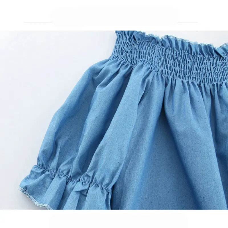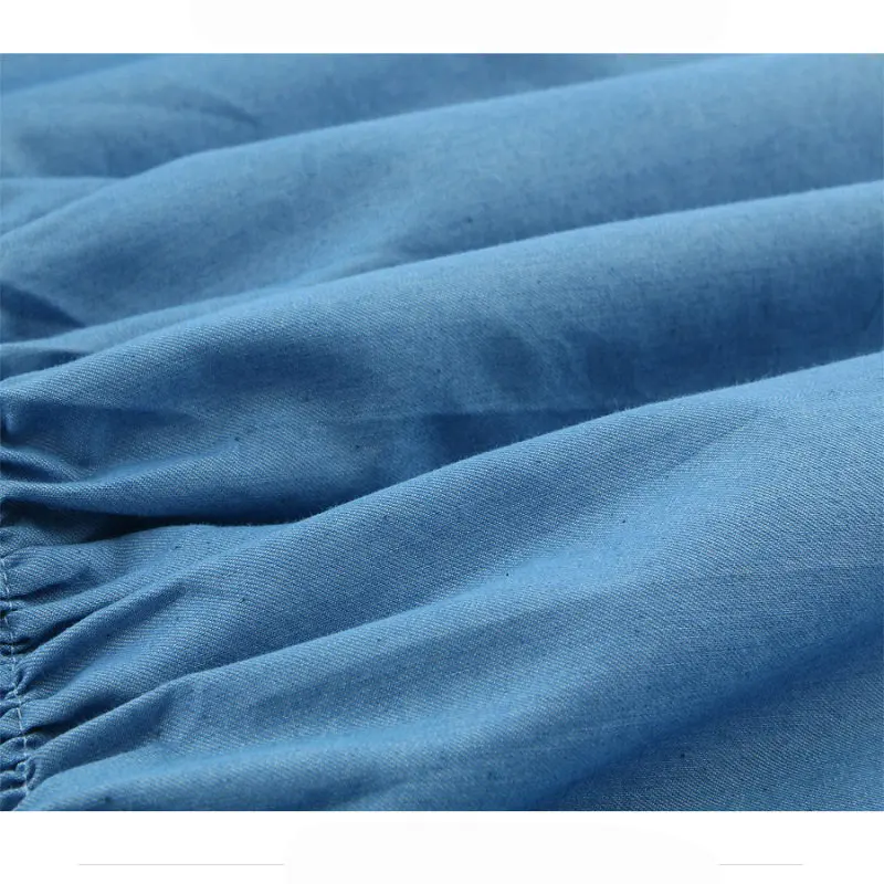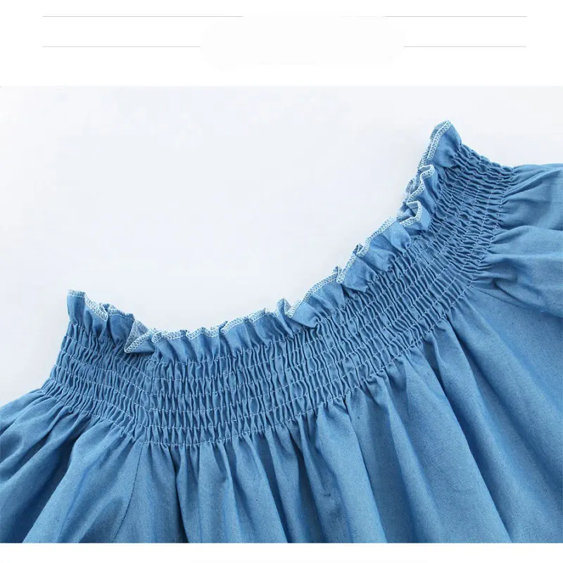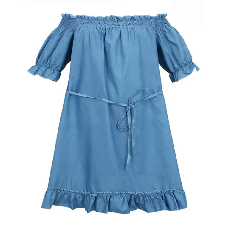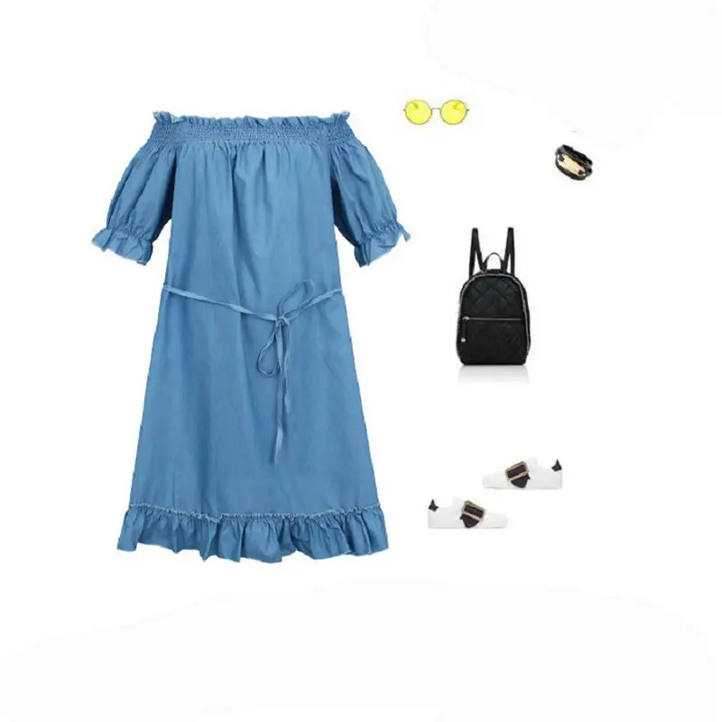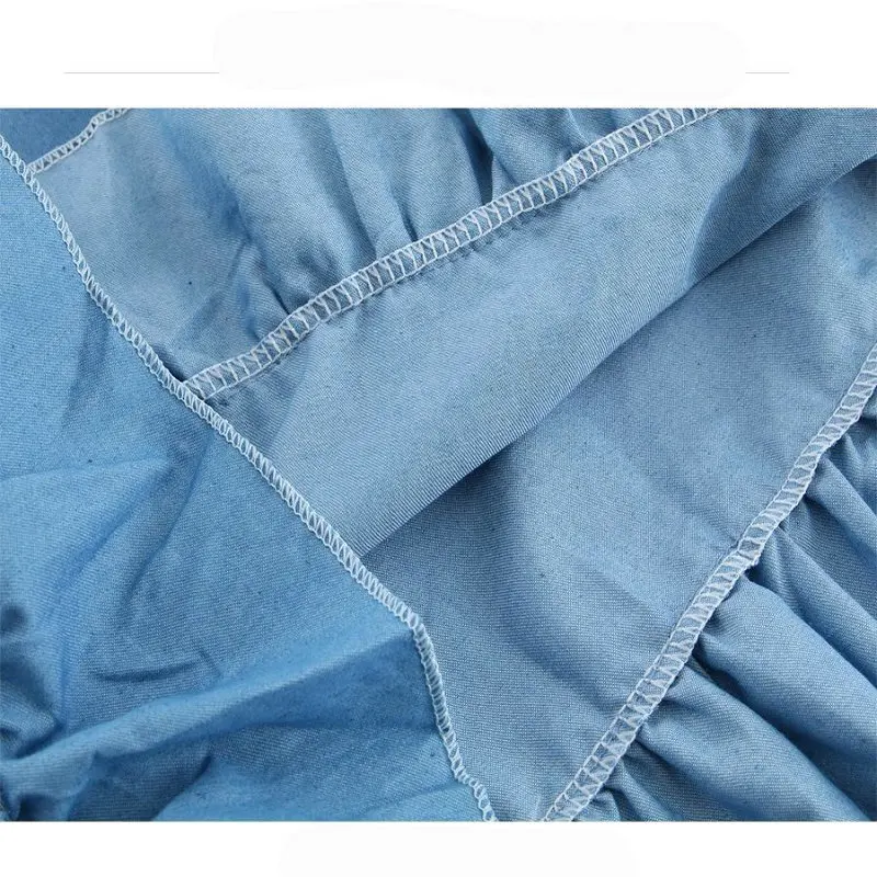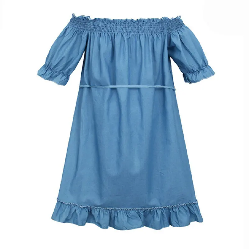 Women Newest Summer Solid Blue Casual Good Quality Denim Dress Lace Up Straight Neck Mid Sleeve Ruffle Waist Closing Skirt Femal