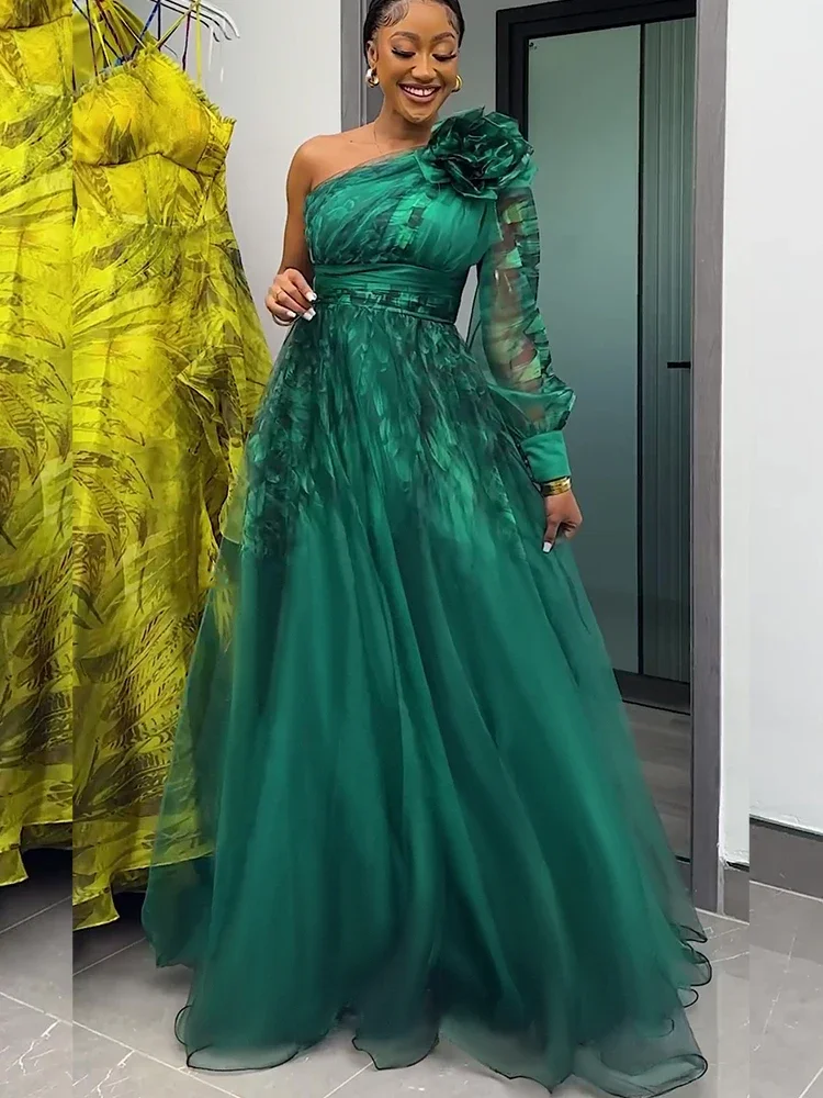 Women One Shoulder Sleeve Pleats Bridesmaid Dress Mesh Floral High Waist Dress Fashion Elegant Part Club Sexy Evening Long Dress
