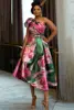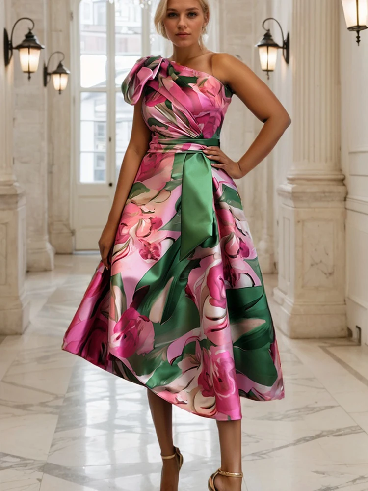 Women Plus Size Flroal Printed Dress One Shoulder Irregular Hem Pleated A-Line Vintage Casual Elegant Summer Midi Dresses 2025