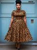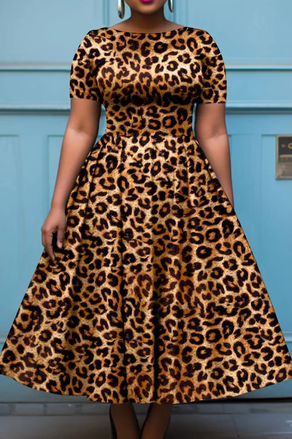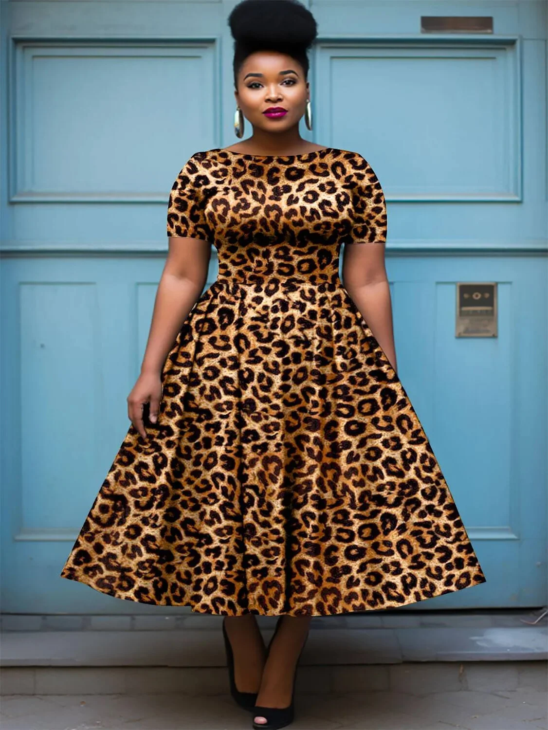 Women Plus Size Leopard Printed Dress Round Neck Short Sleeve A-Line Pleated Elegant Vintage High Street Evening Dresses 2025