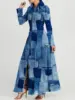 Women ‘s Shirt Collar Long Dresses Denim Patchwork Raw Edge Zipper Long Sleeve Maxi Dress Temperament Female Slim Coat Dress