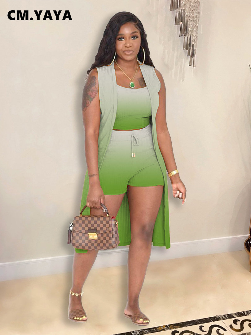 CM.YAYA Streetwear Knit Gradient Women 2 Piece Set Outfits Sleeveless Clock Top + Tank + Shorts Set 2023 Yoga Fitness Tracksuit