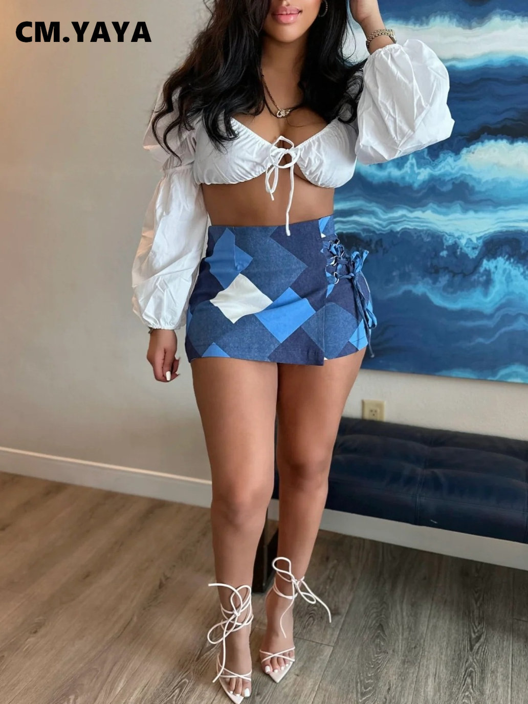 CM.YAYA Fashion Women 2 Piece Set Outfits Fashion Lantern Long Sleeve Crop Blouse and Lace Up Plaid Skirt Shorts 2023 Tracksuit