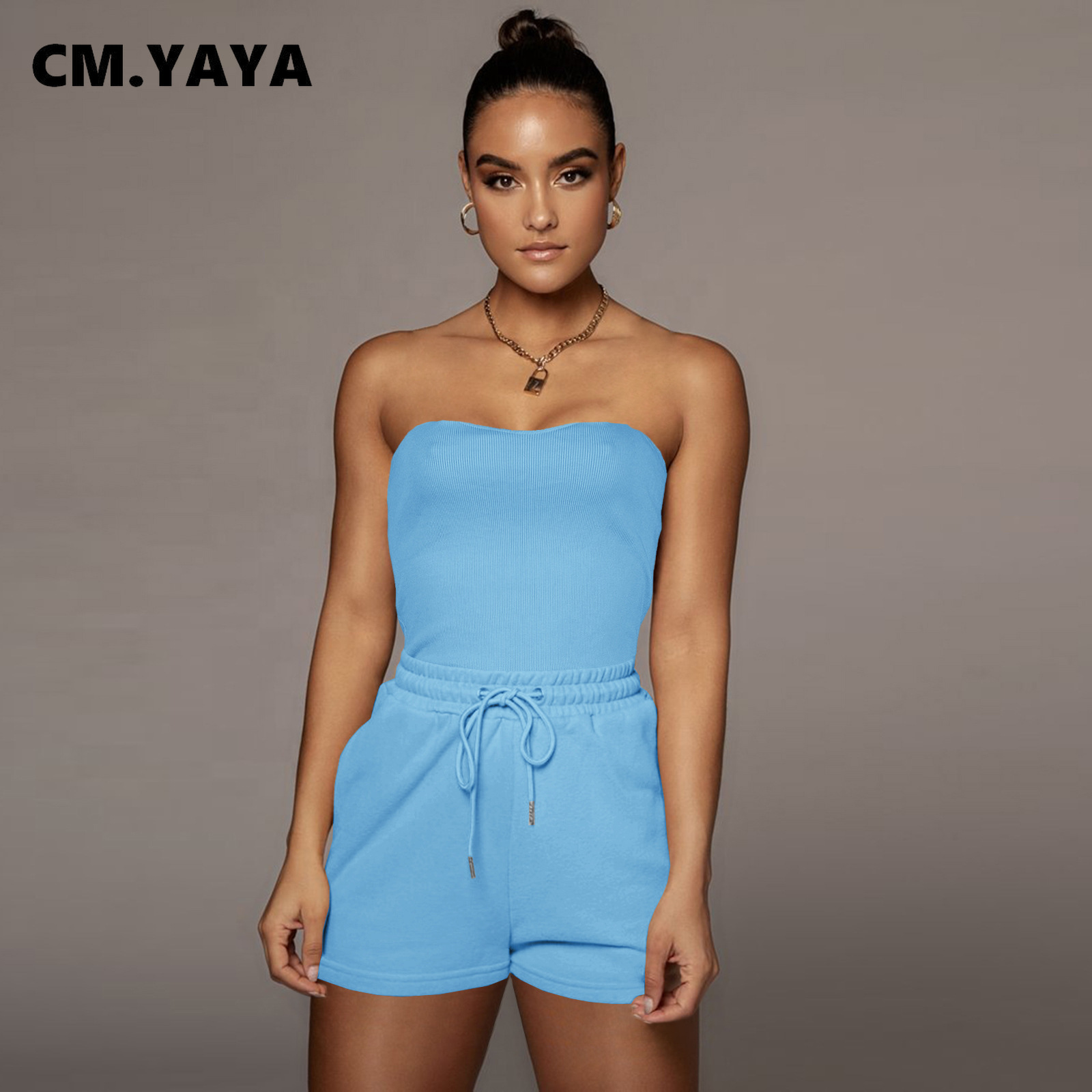 CM.YAYA Active Ribbed Women’s Set Strapless Bodysuit and Shorts Knitted Yoga Set 2022 Tracksuit Two 2 Piece Set Fitness Outfits