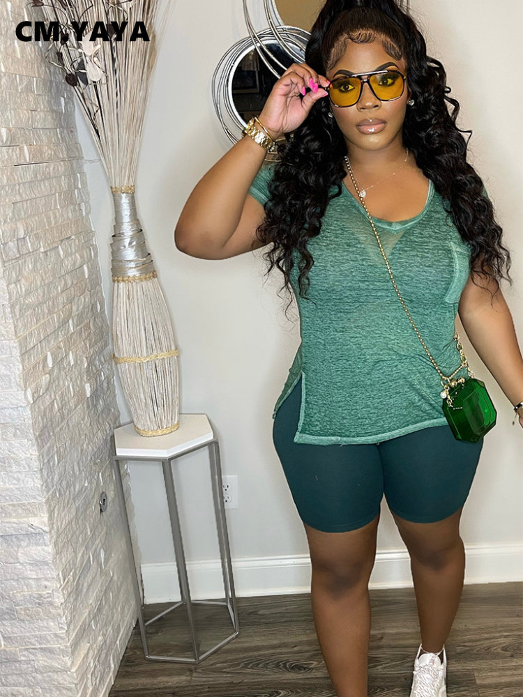 CM.YAYA Street Elastic Women’s Set Tie Up Open Side T-shirt and Shorts Suit 2023 Summer Active Two 2 Piece Set Outfit Tracksuit