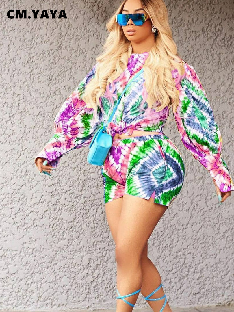 CM.YAYA Tie Dye Black Hole Women’s Set Lantern Long Sleeve Shirt and Shorts 2023 Summer Chic Two 2 Piece Set Outfits Tracksuit