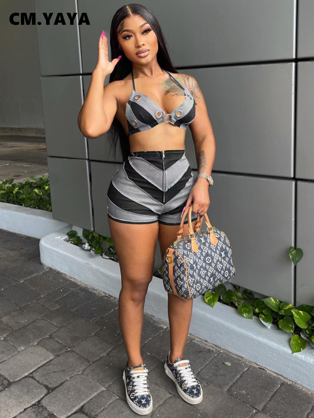 CM.YAYA Denim Women’s Set Halter Bra Crop Top and Pocket Front Jeans Shorts 2023 Summer Chic Two 2 Piece Set Outfit Tracksuit