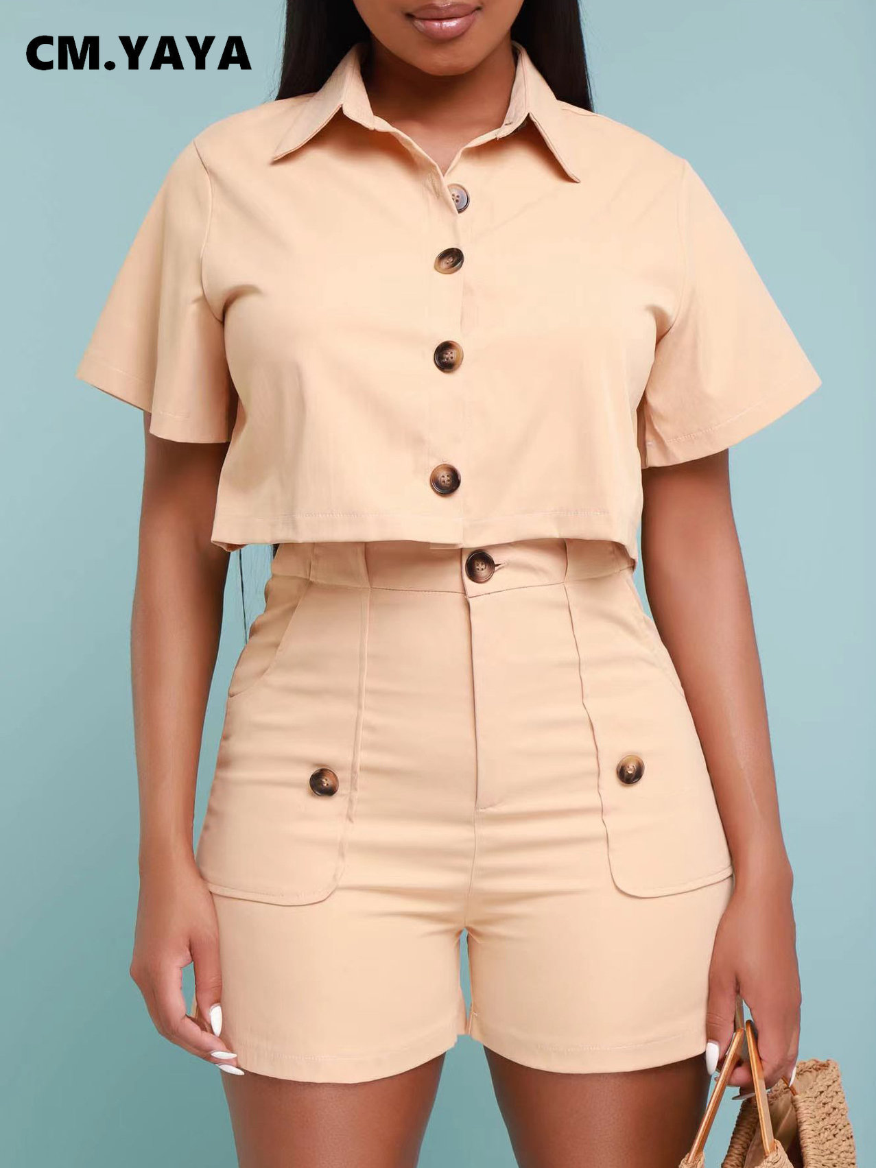 CM.YAYA Fashion Women’s Set Short Sleeve Shirt and Pocket Shorts 2023 Summer Streetwear Chic Two 2 Piece Set Outfits Tracksuit
