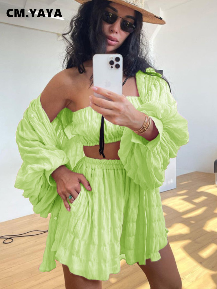 CM.YAYA Chic Women’s Set Long Sleeve Shirt Strapless Crop Top and Flare Shorts 2023 Fashion Summer 3-Piece Set Outfit Tracksuit