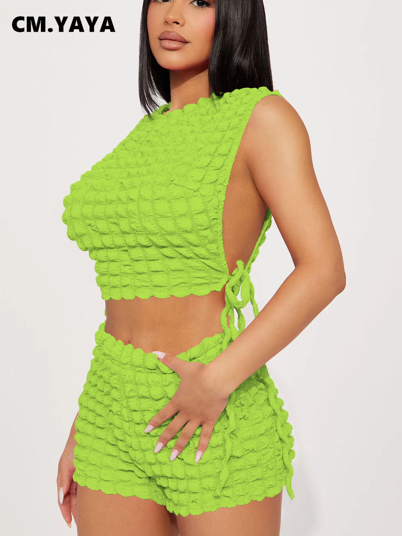 CM.YAYA Fashion Waffle Women 2 Piece Set Outfits Short Sleeve Shirt and Shorts Set 2023 INS Summer Yoga Fitness Acitve Tracksuit
