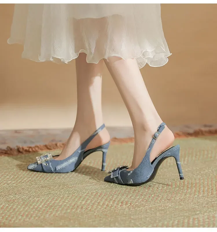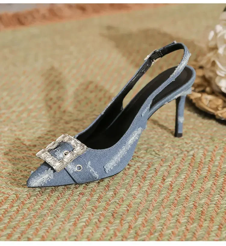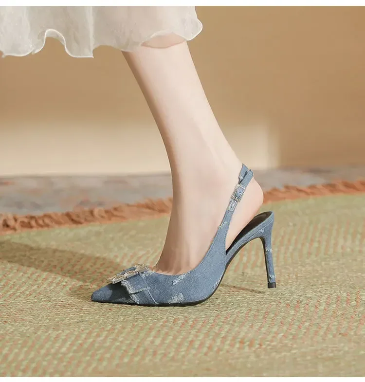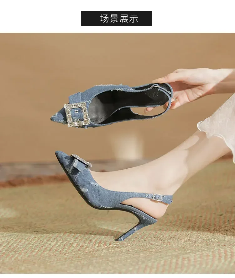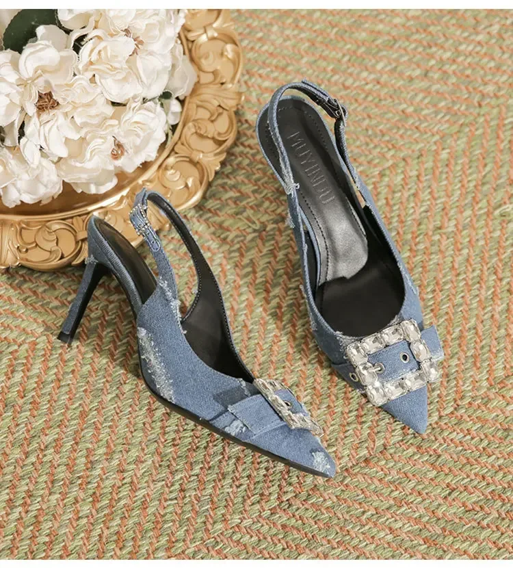 Women Sexy Blue Denim Rhinestone High Heels Summer Korean Fashion Sandals Pointed Toe Thin Heels Pumps Party Dress Casual Shoes
