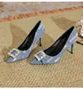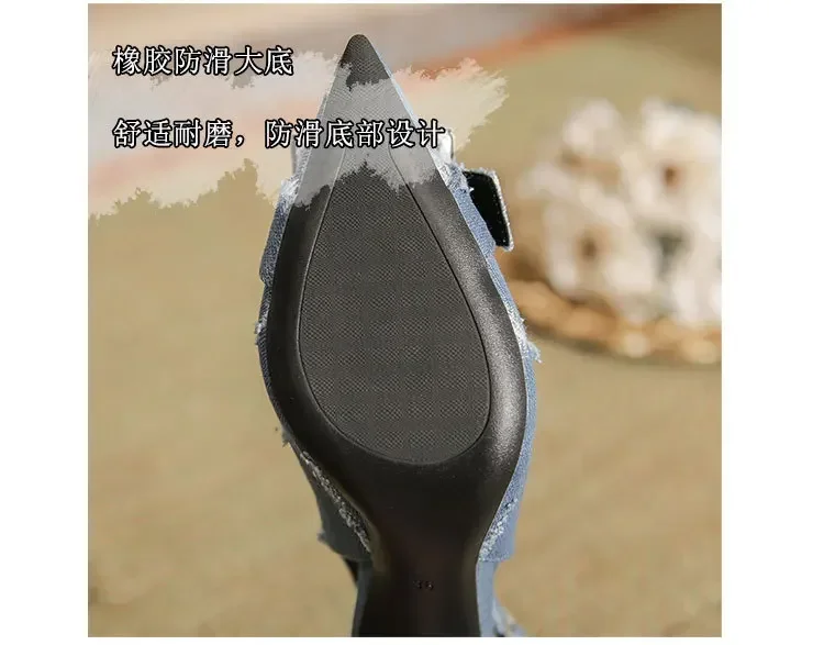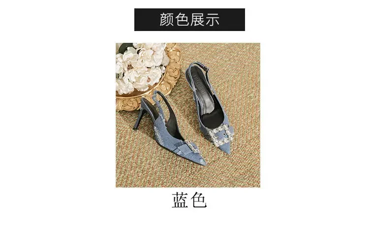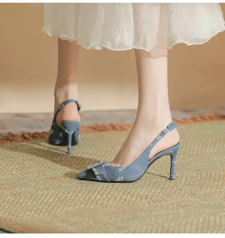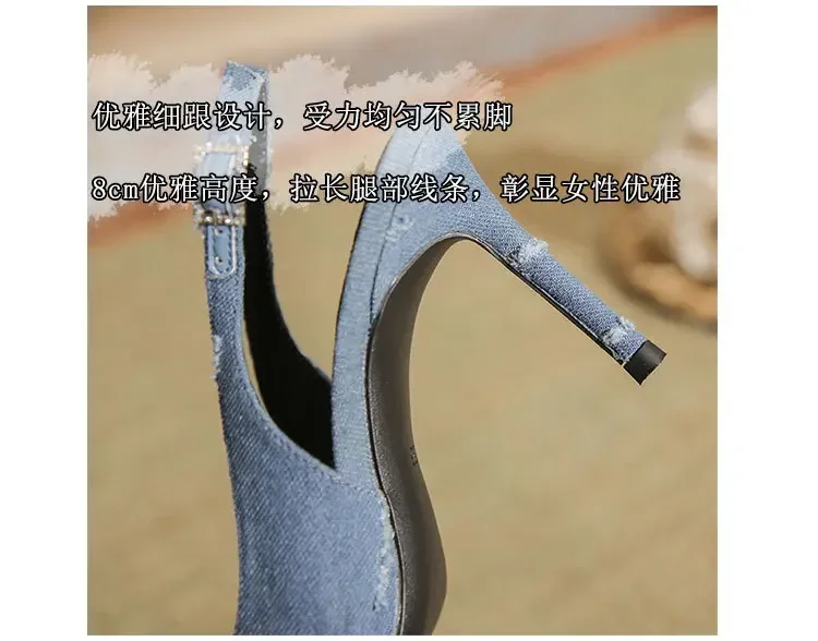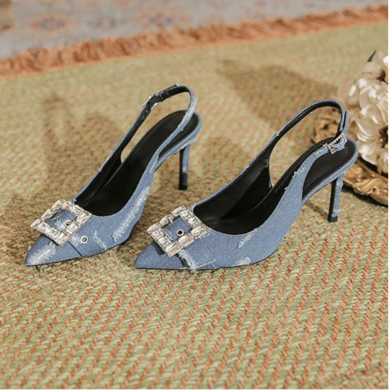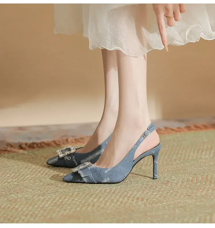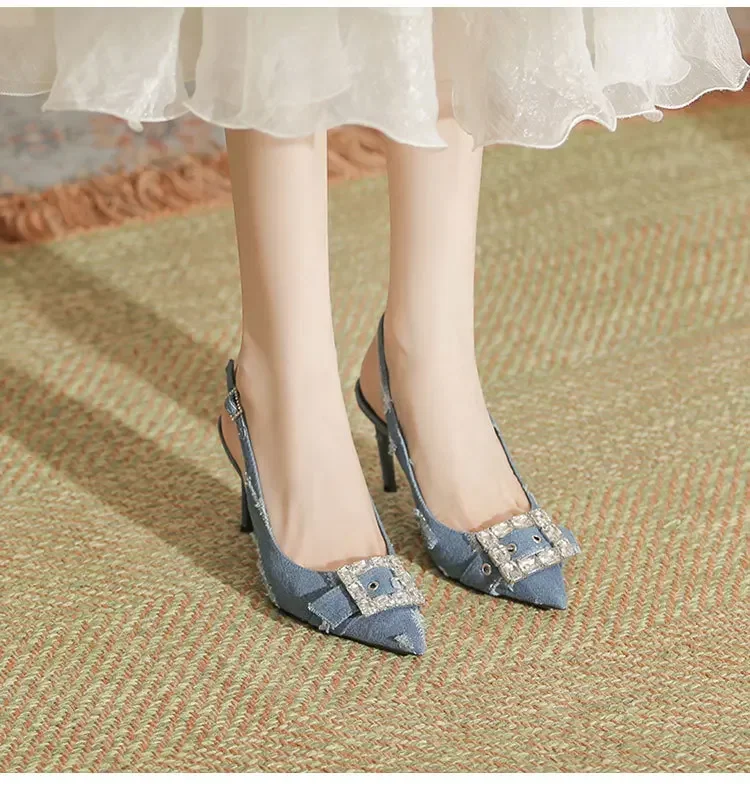 Women Sexy Blue Denim Rhinestone High Heels Summer Korean Fashion Sandals Pointed Toe Thin Heels Pumps Party Dress Casual Shoes