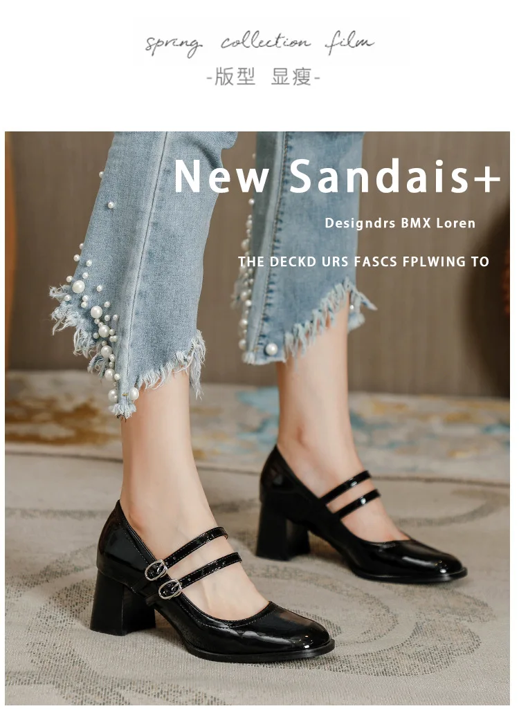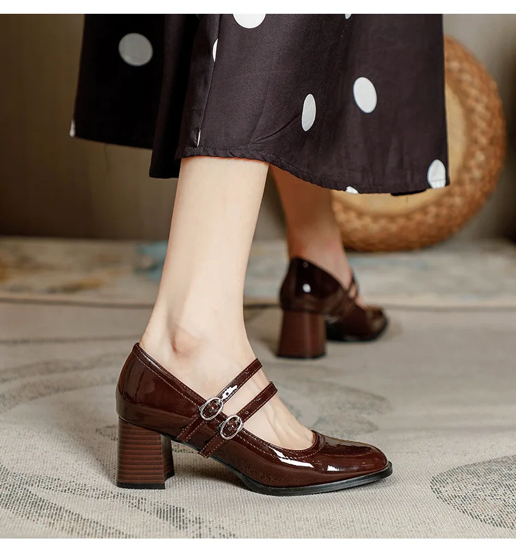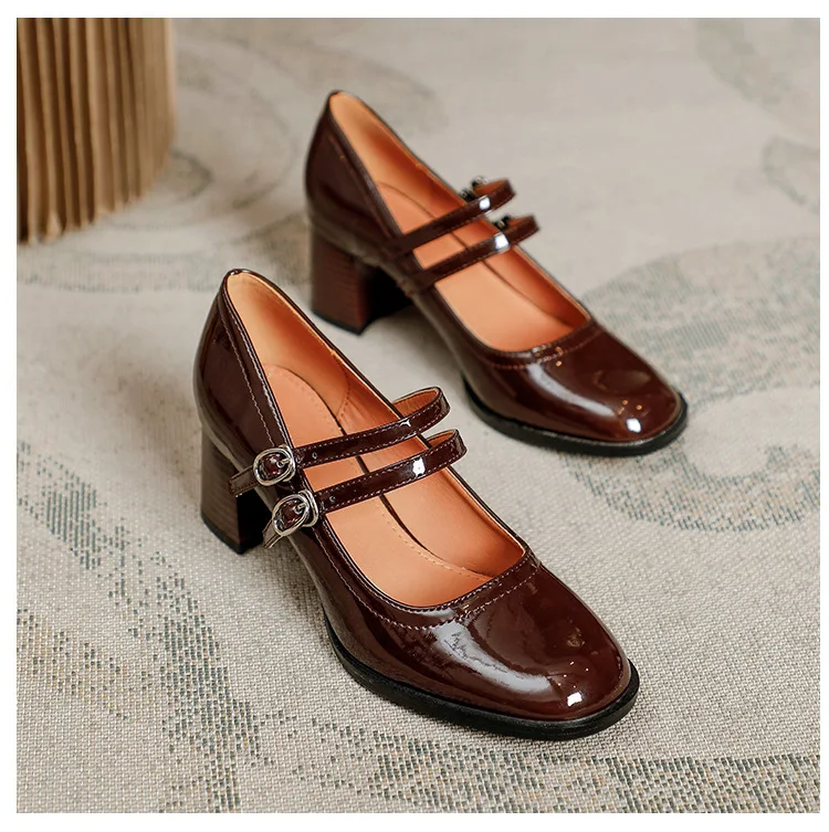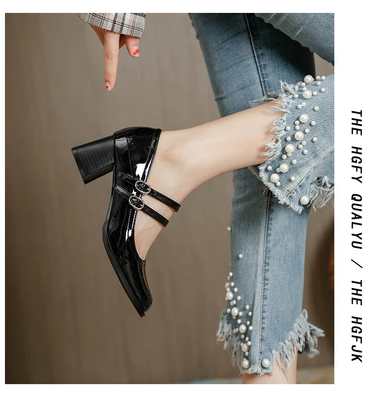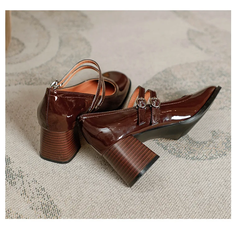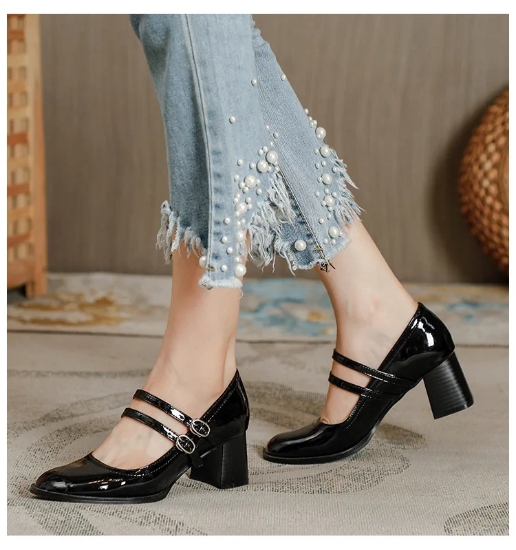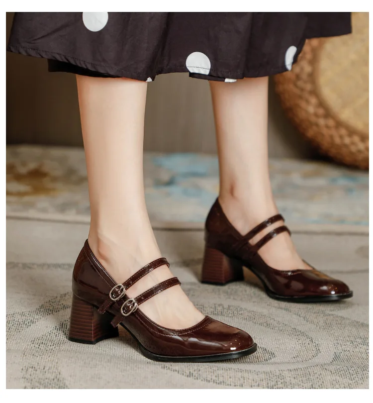 Women Shoes Concise Platform High-heeled Round Head Patent Leather Shoes Lady Retro Chunky Mid-Heel Casual Roman Shoes for Women
