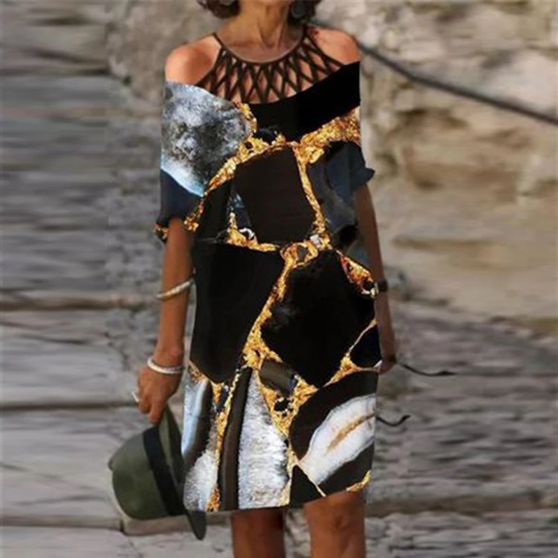 Women Short Sleeve Dress Fashion Retro Ladies Sexy Hollow Out O-neck Party Dress 2021 Summer Casual Loose Female Elegant Dress