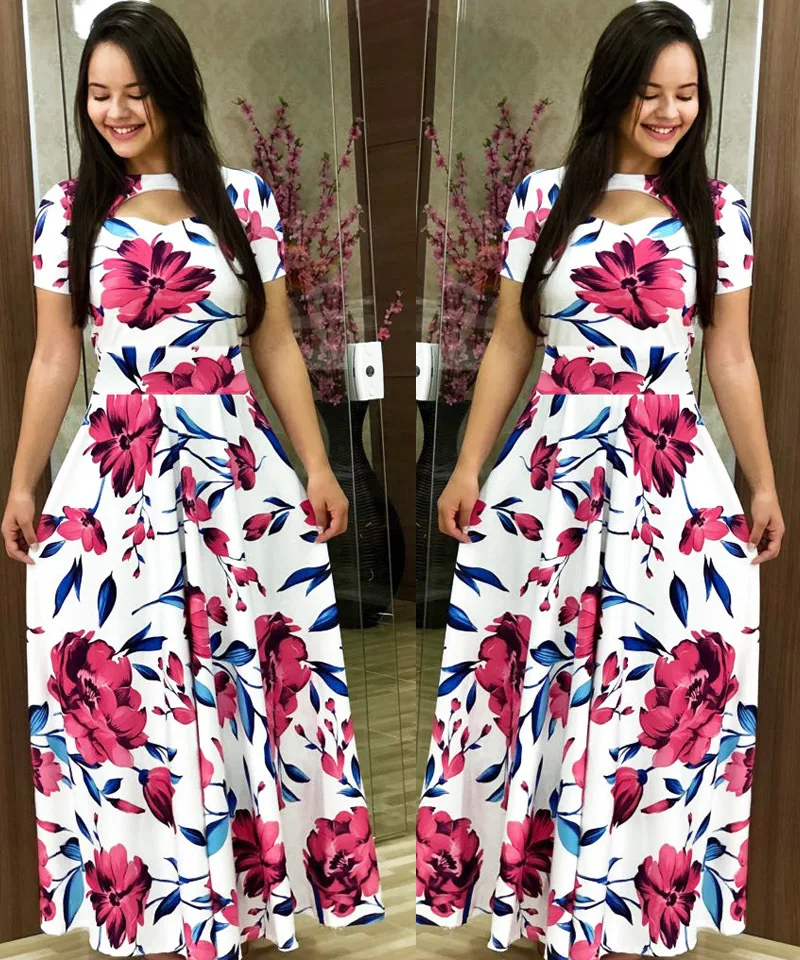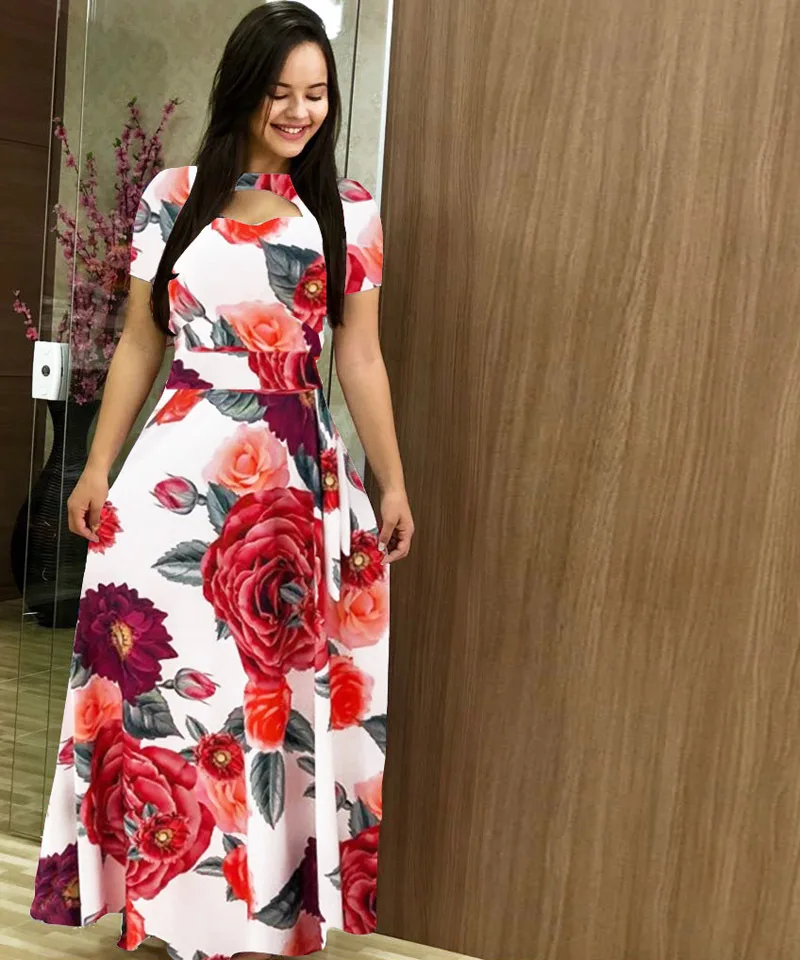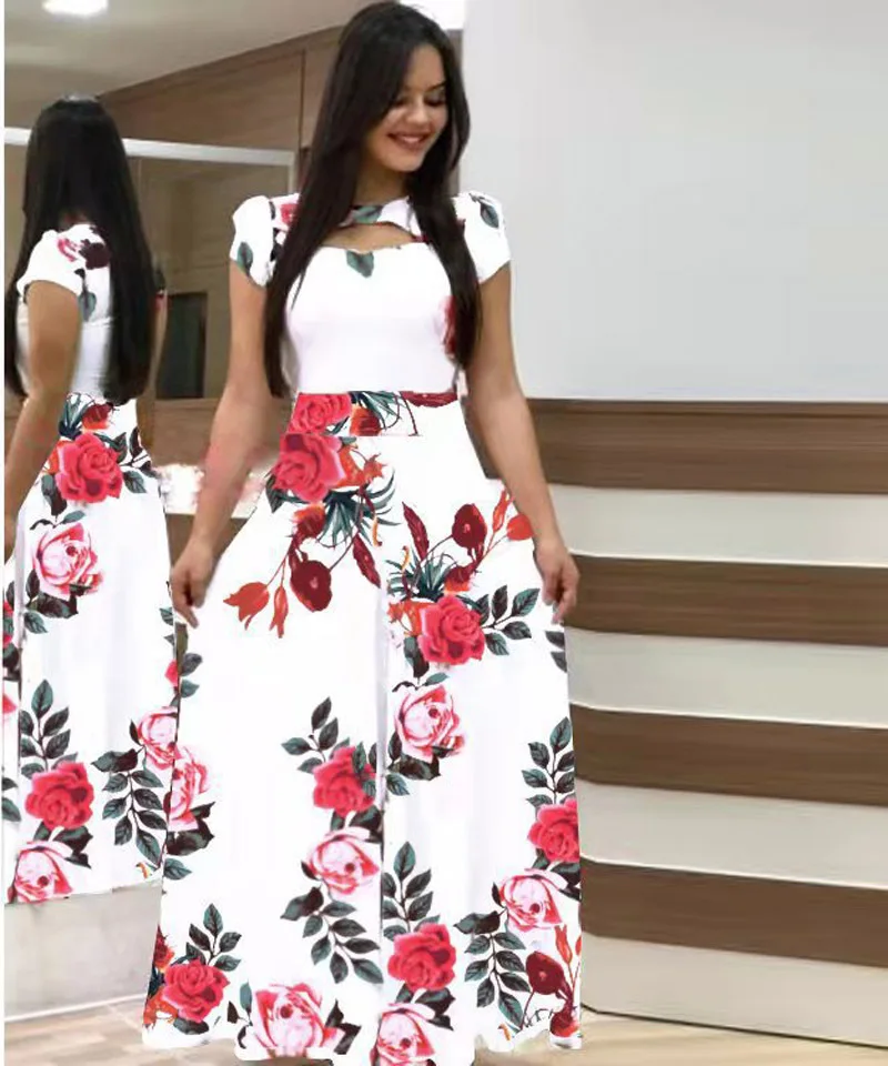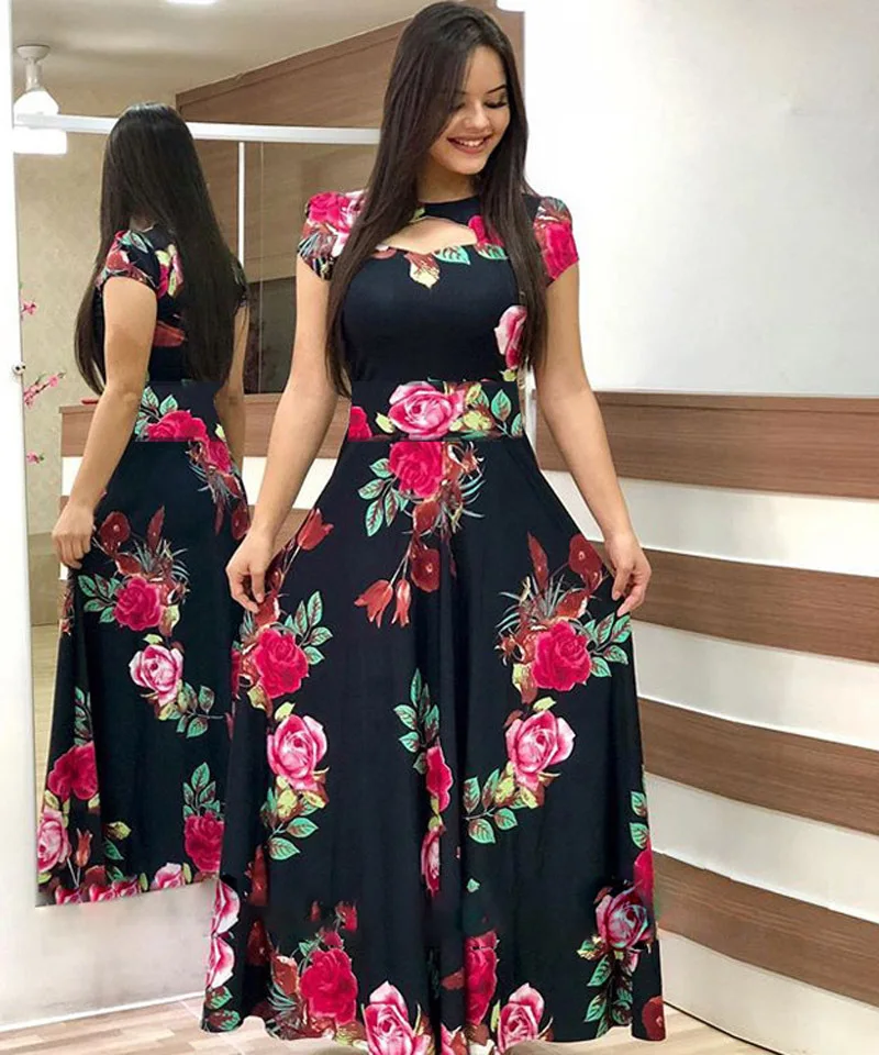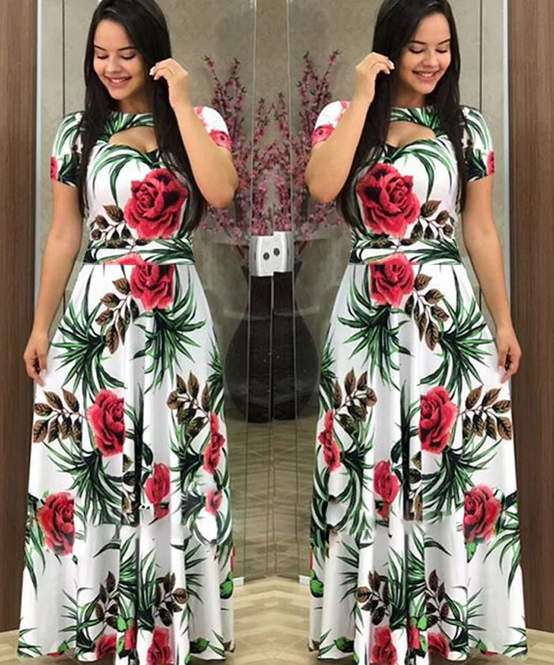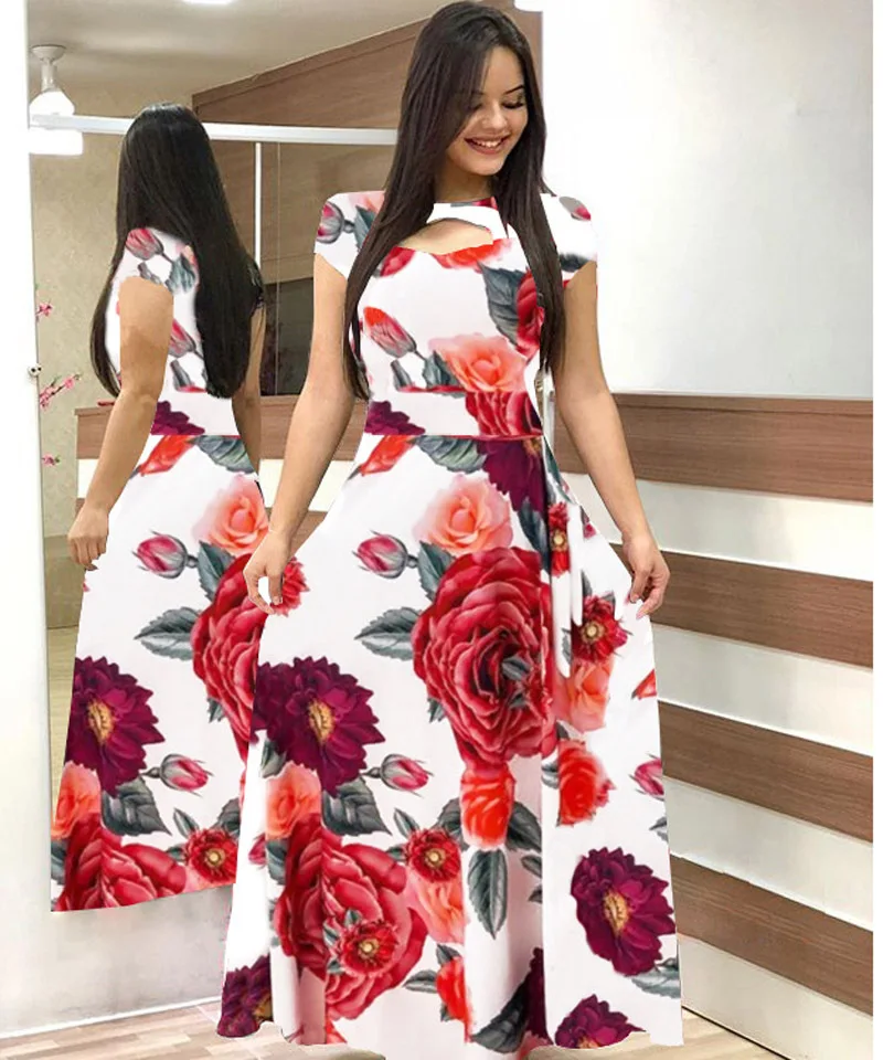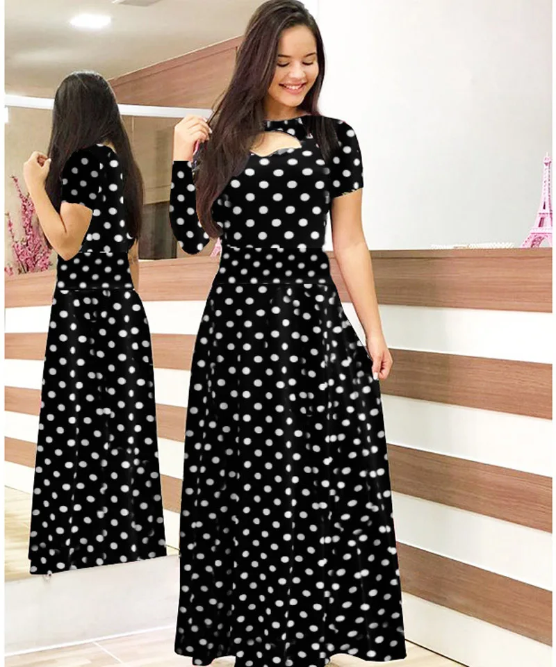 Women Short Sleeve Hollow Out O-neck Long Dress Summer Elegant Dot Printed High Waist Elastic Elegant Boho Robe Maxi Vestidos
