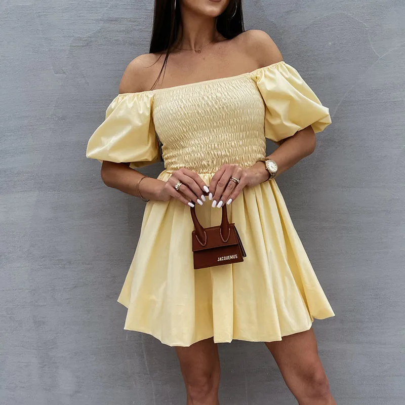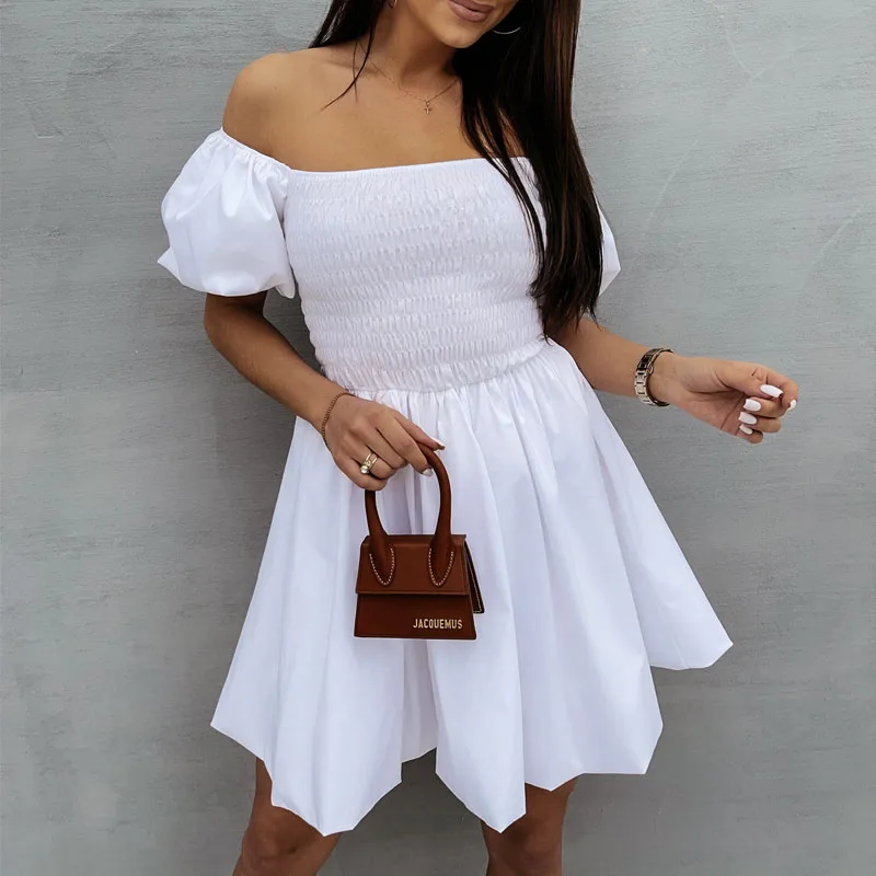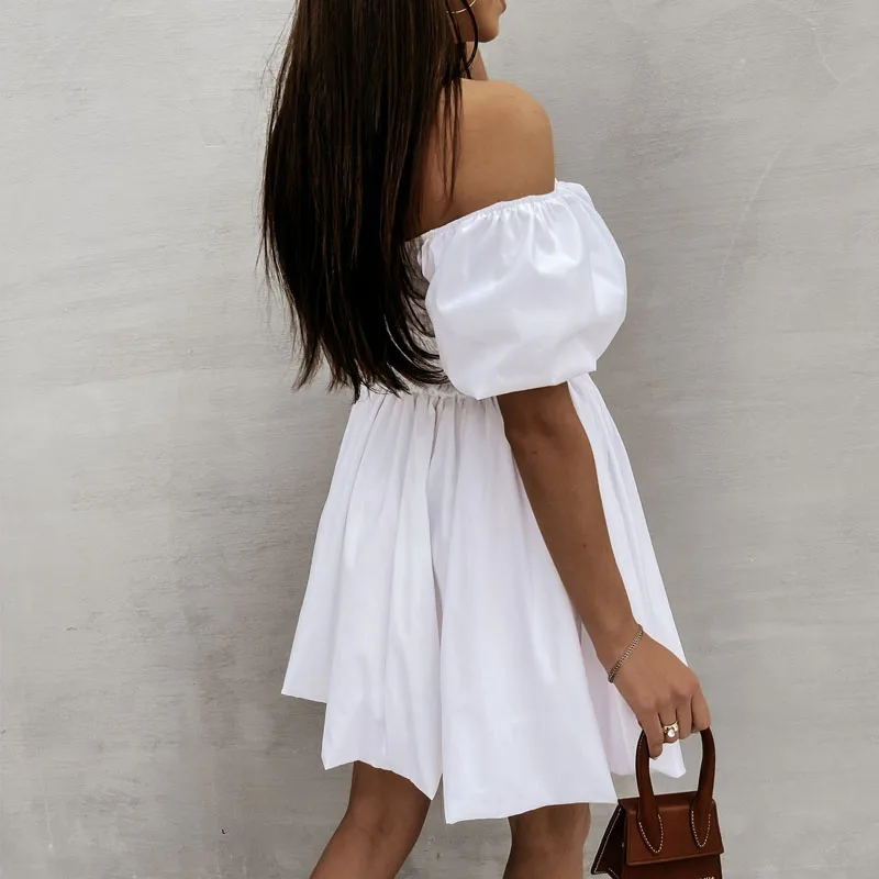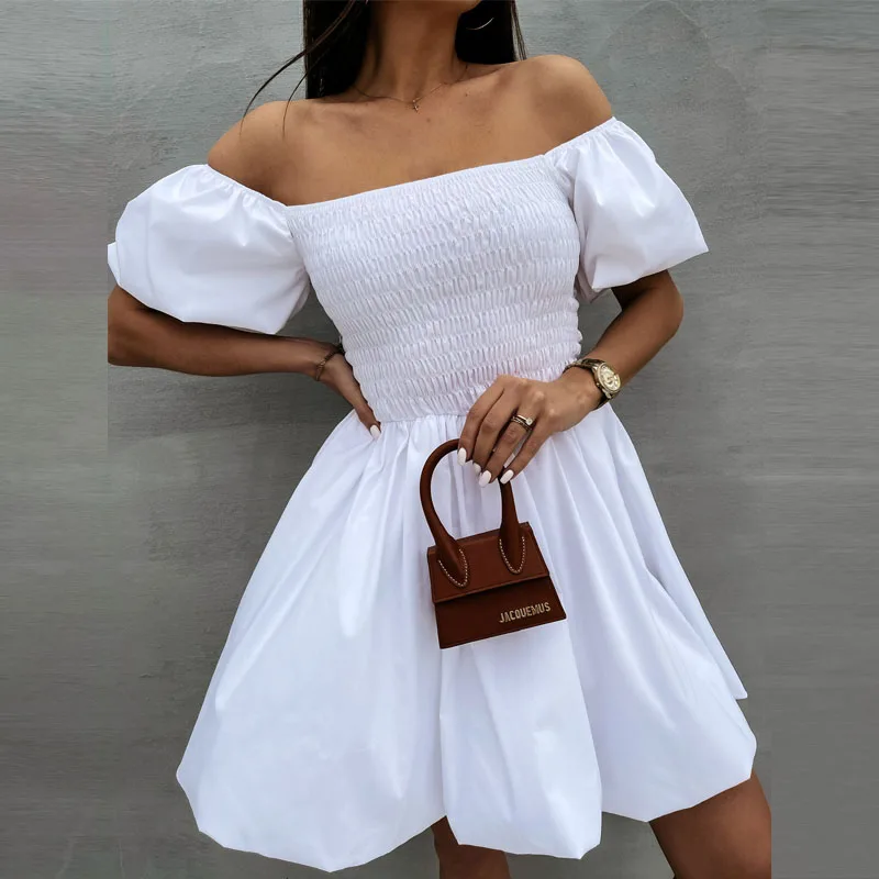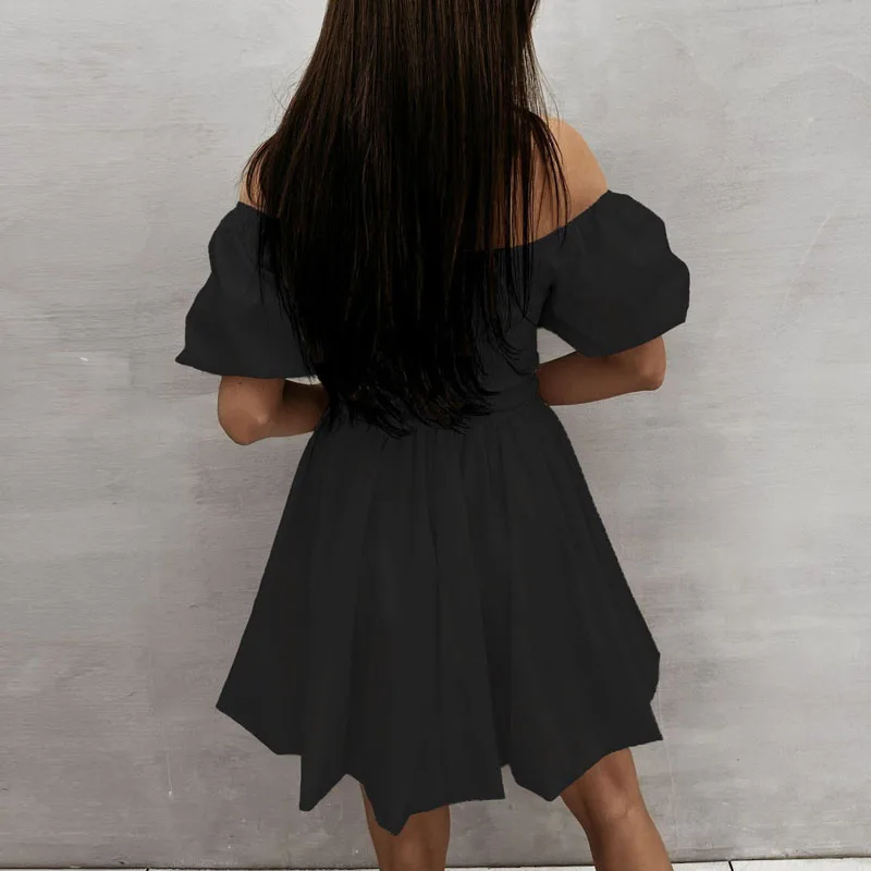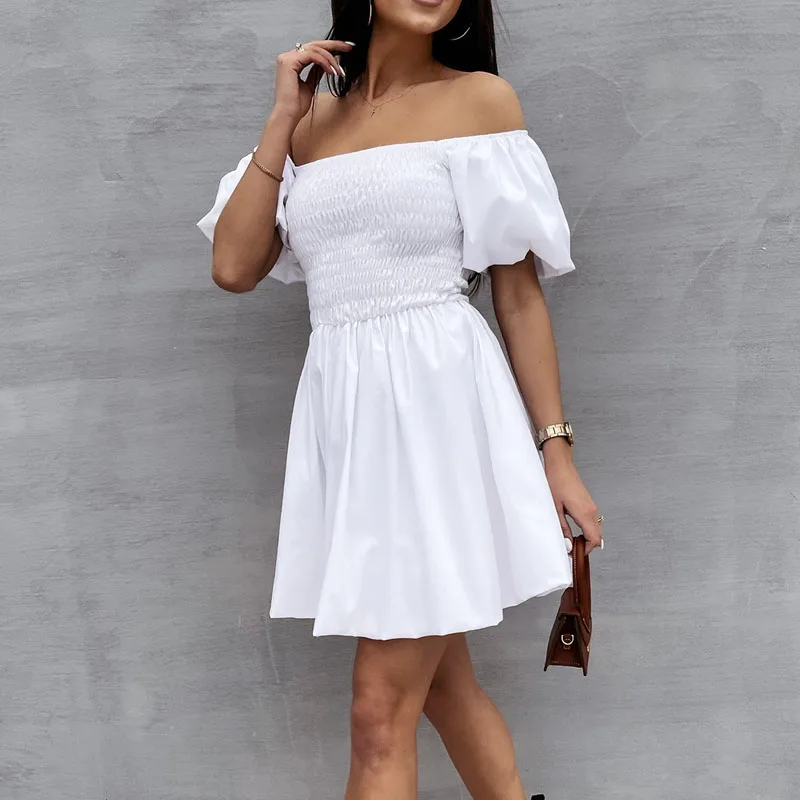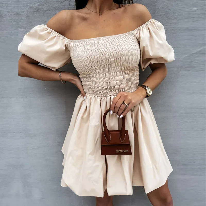 Women Solid Color Dress Fashion Vintage Word- Shoulde Sexy Mini Puff Sleeve Ladies Dress 2021 Summer Casual Elegant Party Dress
