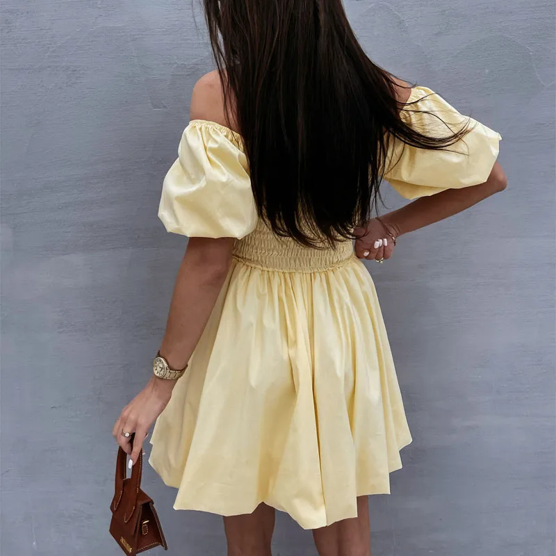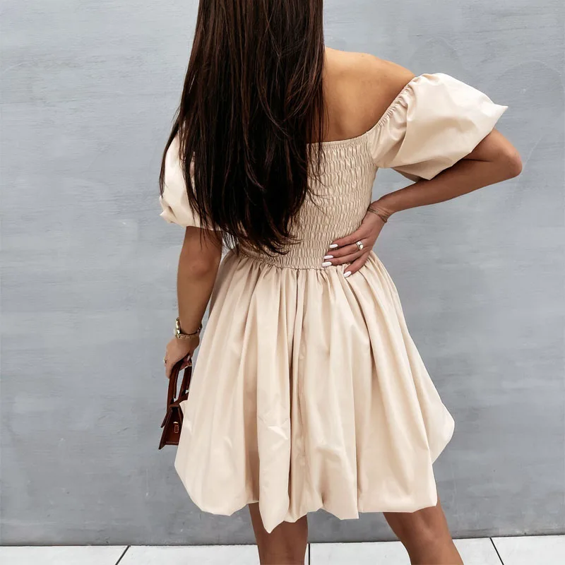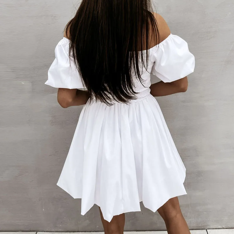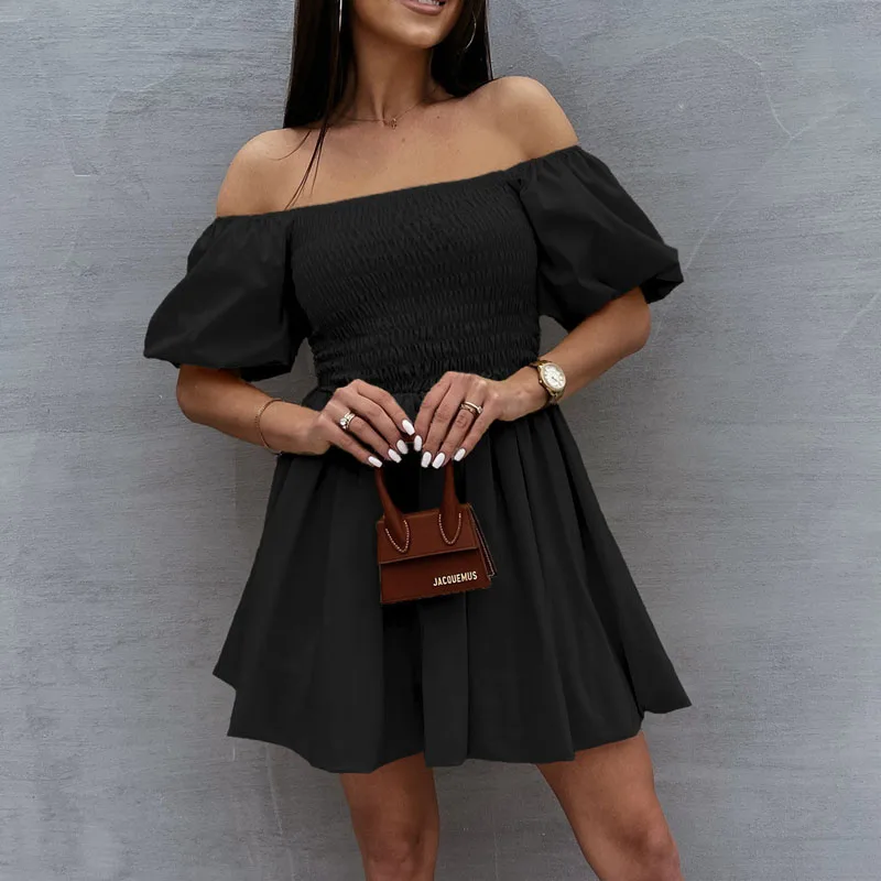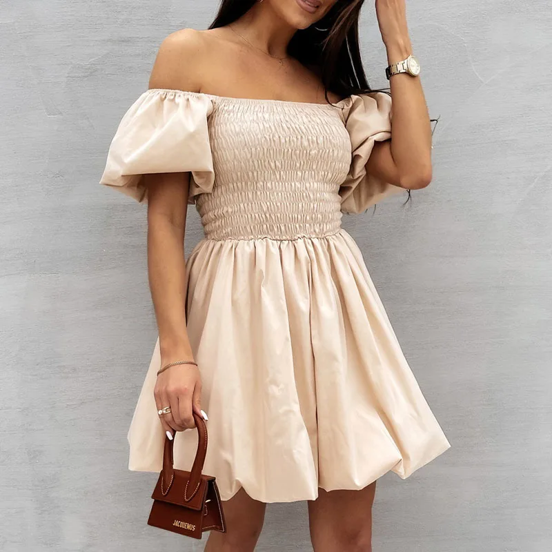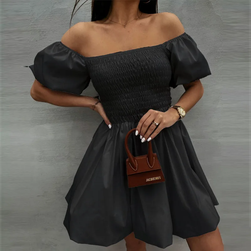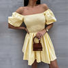Women Solid Color Dress Fashion Vintage Word- Shoulde Sexy Mini Puff Sleeve Ladies Dress 2021 Summer Casual Elegant Party Dress