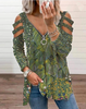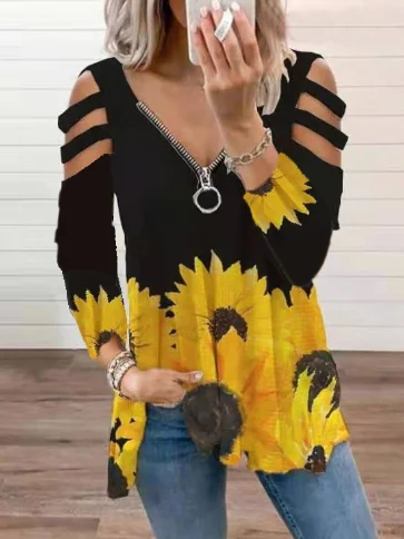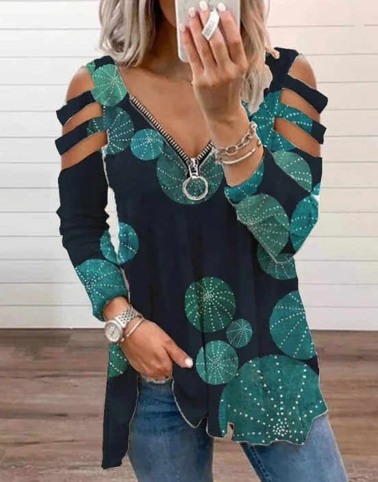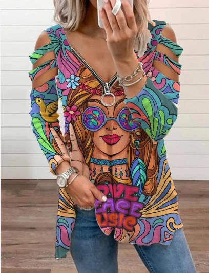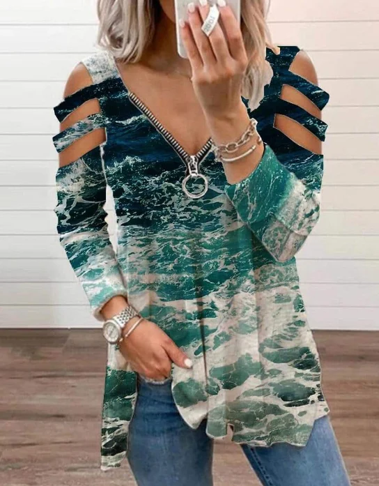 Women Strapless V Neck Print Sexy Deep Low Cut Tops Blouse Shirt Out Zipper Long Sleeve Casual Pullover Summer Plus Size Blusa
