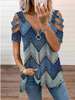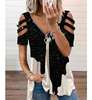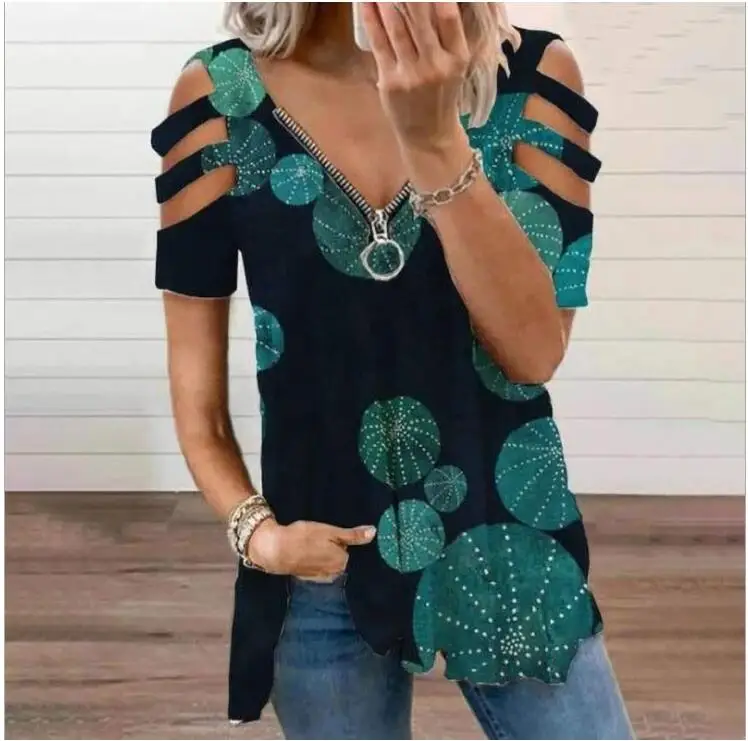 Women Strapless V Neck Print Sexy Deep Low Cut Tops Blouse Shirt Out Zipper Short Sleeve Casual Pullover Summer Plus Size Blusa