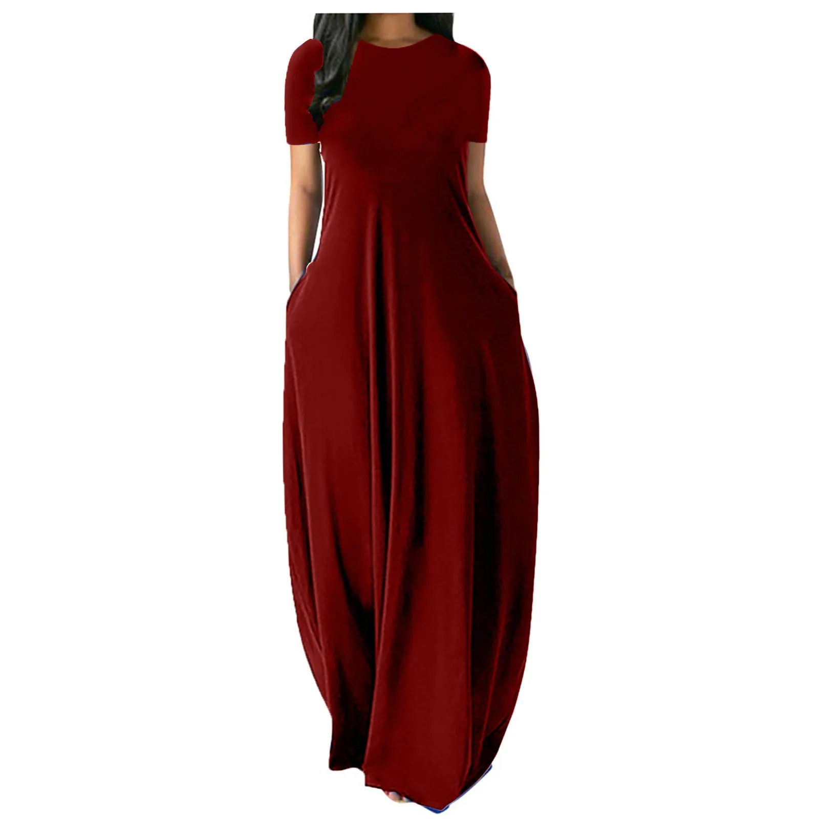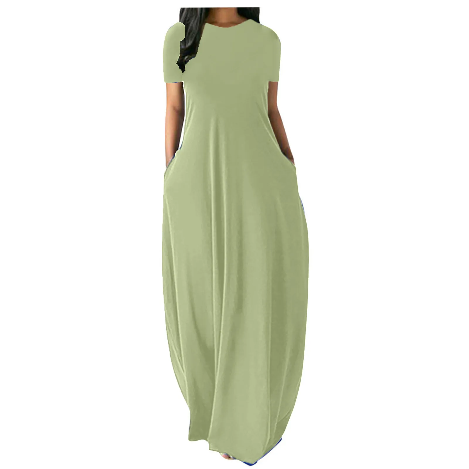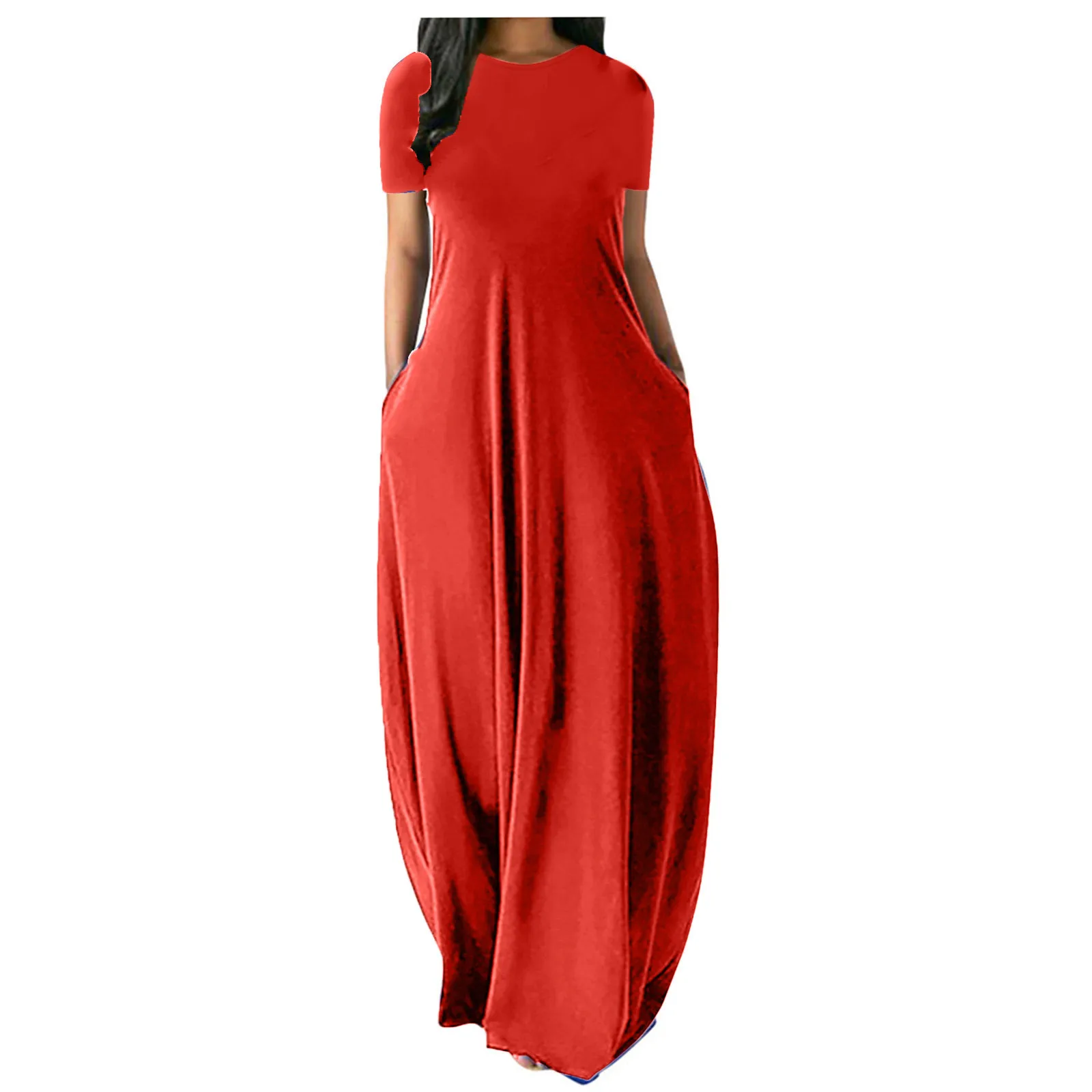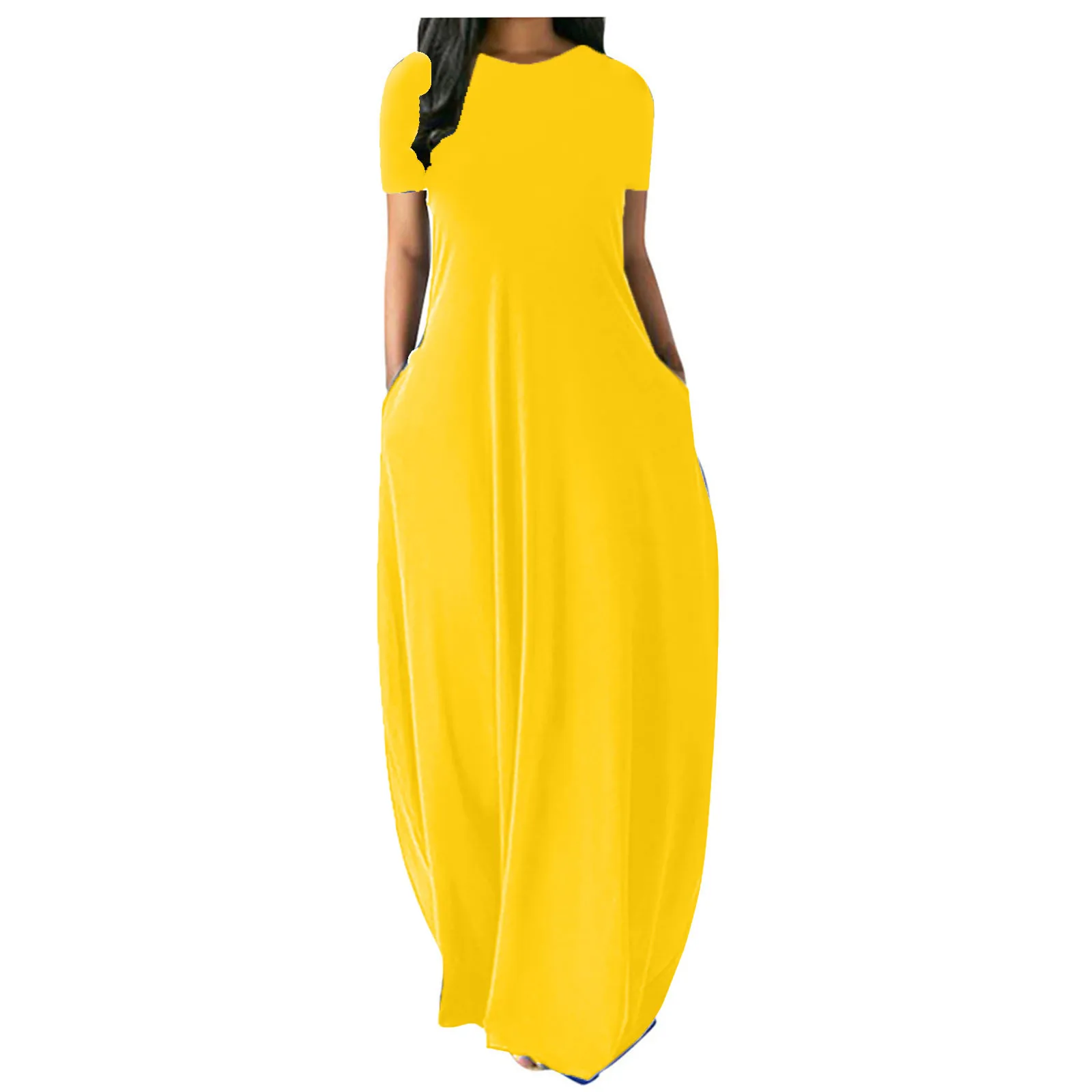 Women Summer Dress Oversize Casual Solid O-Neck Pockets Long Dress Female Plus Size Short Sleeve High Waist Maxi Dresses vestido