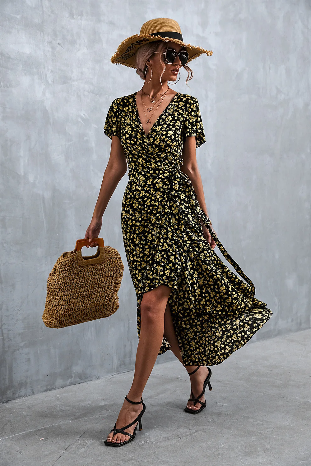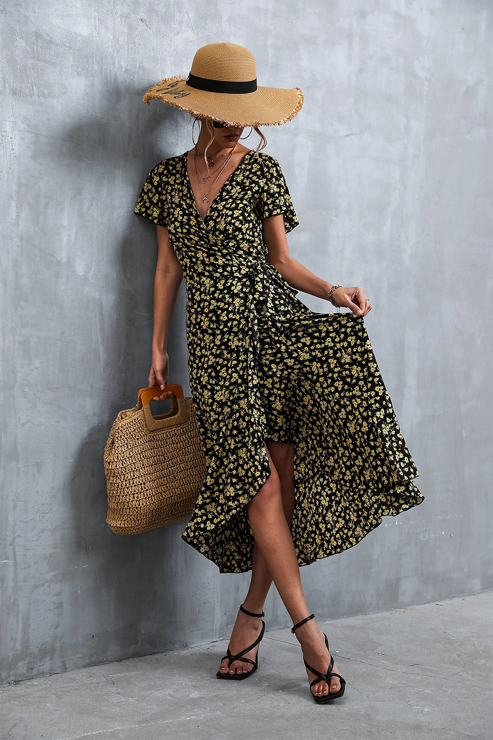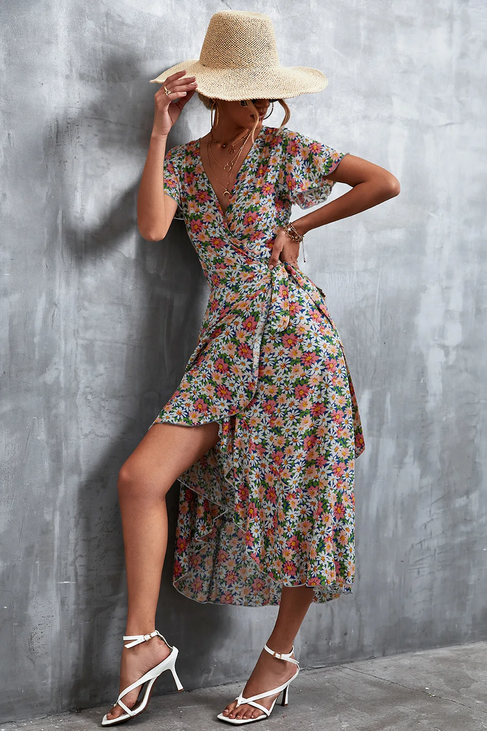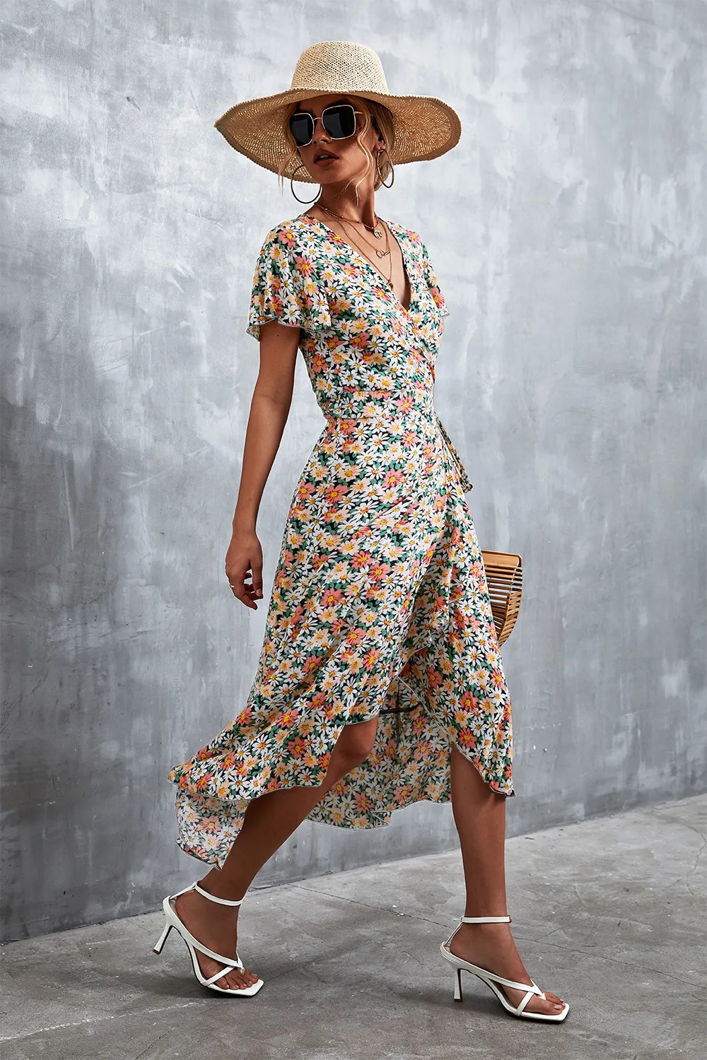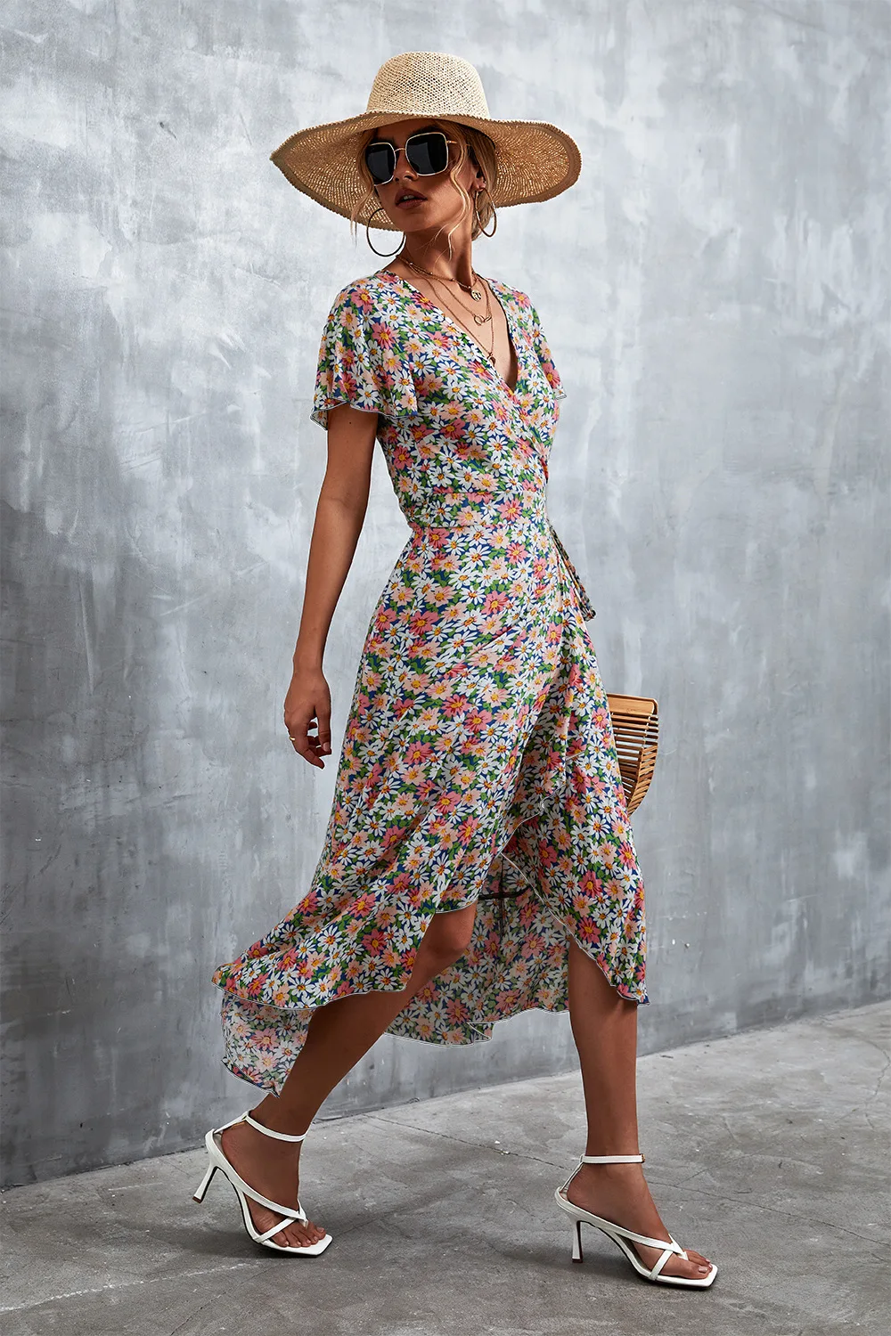 Women Summer Elegant Asymmetrical Long Dress Holiday Beach Casual V Neck Party Vestidos Vintage Floral Irregular Printed Dresses
