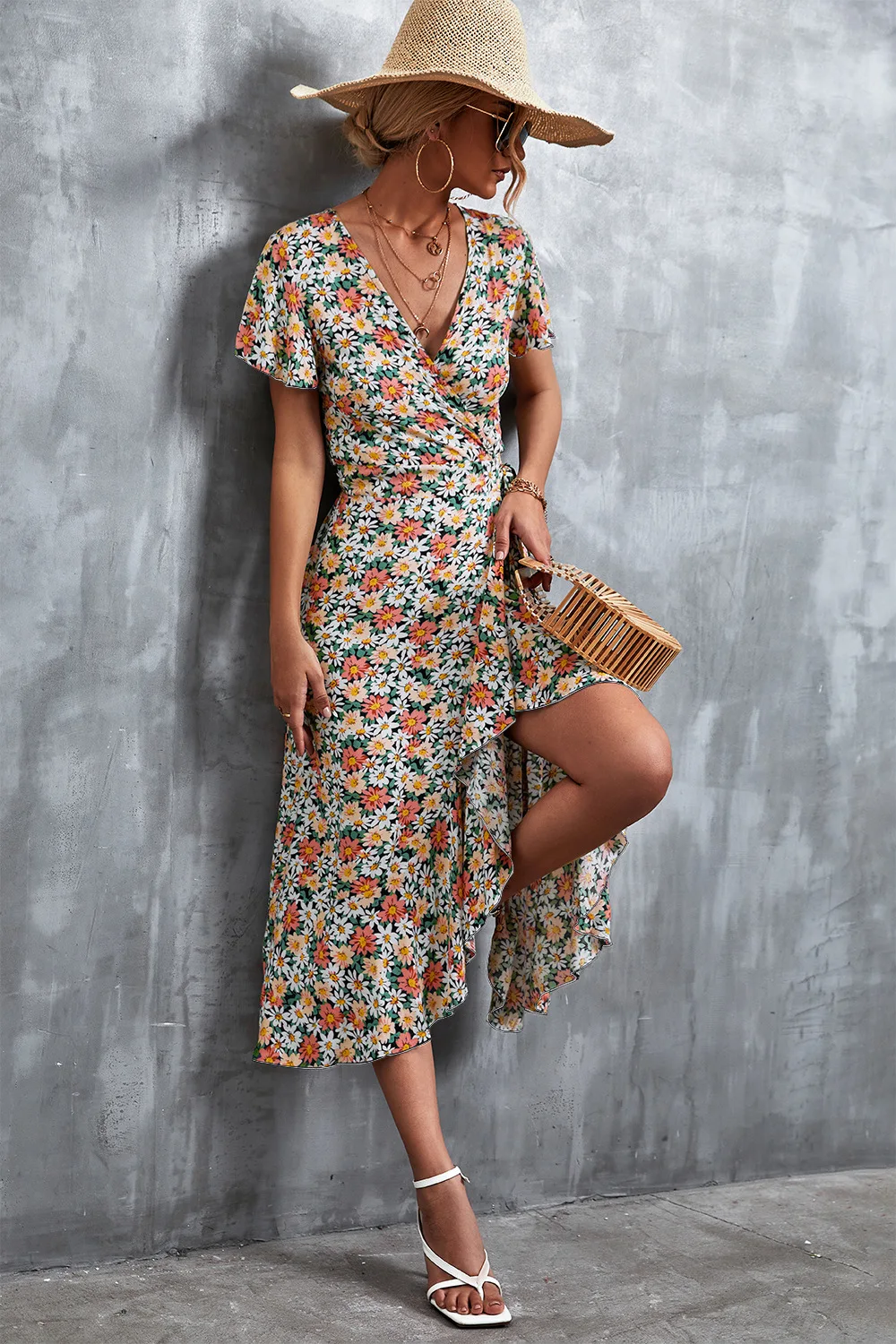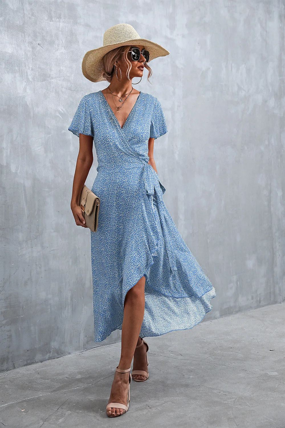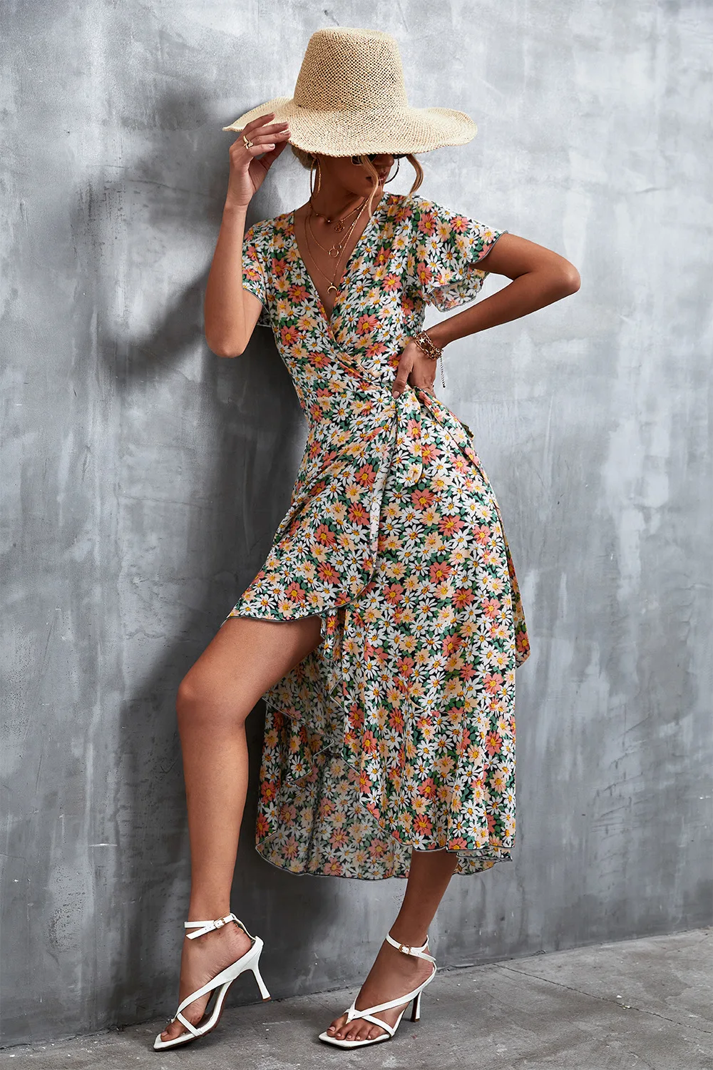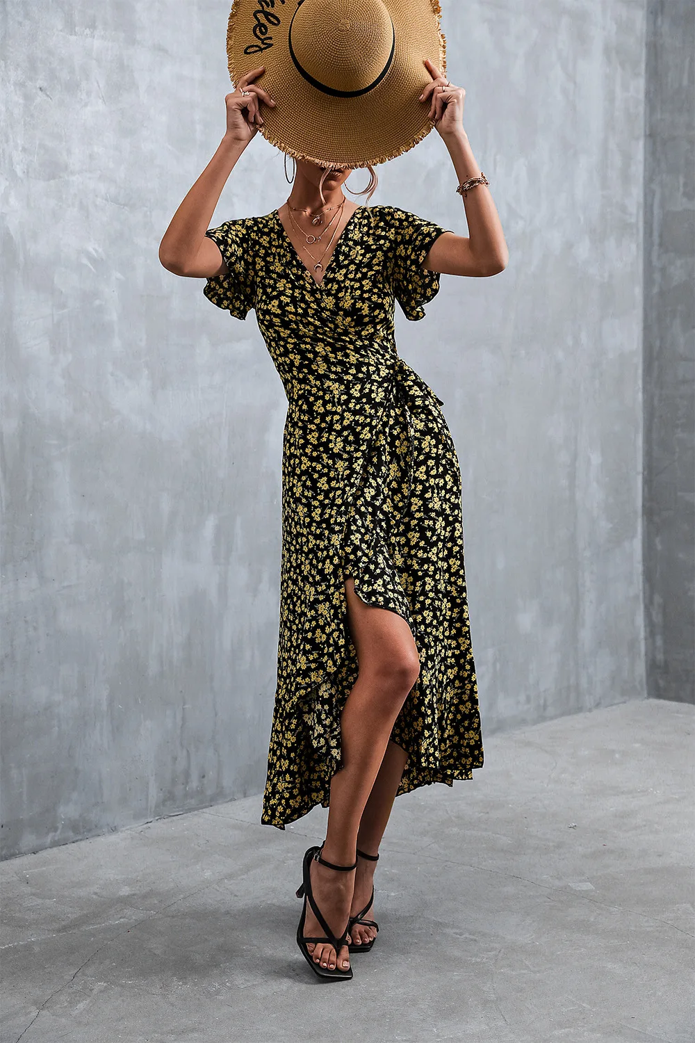 Women Summer Elegant Asymmetrical Long Dress Holiday Beach Casual V Neck Party Vestidos Vintage Floral Irregular Printed Dresses