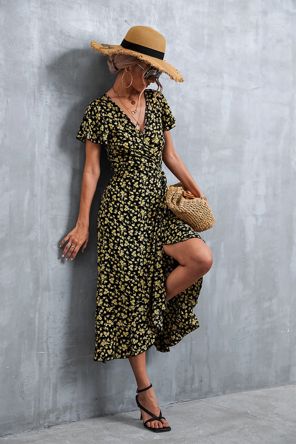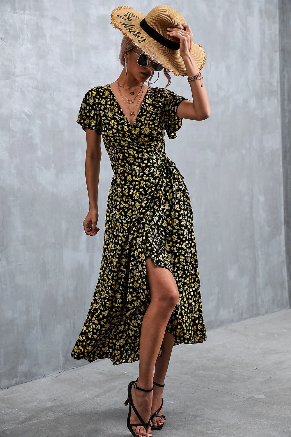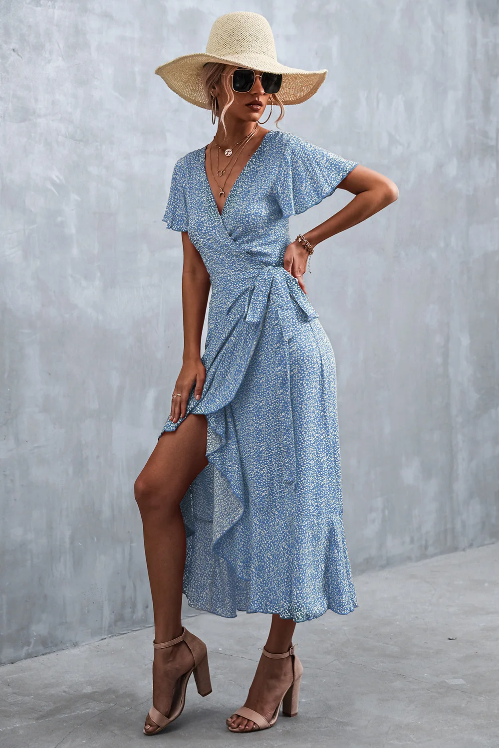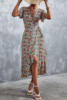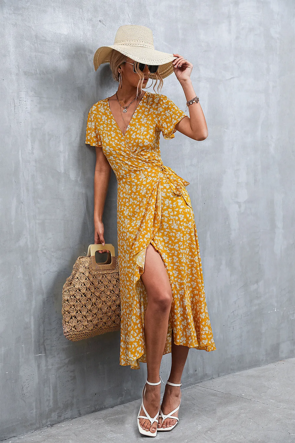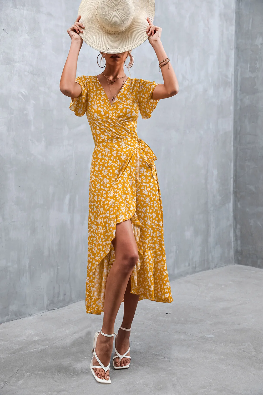 Women Summer Elegant Asymmetrical Long Dress Holiday Beach Casual V Neck Party Vestidos Vintage Floral Irregular Printed Dresses