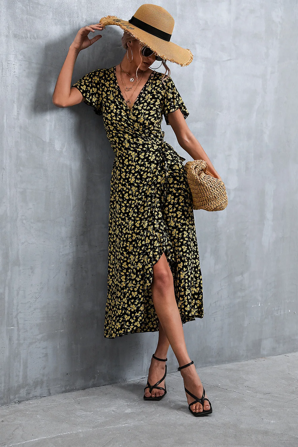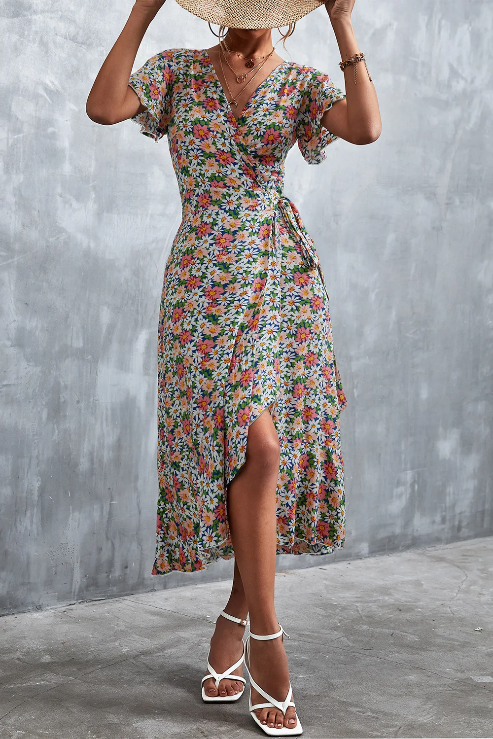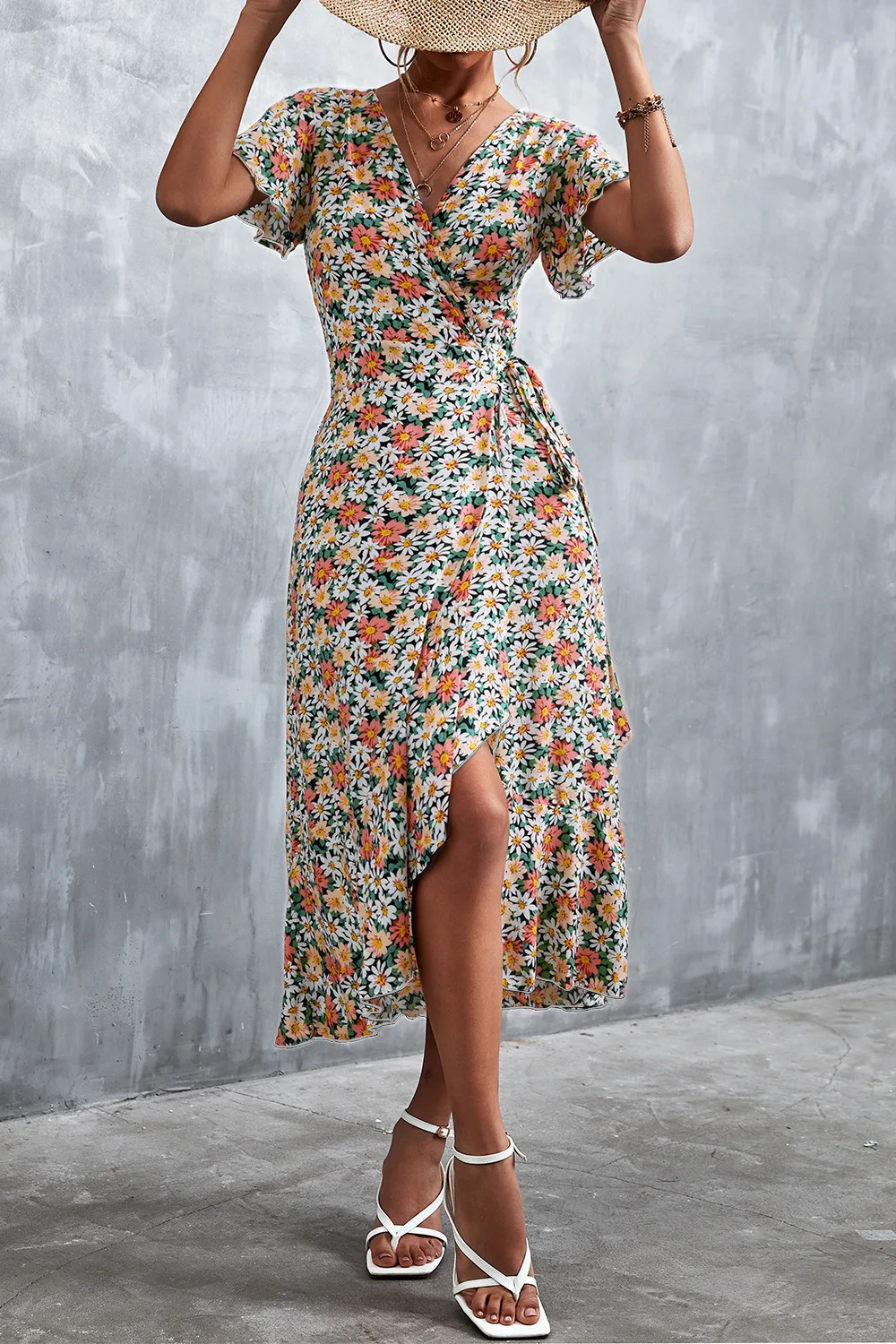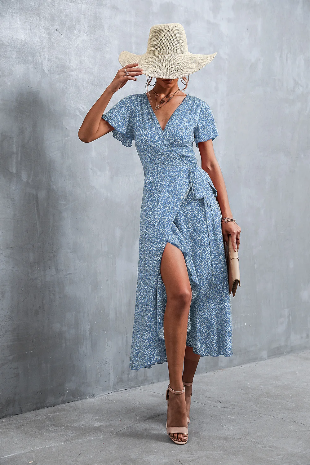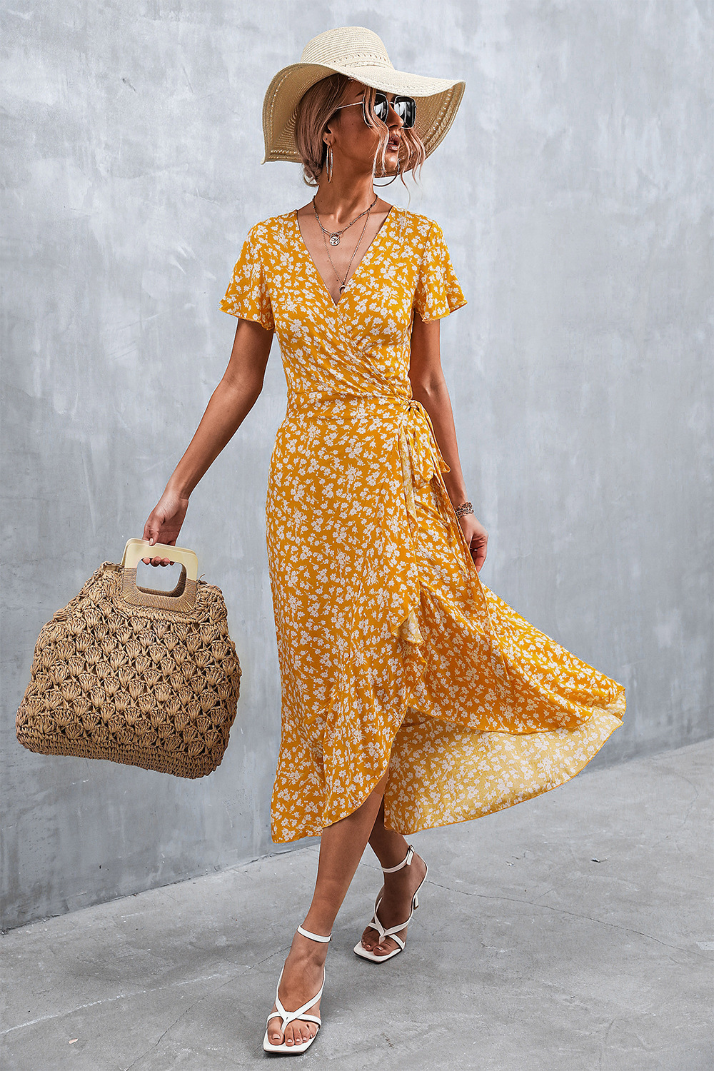 Women Summer Elegant Asymmetrical Long Dress Holiday Beach Casual V Neck Party Vestidos Vintage Floral Irregular Printed Dresses