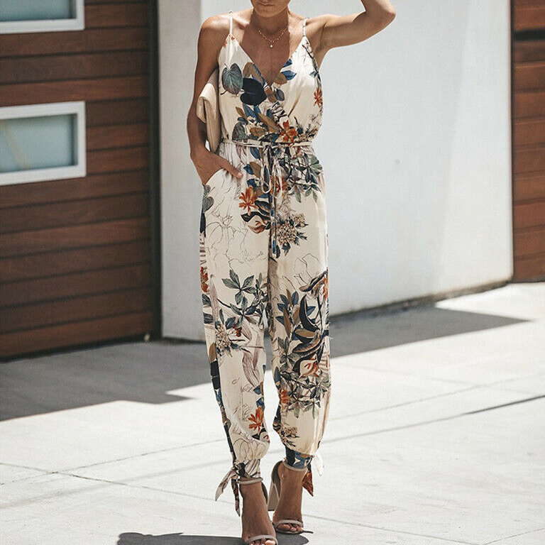 Women Summer Holiday Casual Sleeveless Jumpsuits Fashion Ladies Boho Floral Bodysuit Loose Long Pant Trousers Overalls for Women
