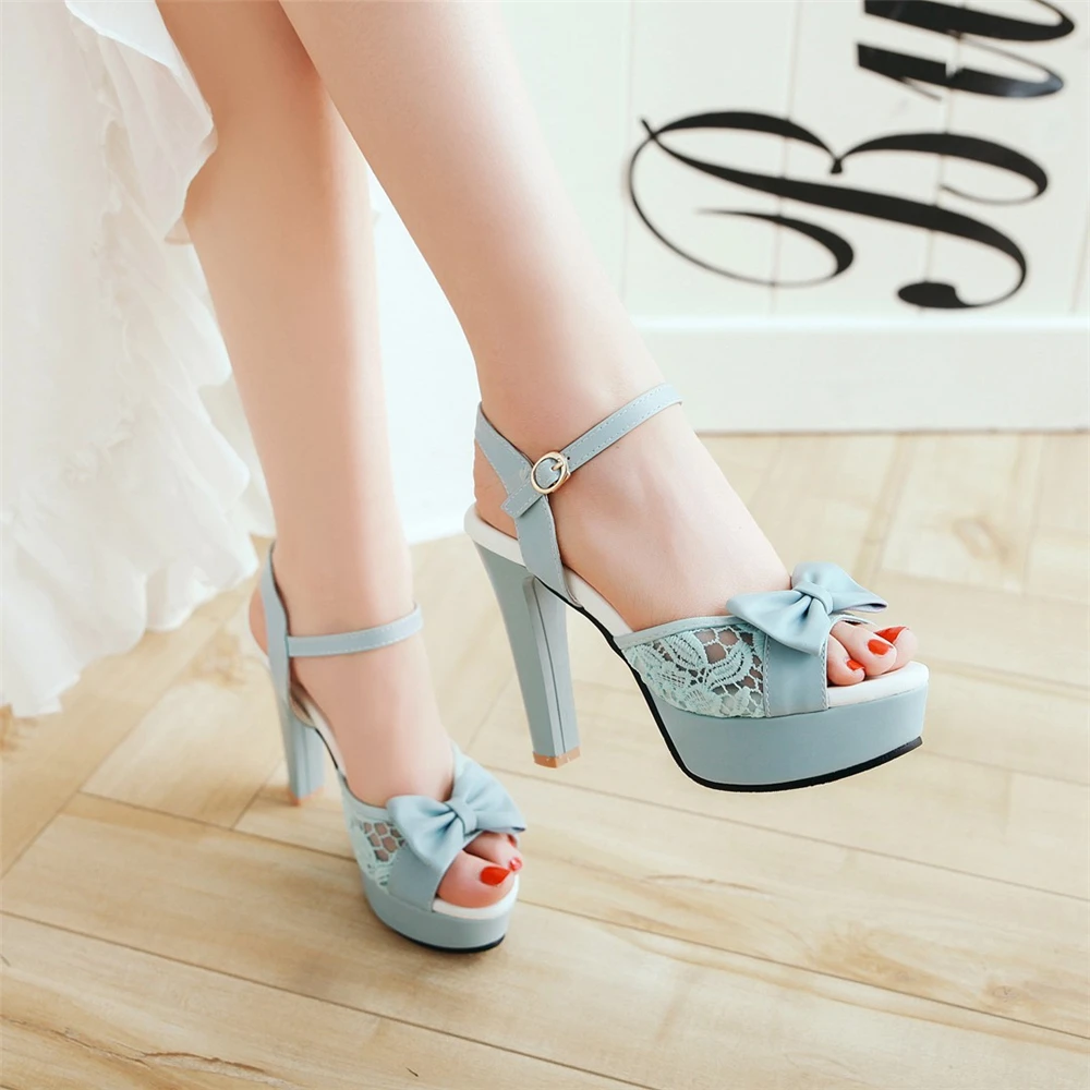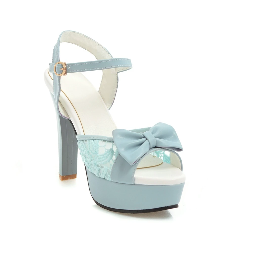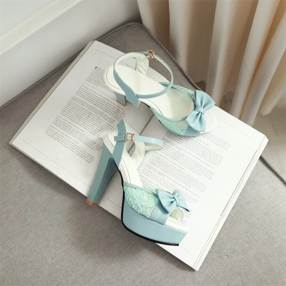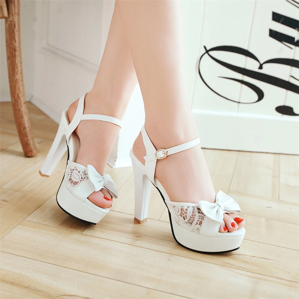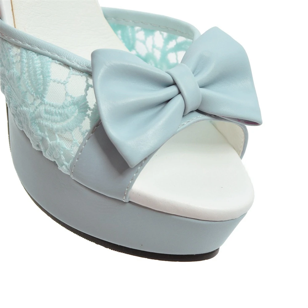 Women Summer Lace Bow Mesh Shoes Fish Mouth High Heel Ladys Platform Sandals Evening White Dress Wedding Female Zapatos De Mujer
