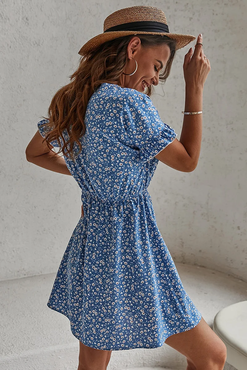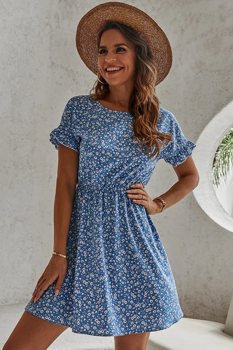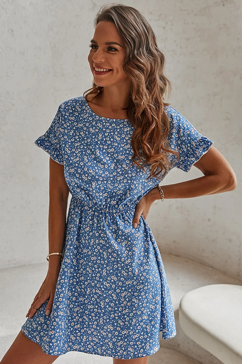Women Summer New Casual Sweet Style Loose O-Neck Flare Sleeve Lady Blue White Floral Elastic Waist Short Dresses Female Clothe