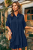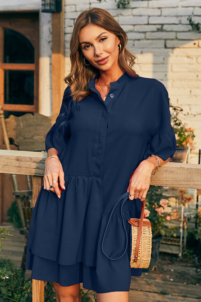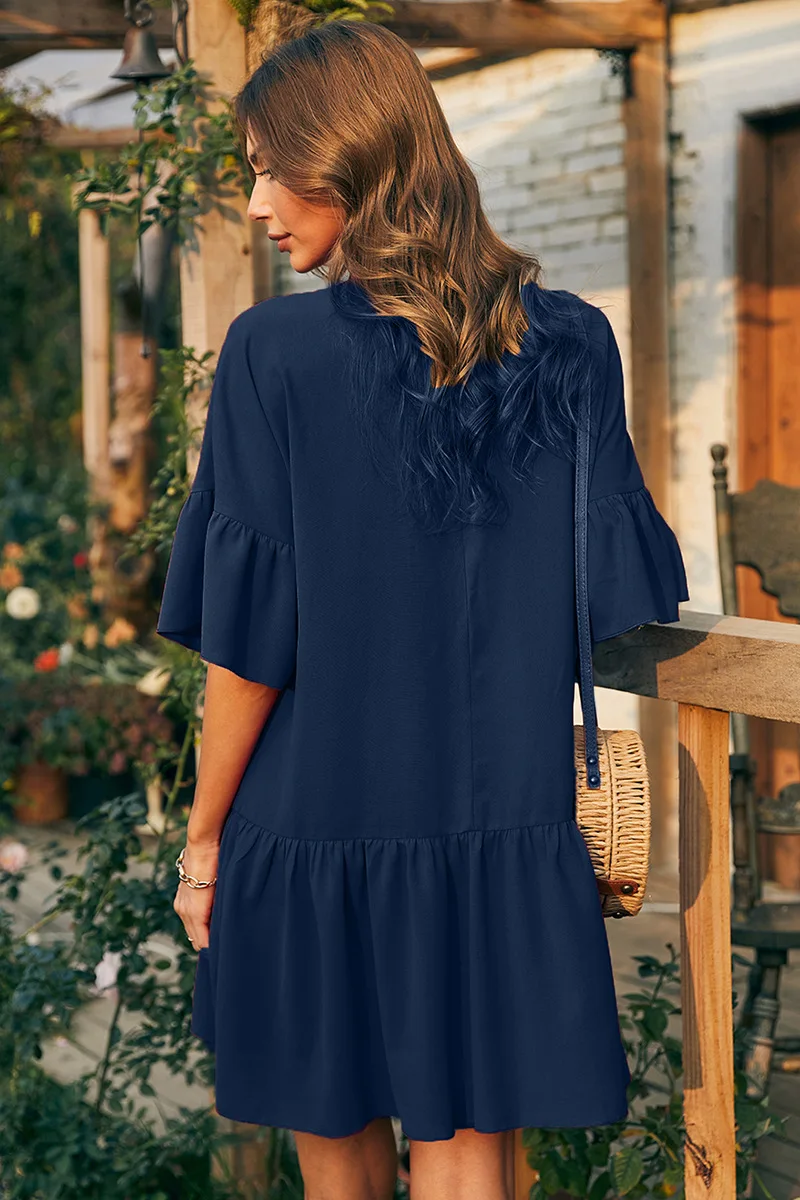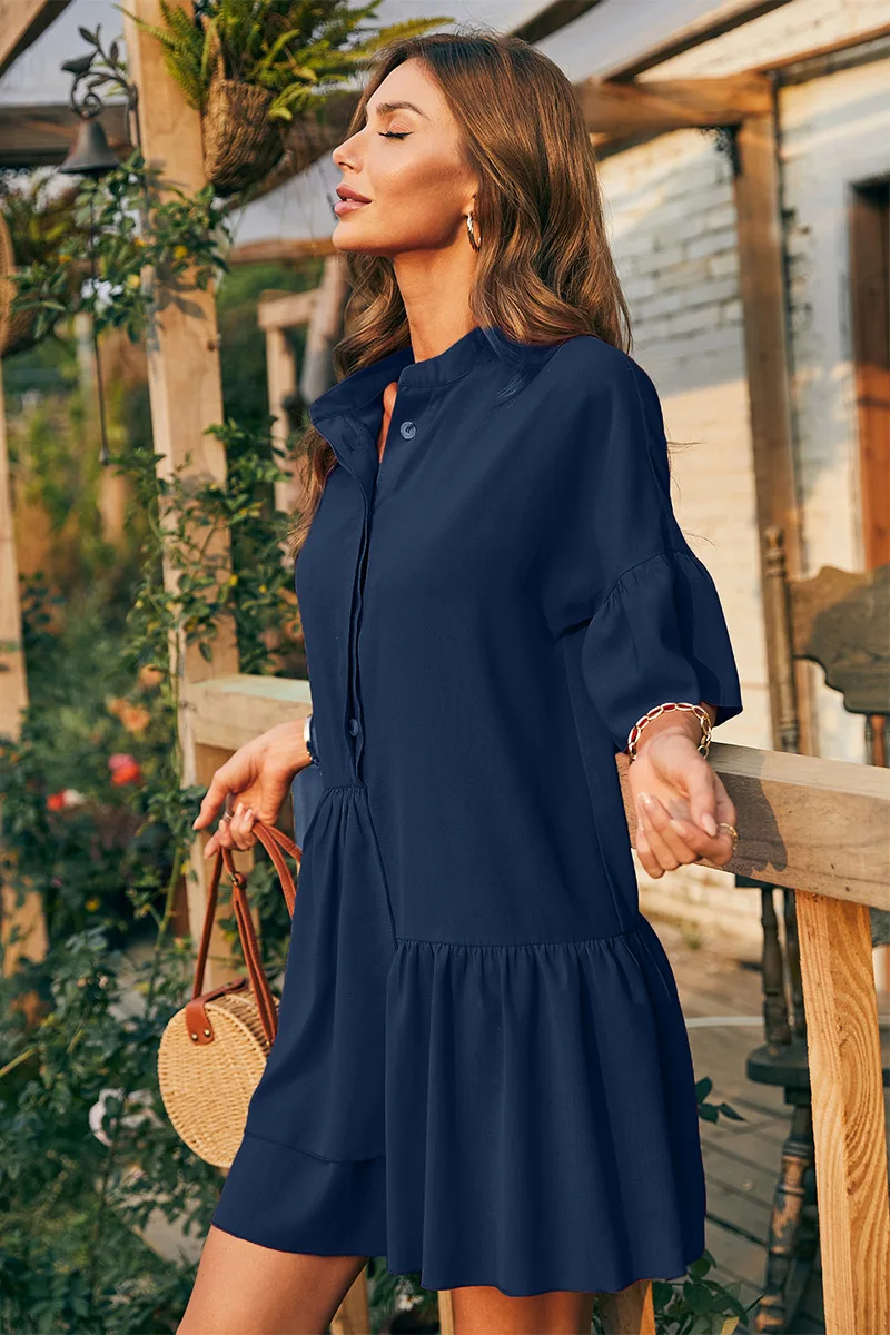 Women Summer New Temperament Solid O-Neck Button Short Sleeve Loose Casual Holiday Ruffle Hemline Stitch Irregular Dress Female