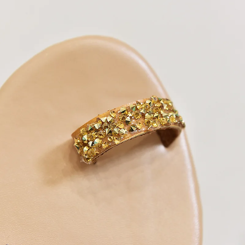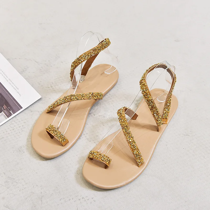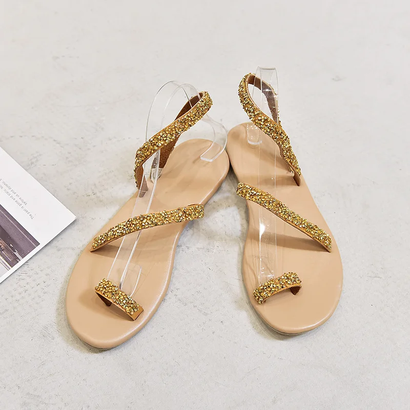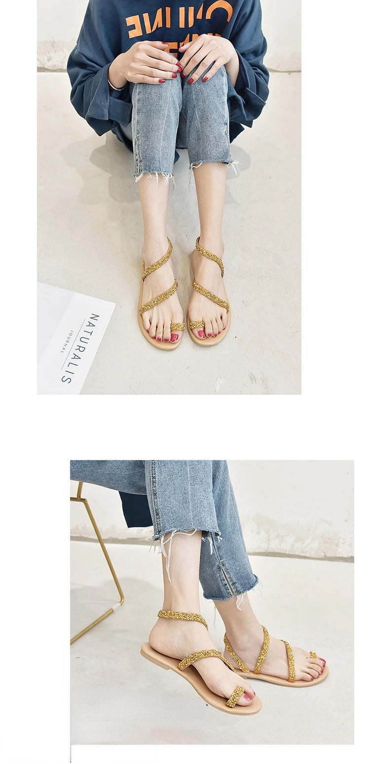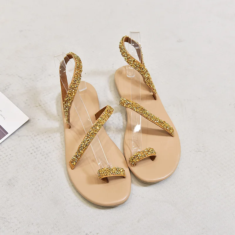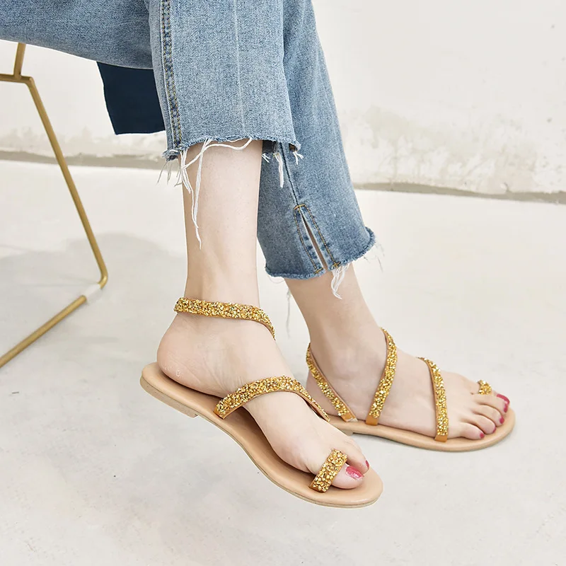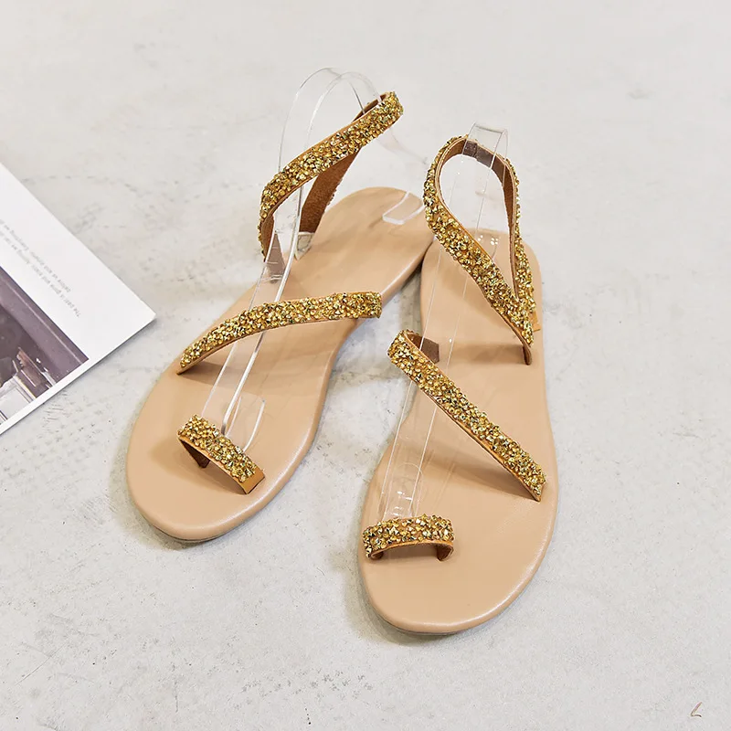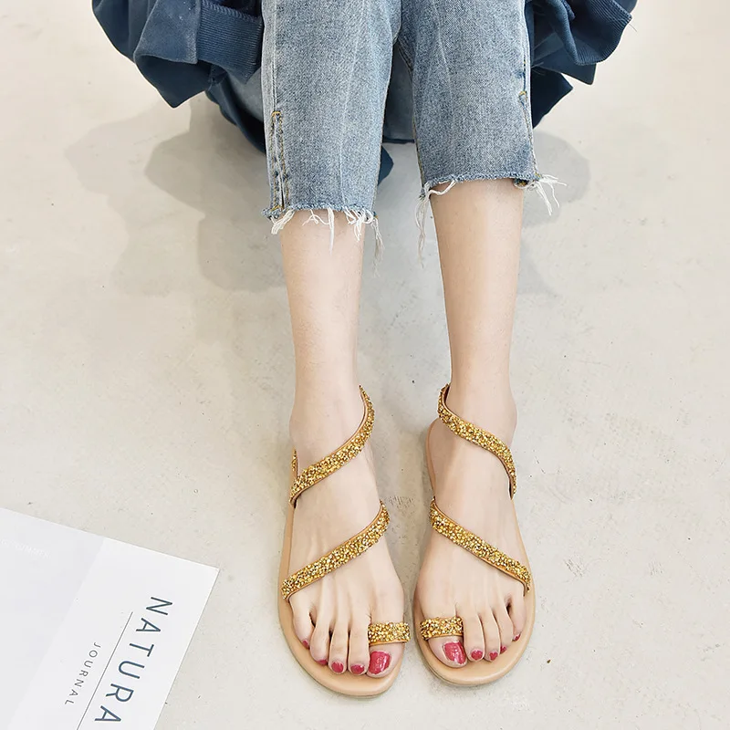 Women Summer Sand Flat Sandals Sweet Boho rhinestones Decoration Shoes Leather Flats Plus Size Female Beach vacation Sandal New