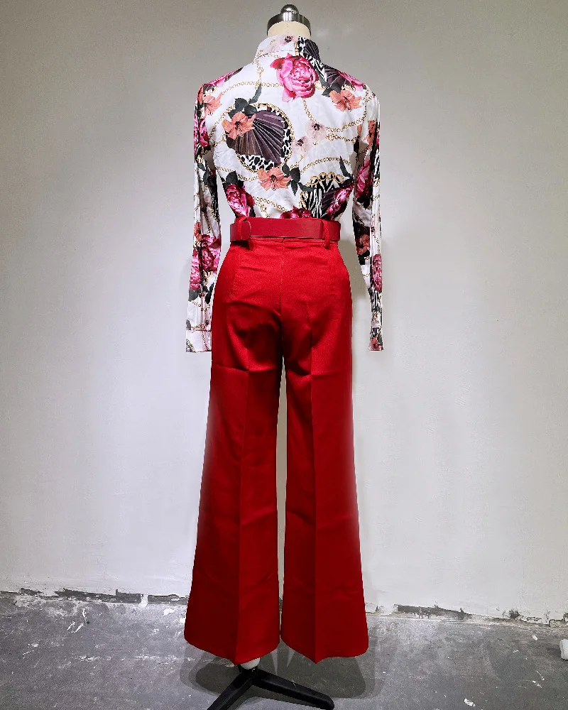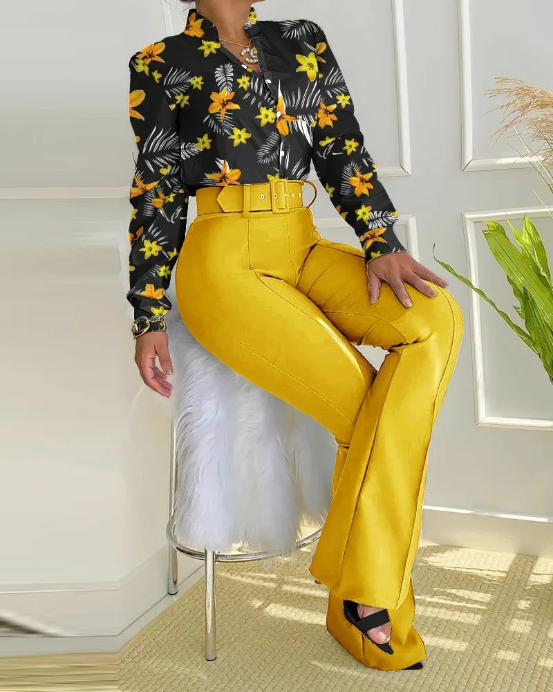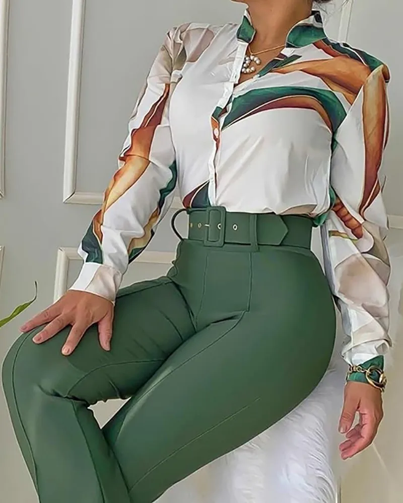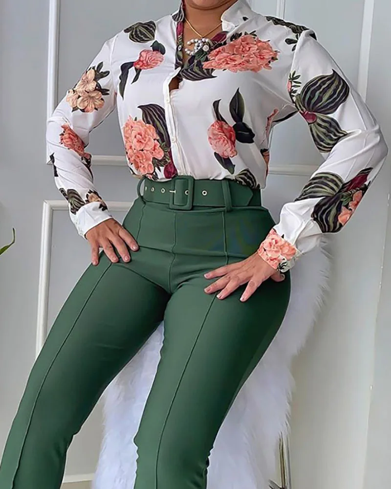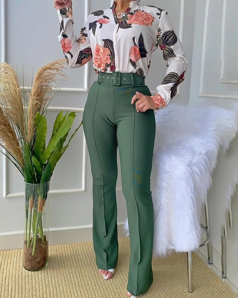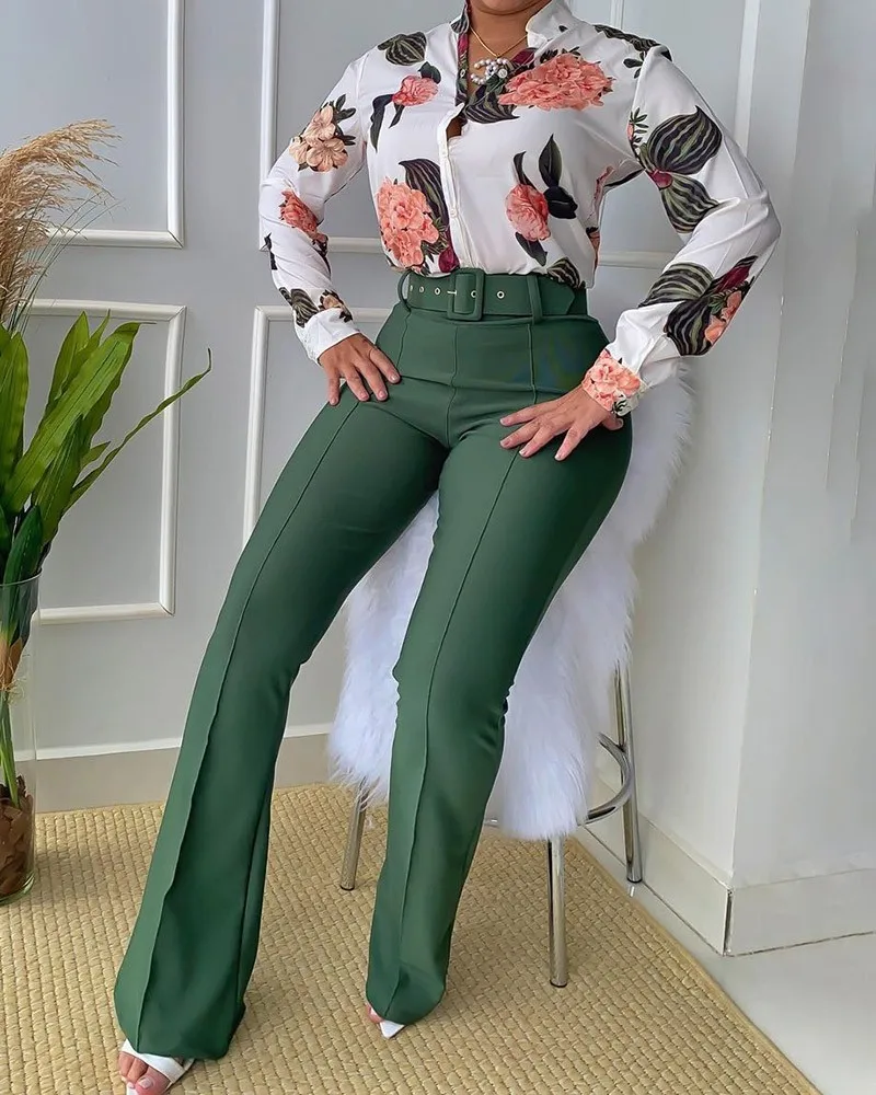 Women Two Pieces Set Leaf Print Buttoned Shirt & High Waist Pants Set Women Tracksuit Office Clothes With Belt Oufits 2 Piece