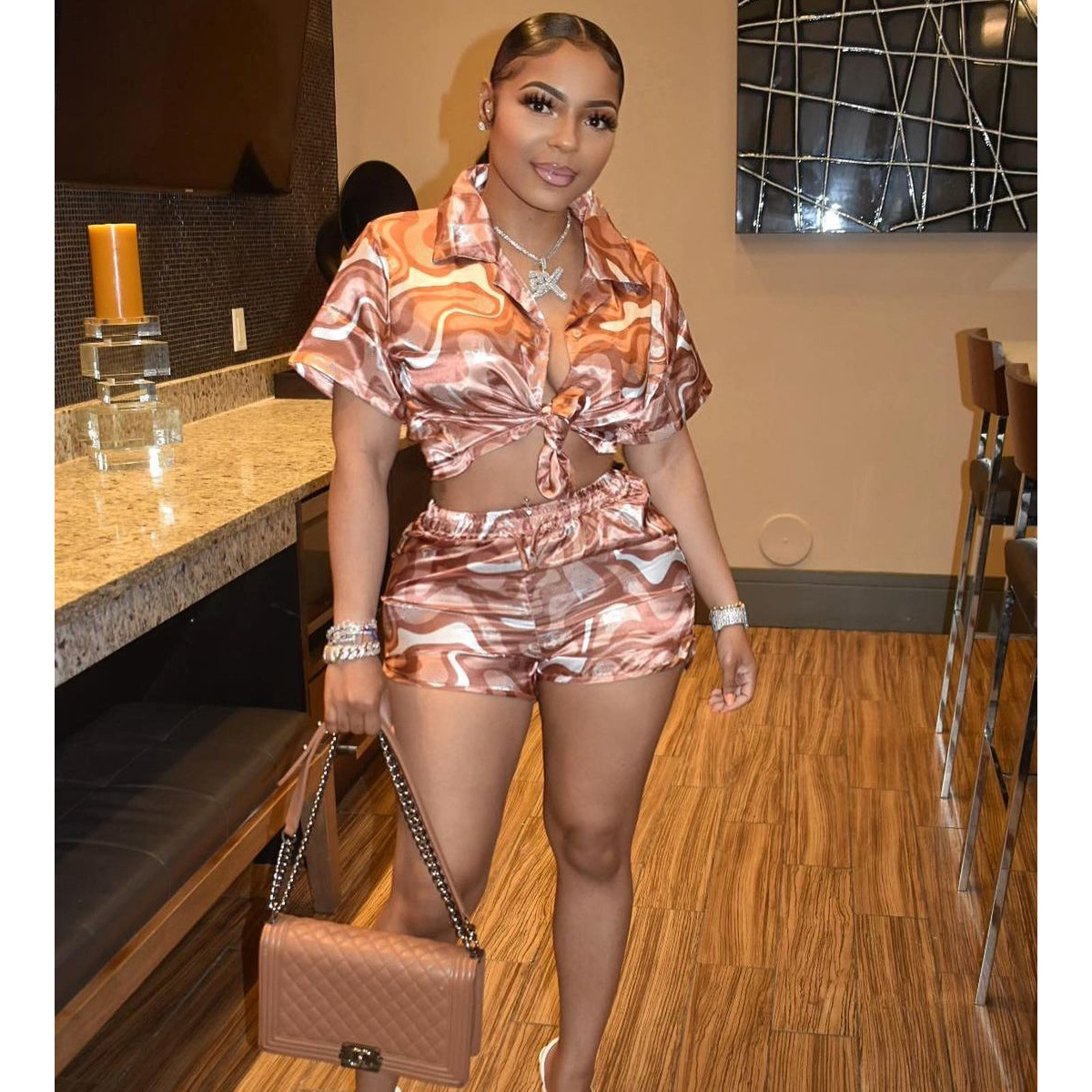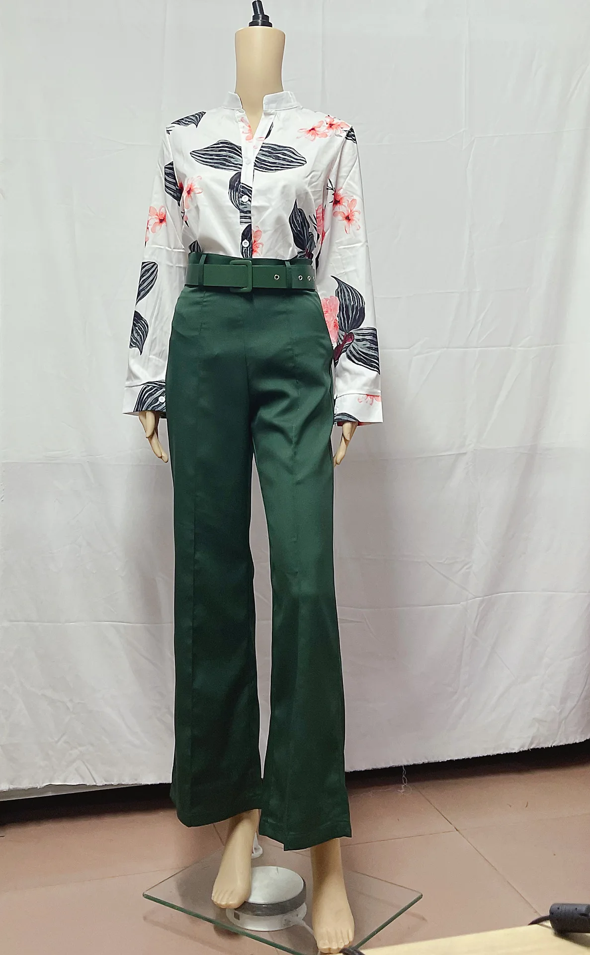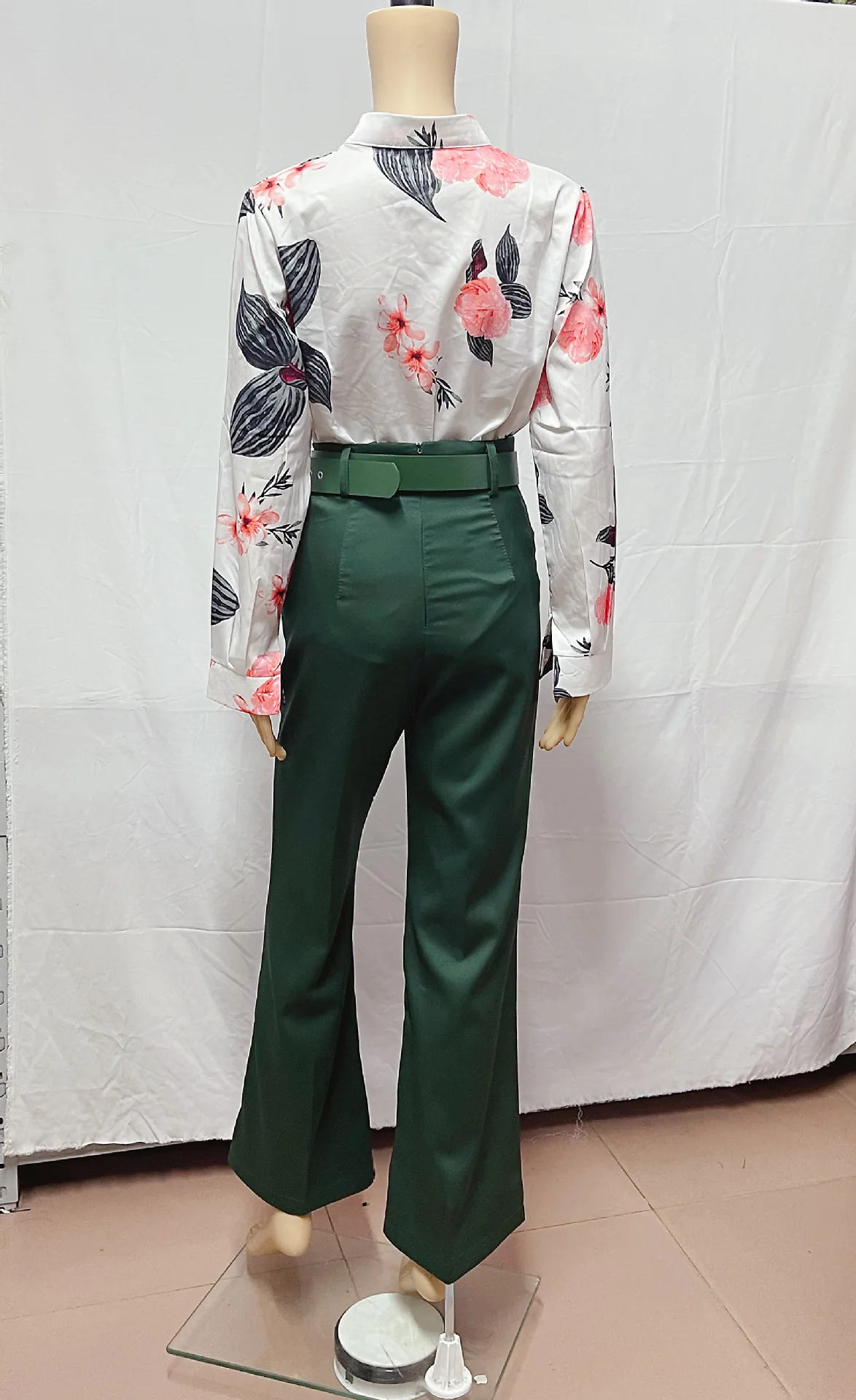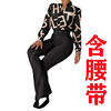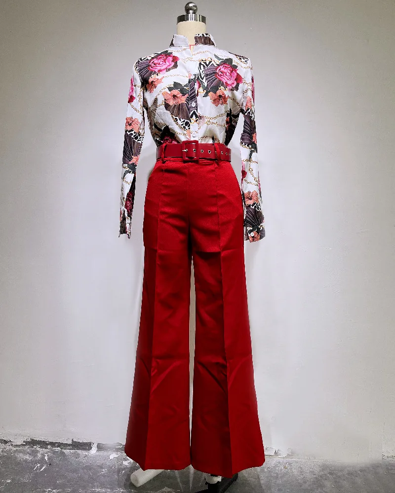 Women Two Pieces Set Leaf Print Buttoned Shirt & High Waist Pants Set Women Tracksuit Office Clothes With Belt Oufits 2 Piece
