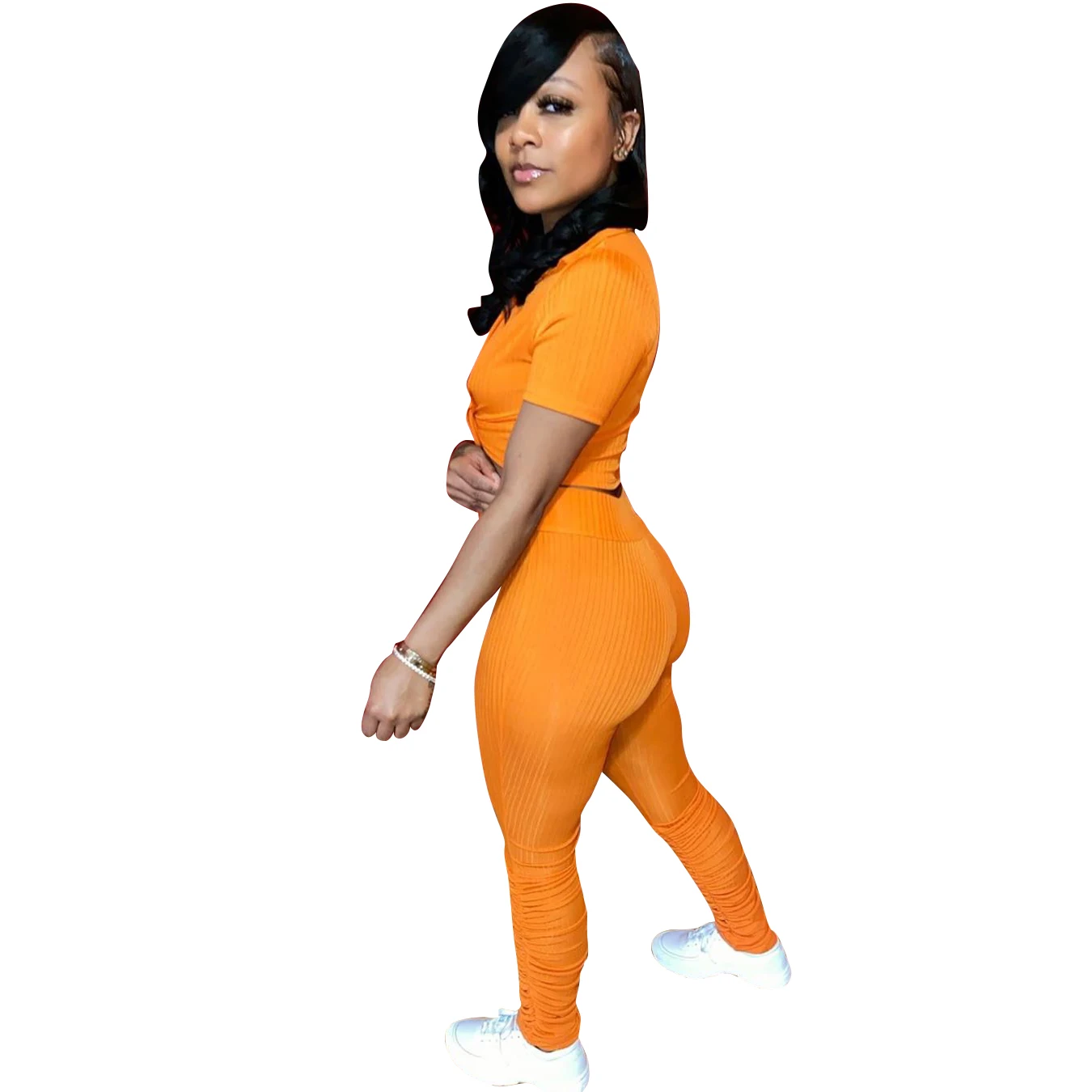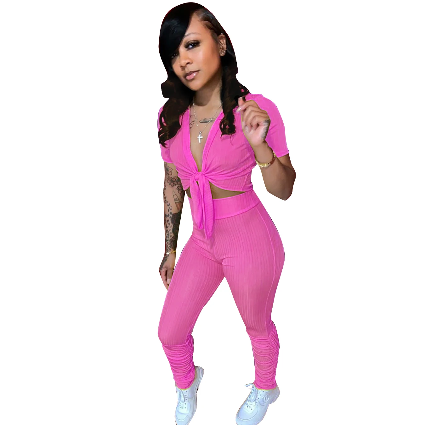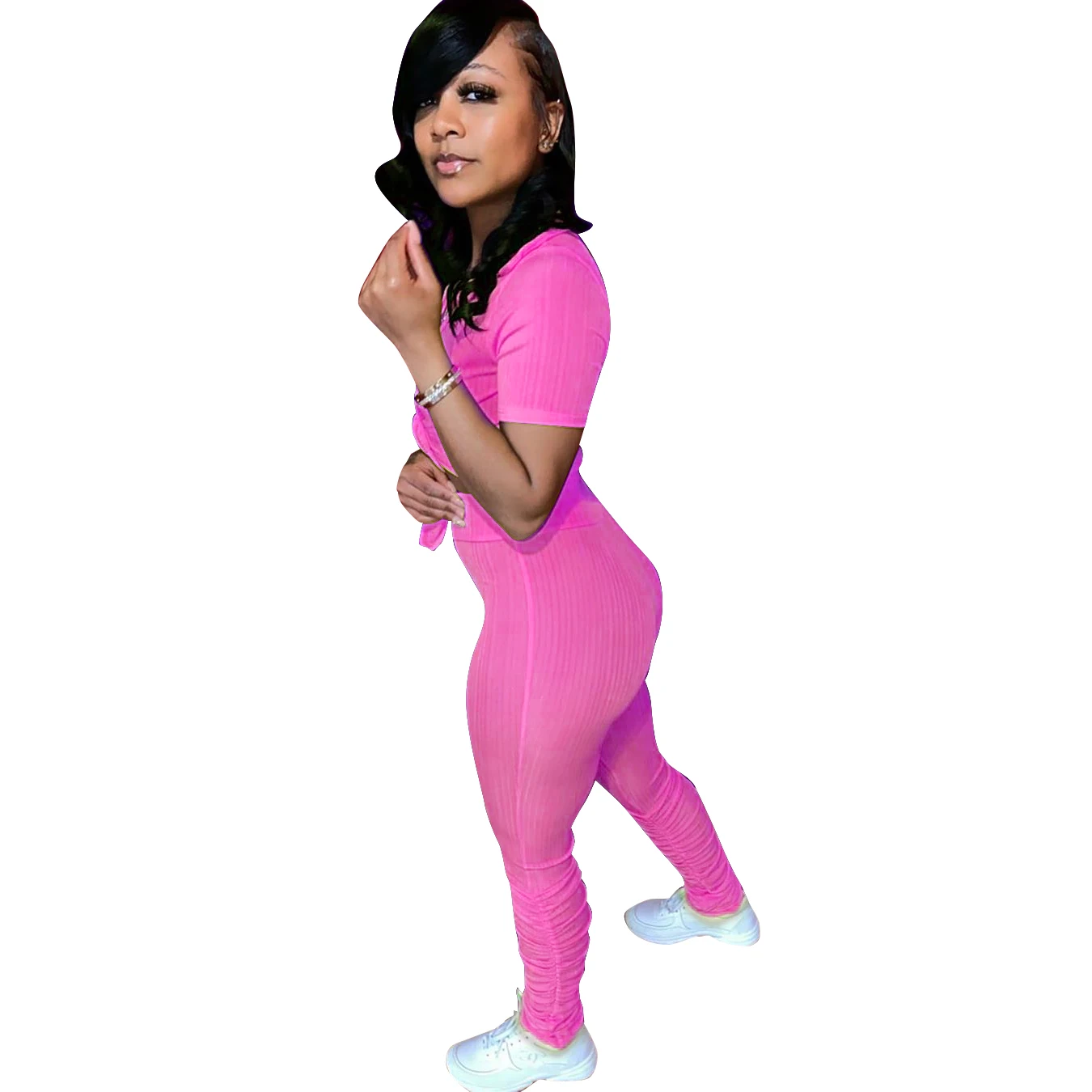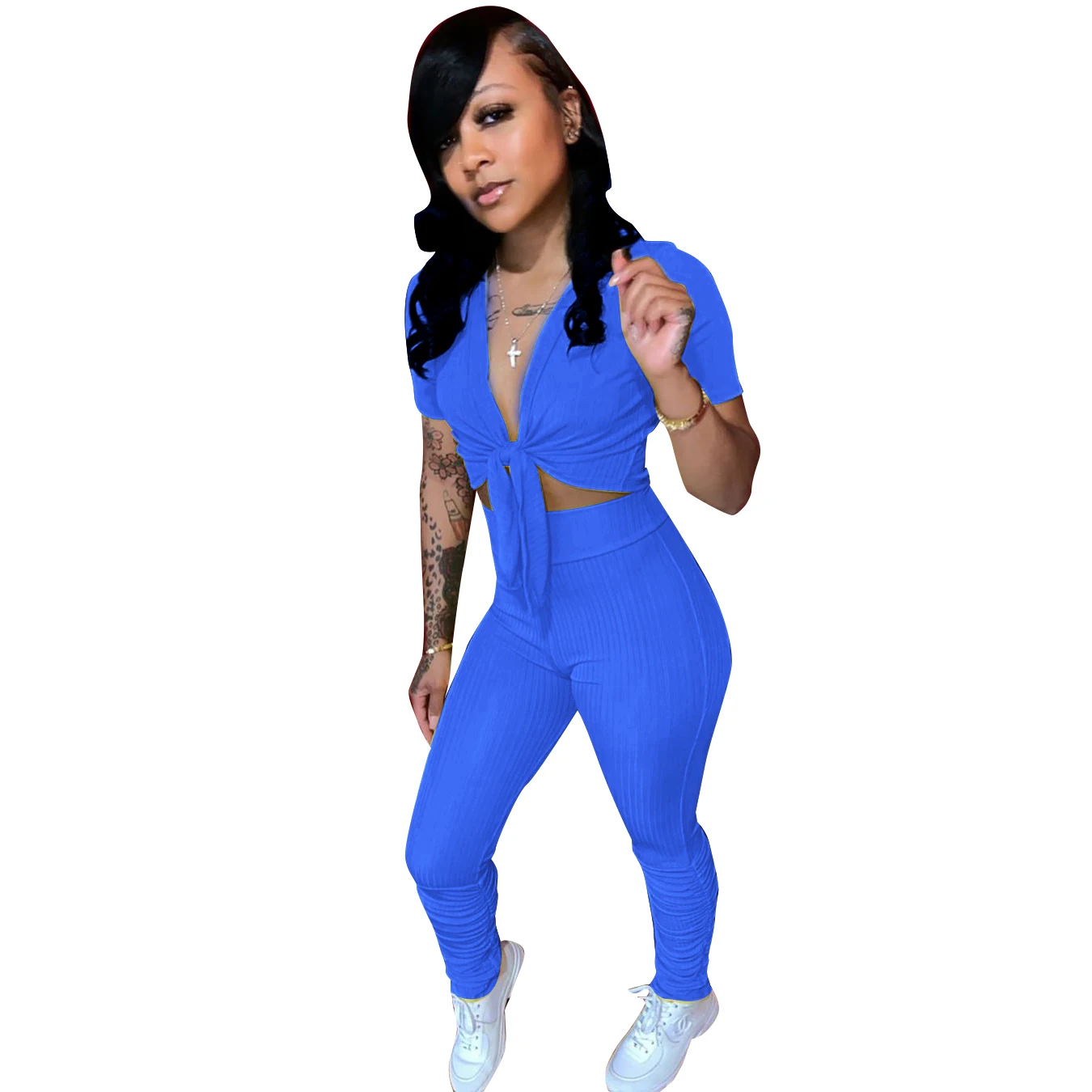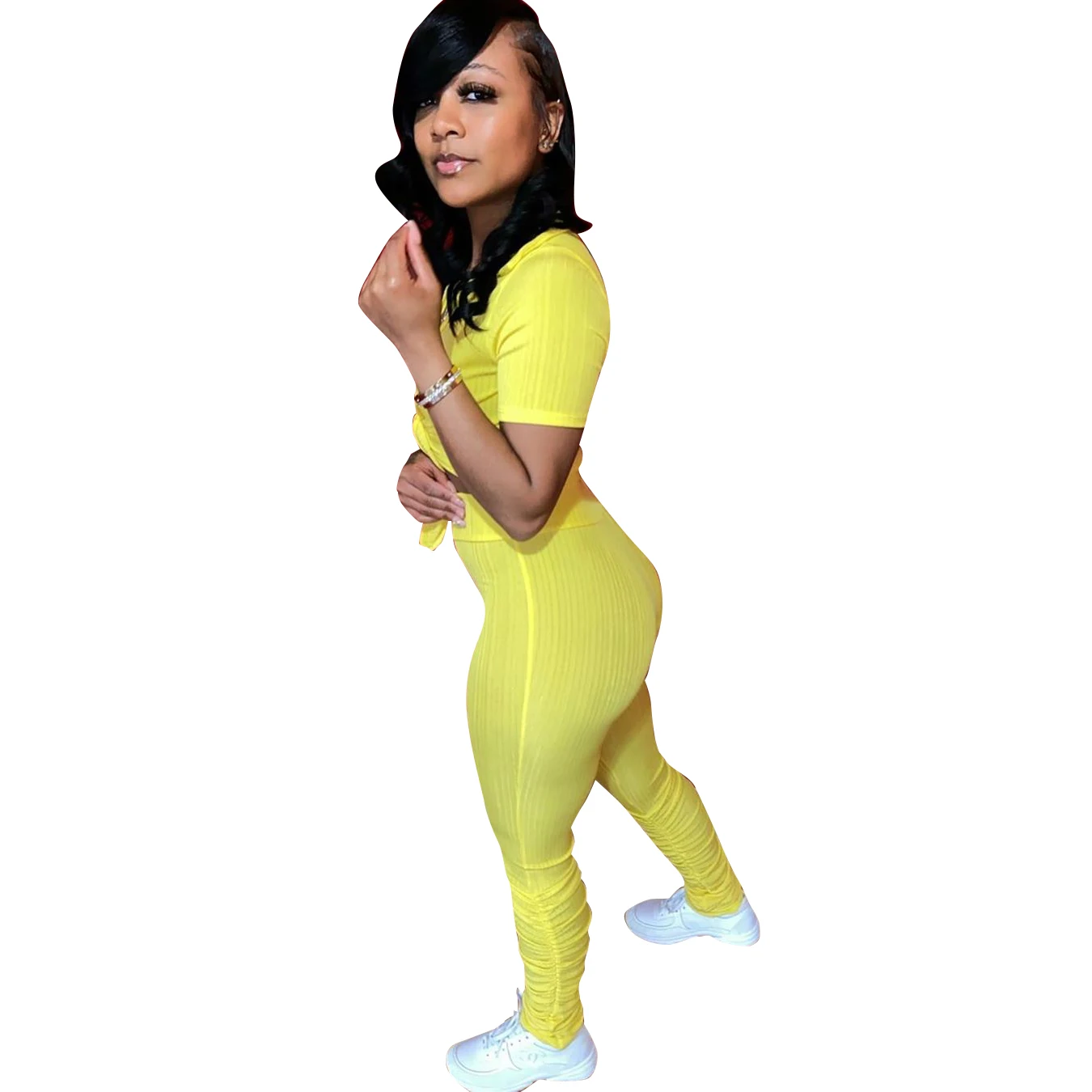 Women Two Pieces Sets Summer Tracksuits Short Sleeve Tie Up Crop Top Stacked Bell Bottom Ruched Pants Suit Fitness Outfits 2Pcs