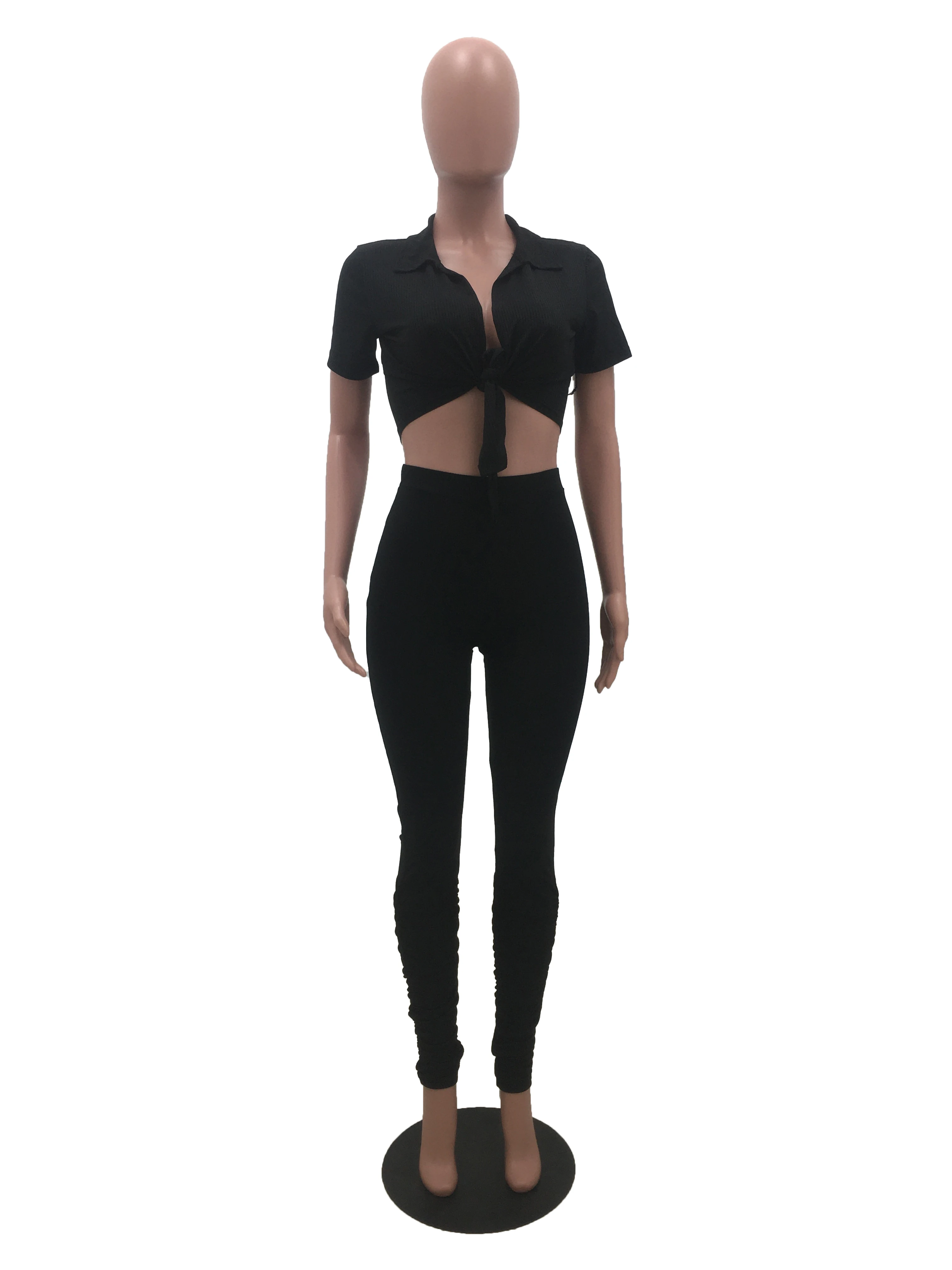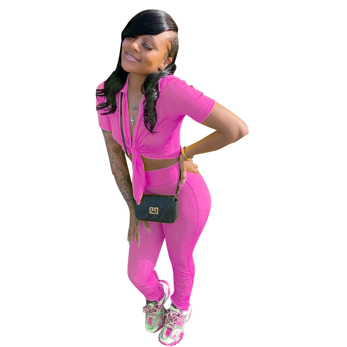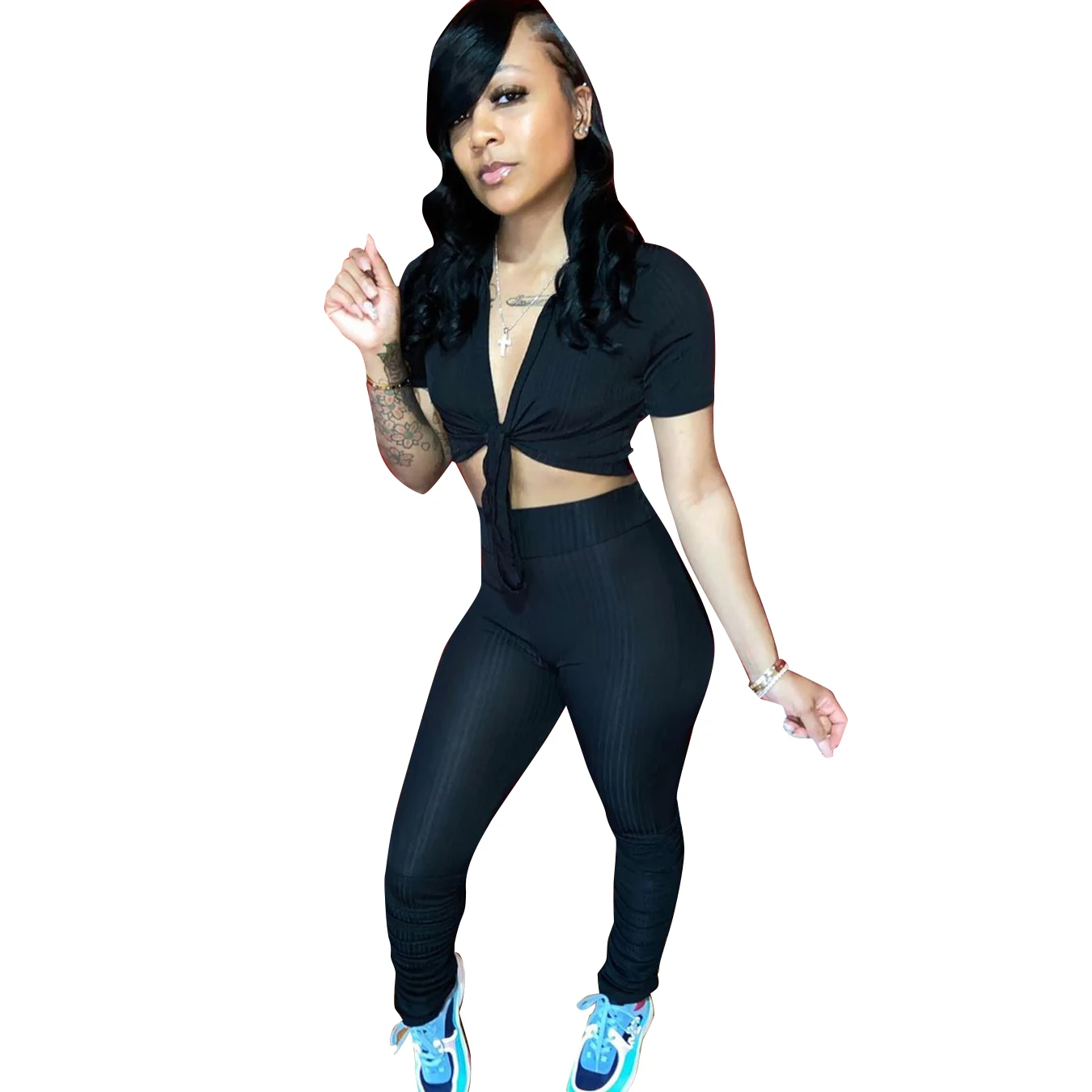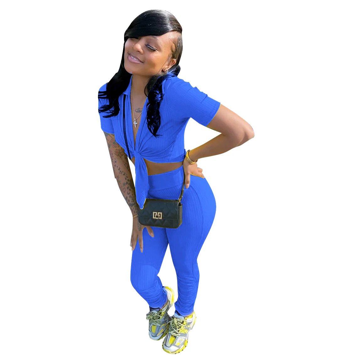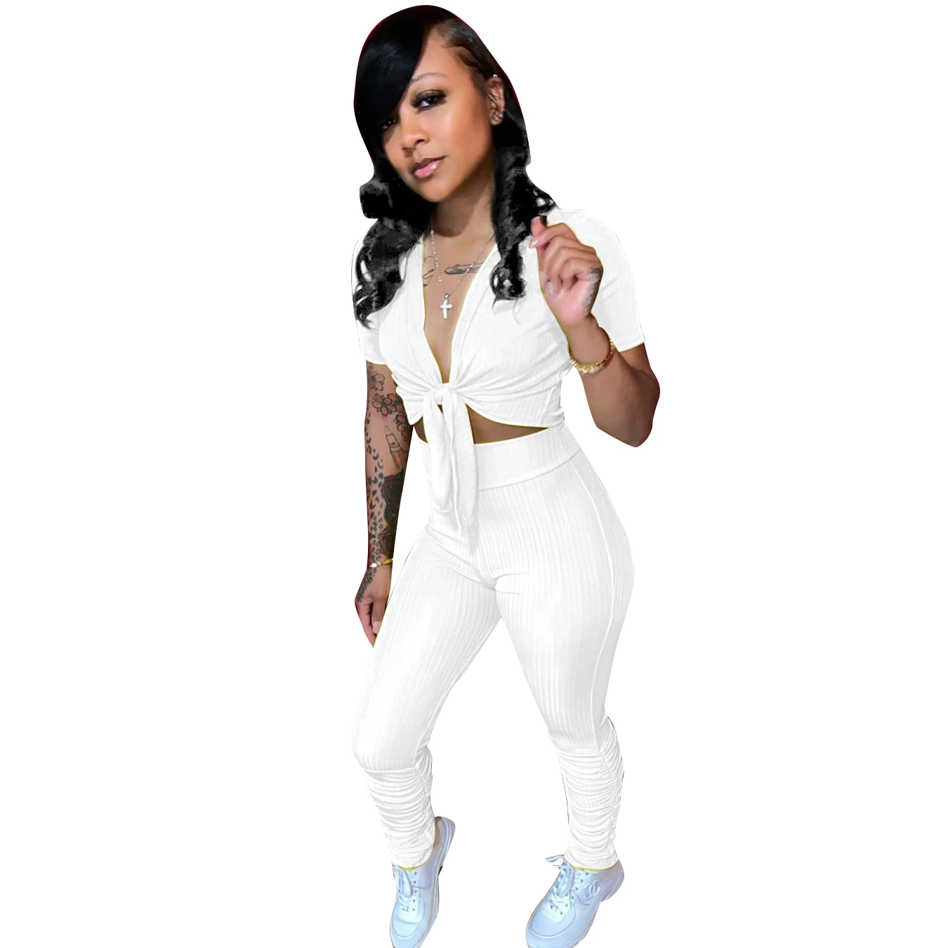 Women Two Pieces Sets Summer Tracksuits Short Sleeve Tie Up Crop Top Stacked Bell Bottom Ruched Pants Suit Fitness Outfits 2Pcs