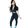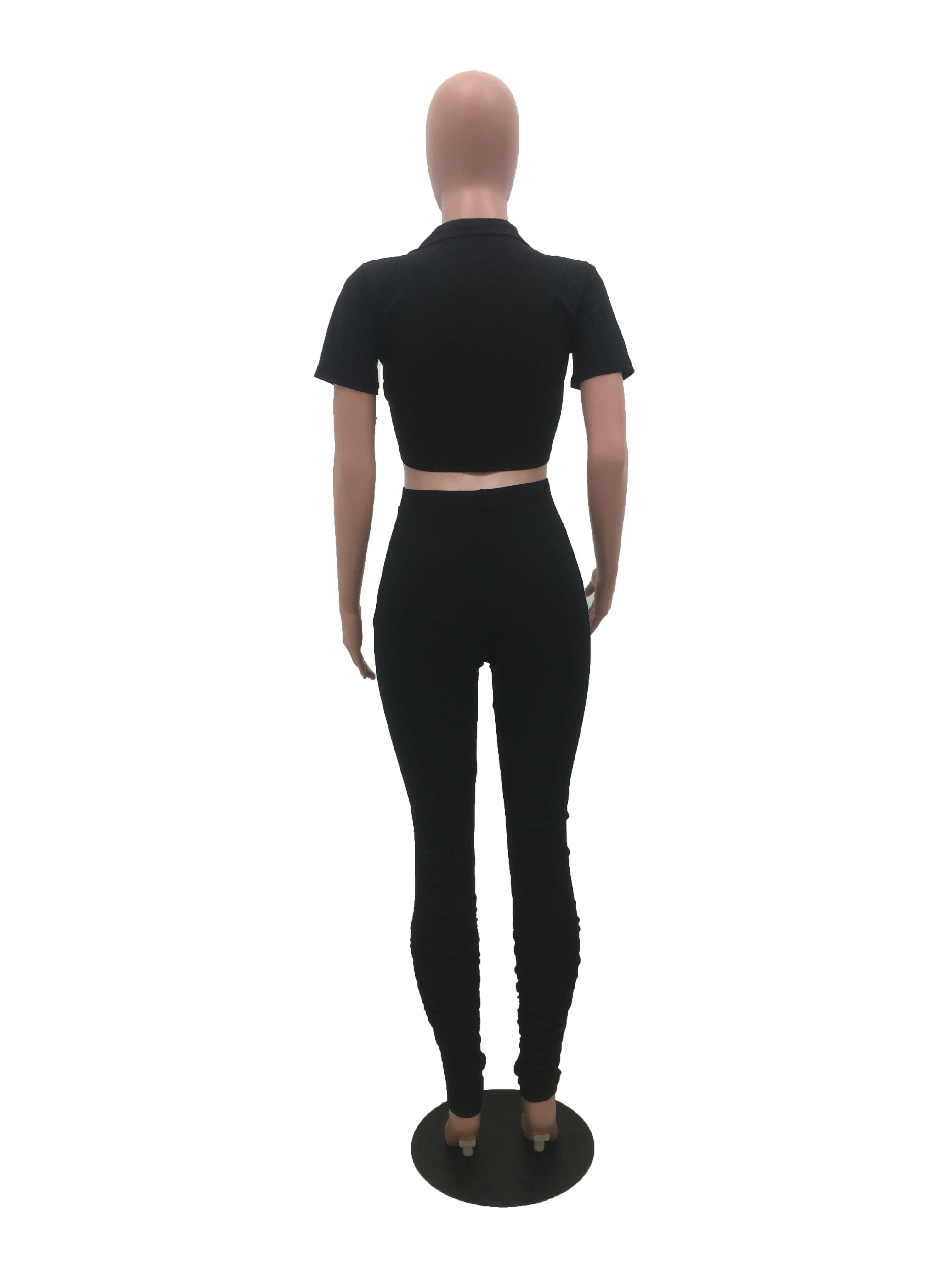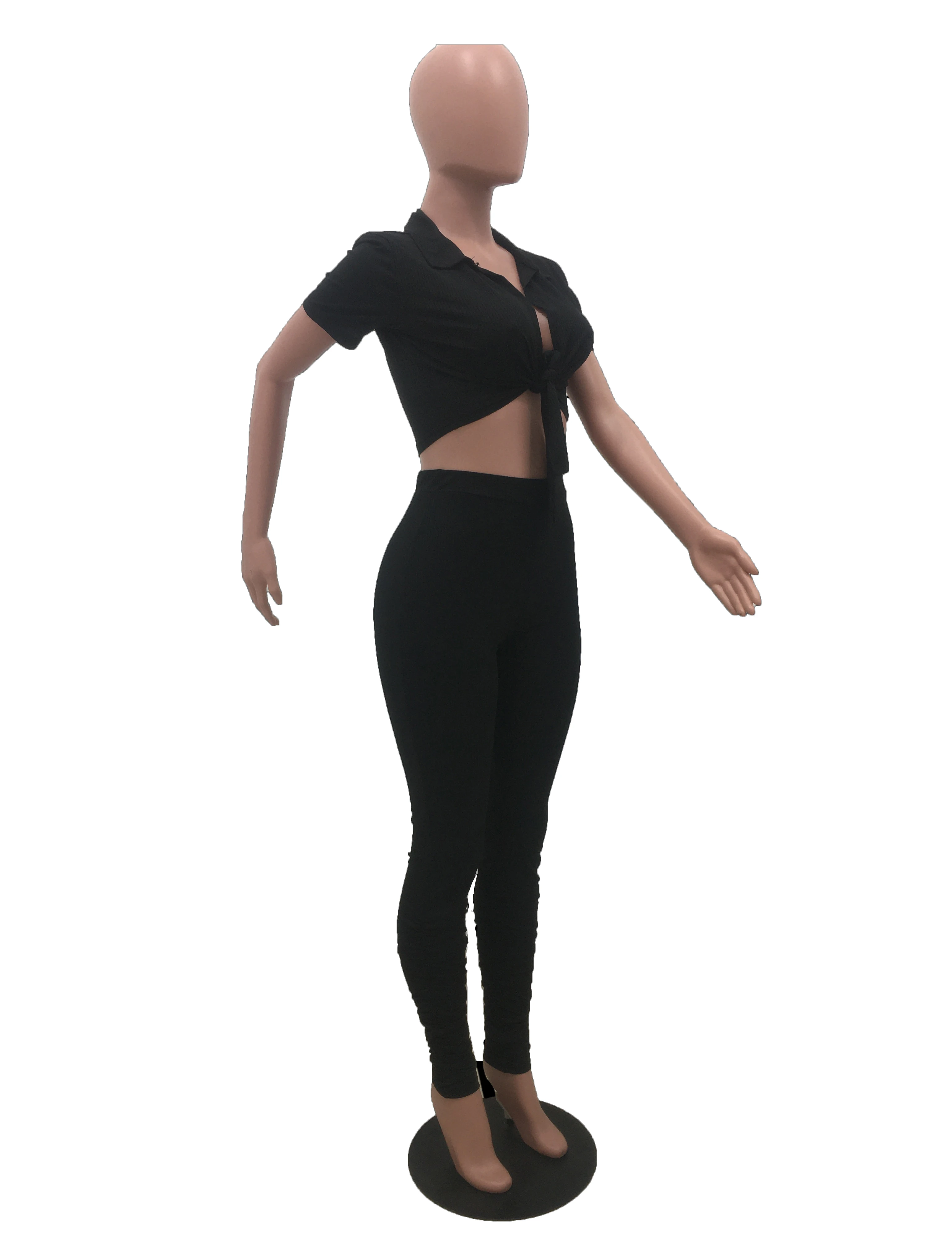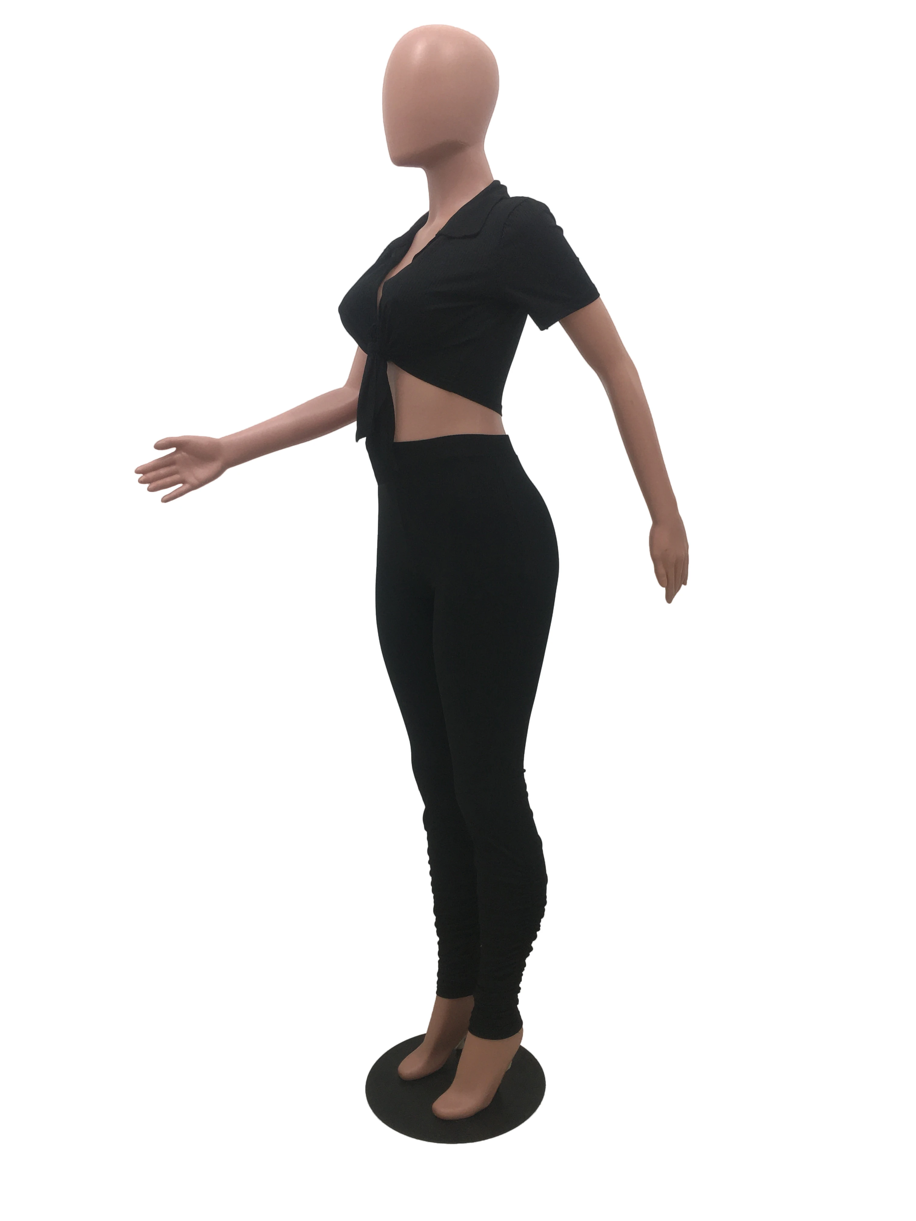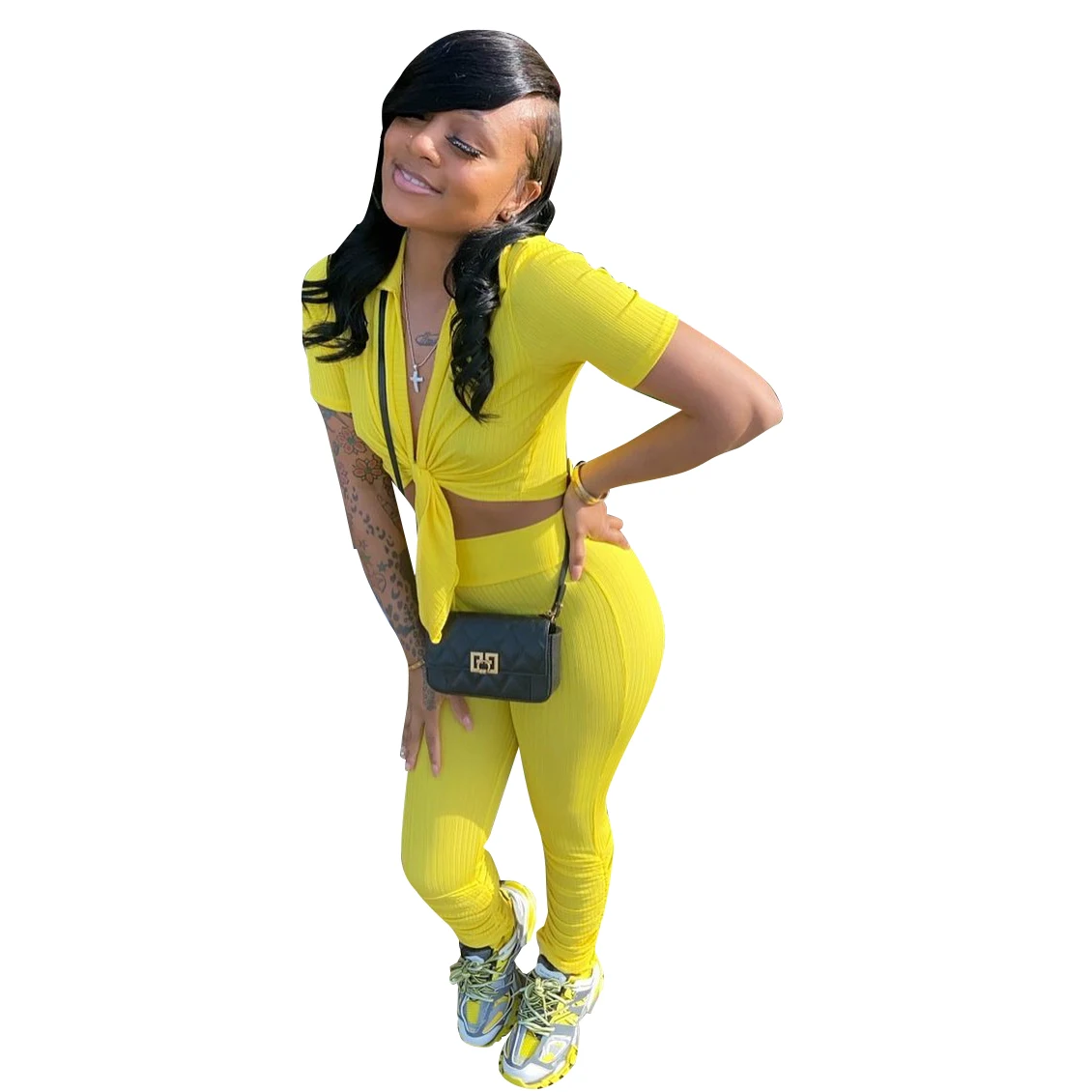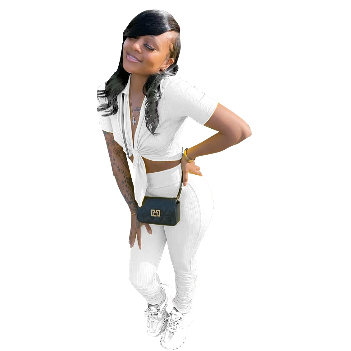 Women Two Pieces Sets Summer Tracksuits Short Sleeve Tie Up Crop Top Stacked Bell Bottom Ruched Pants Suit Fitness Outfits 2Pcs