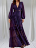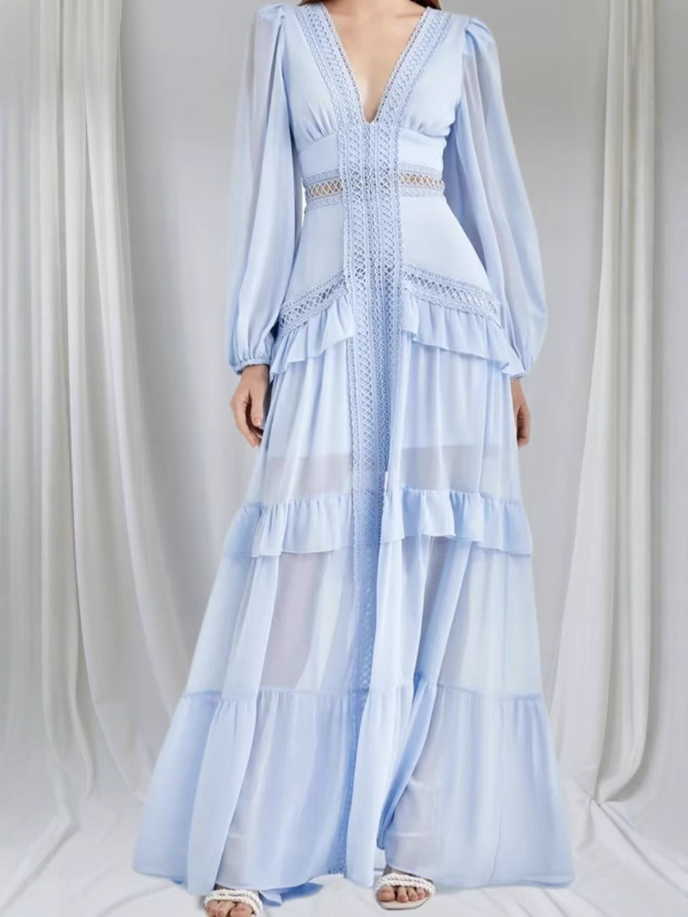 Women V-neck Lantern Sleeve Solid Ruffles Patchwork Long Maxi Dress Summer Spring Beach Holiday Party Street Vestidos Sexy Dress